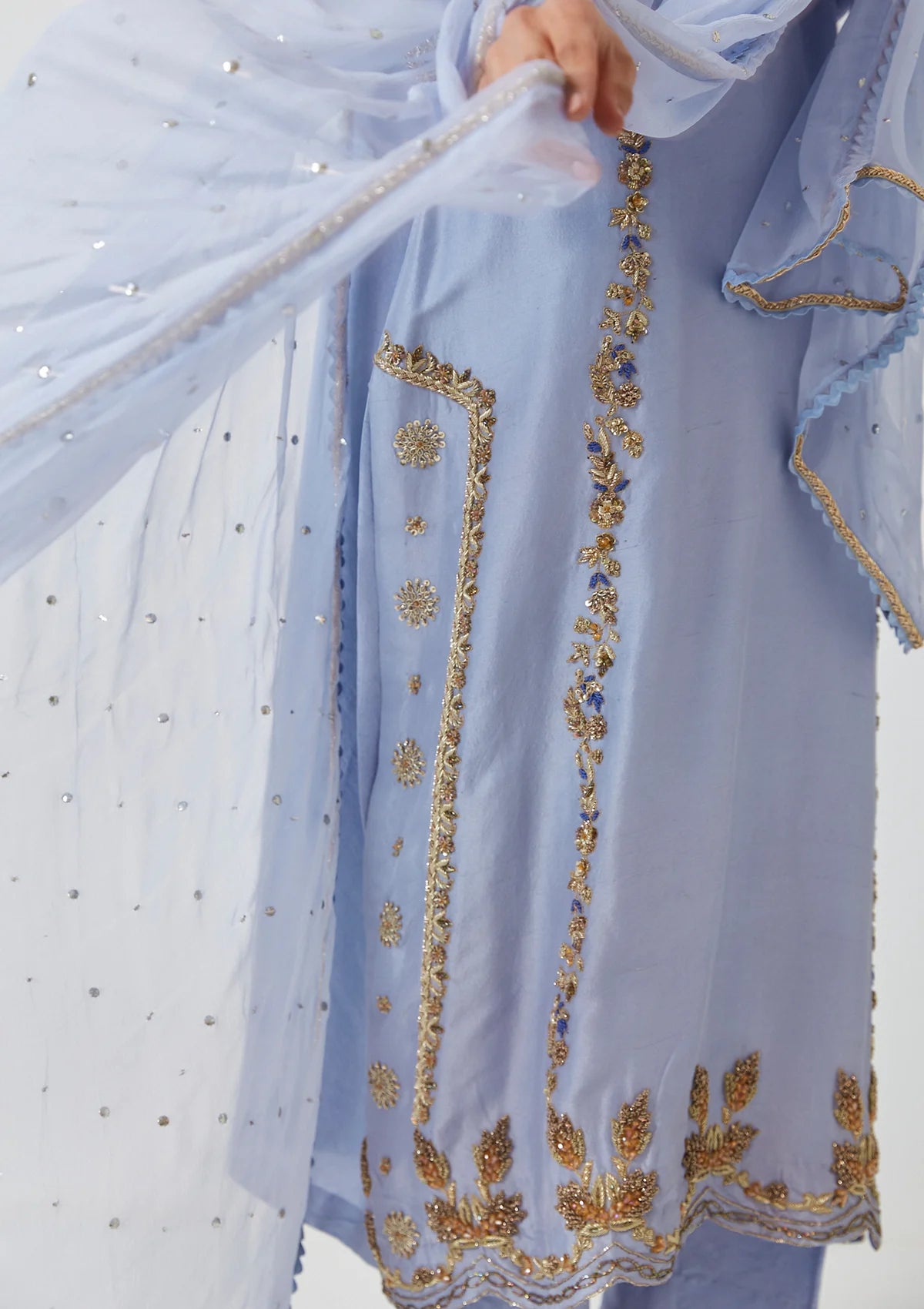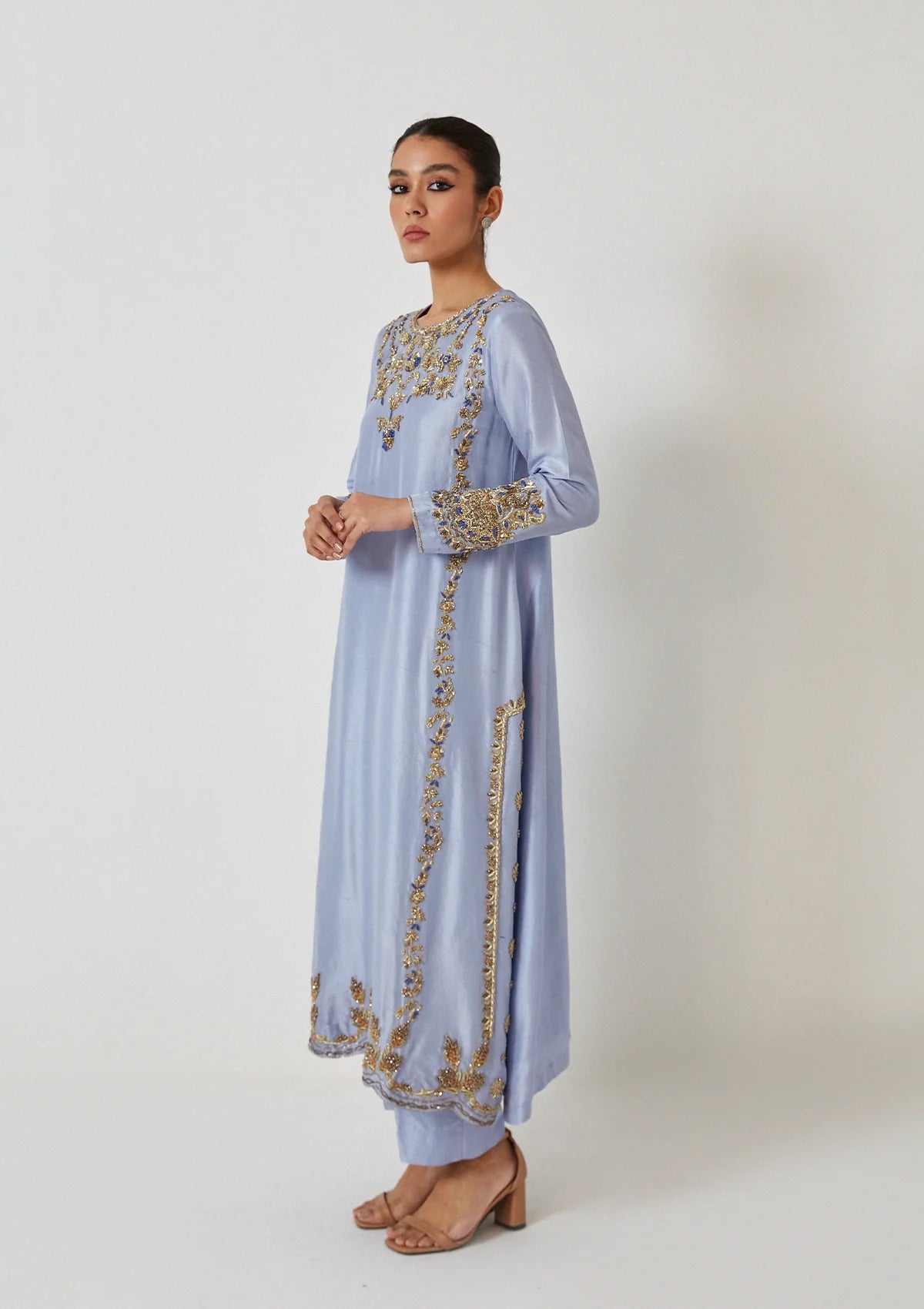 Crafted on 80g pure raw silk, Sai comes as a three-piece outfit on ice-blue shade. The shirt is embellished in shades of gold with a darker blue thread-work, pants are plain while the duppatta is kamdaani on chiffon with lace finishing.