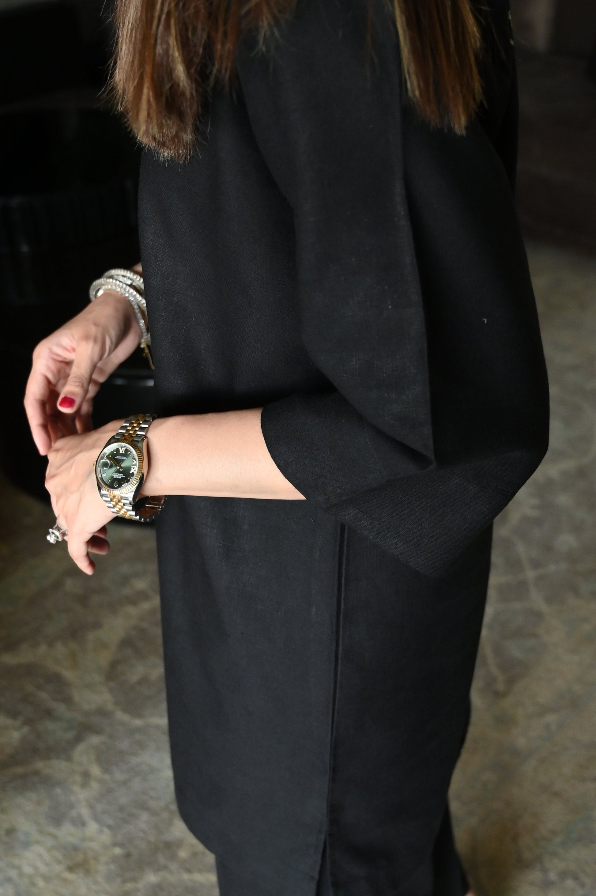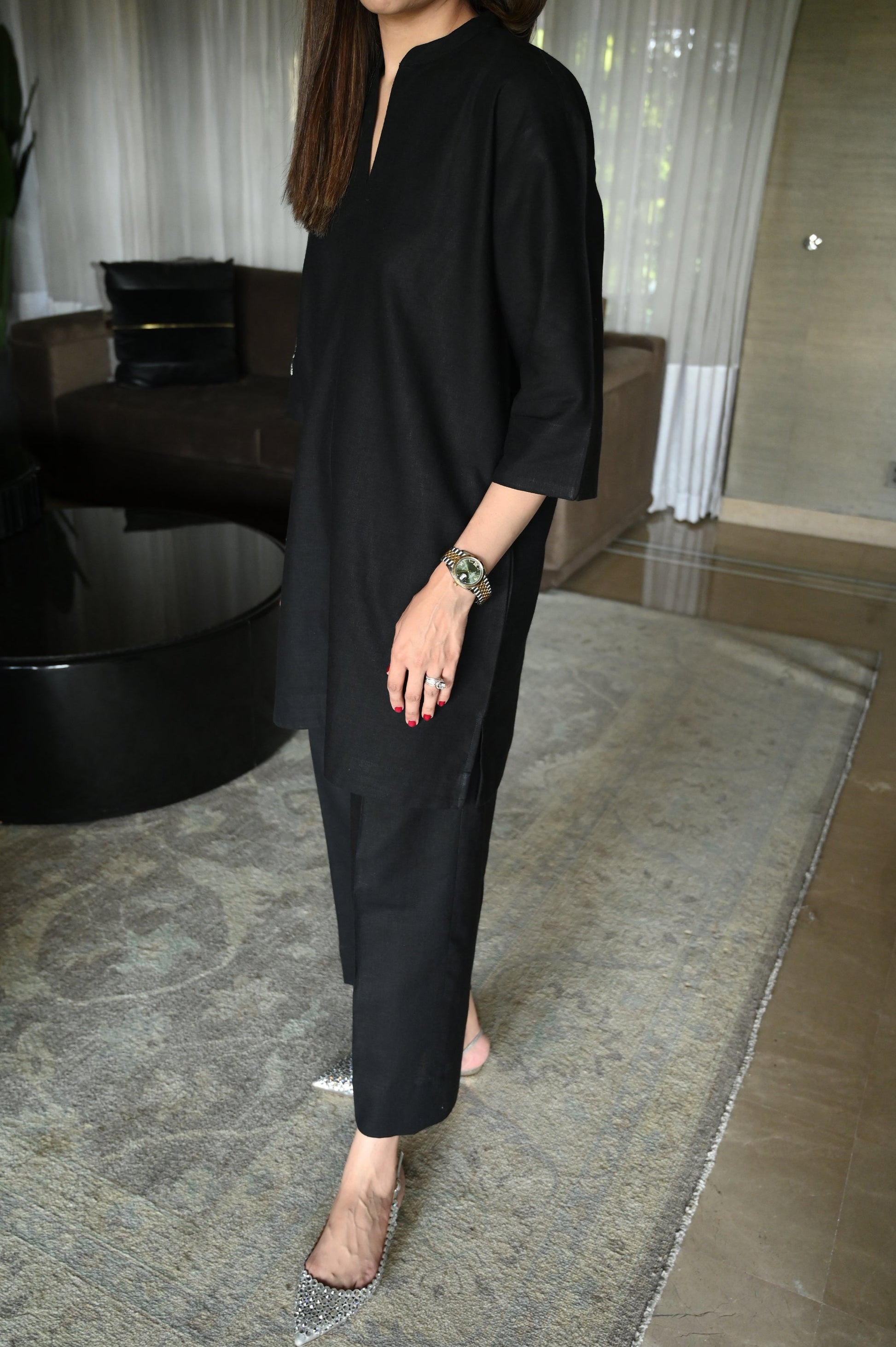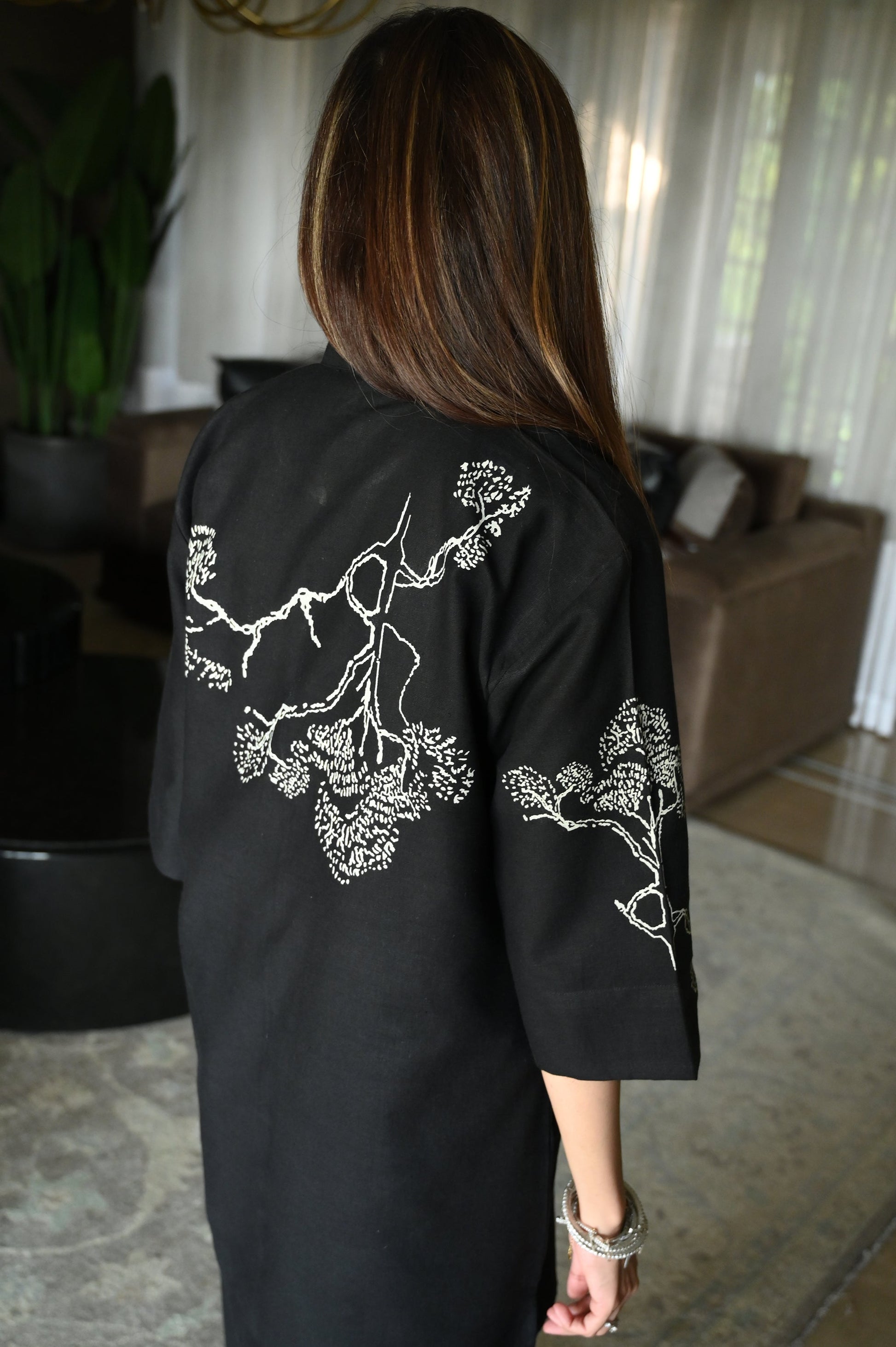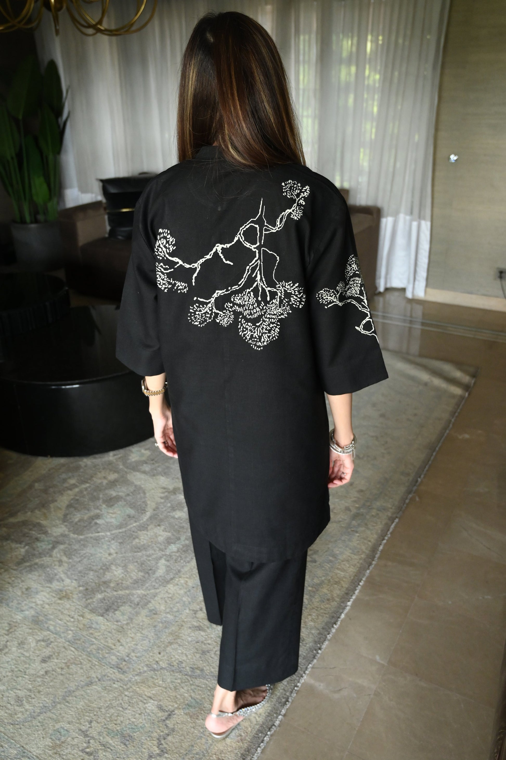 A black co-ord set featuring a straight kurta with intricate white printed botanical branch motifs on the back and sleeves. Paired with tailored straight trousers, this look exudes minimal elegance with a touch of artistic detail.