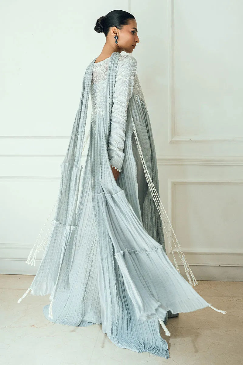 Salomi features an anchor-thread and pearl-work bodice on both front and back, with embellished sleeves and crushed chiffon panels in front and back. Handmade pearl danglings along the sleeves and sides complete this full ensemble.