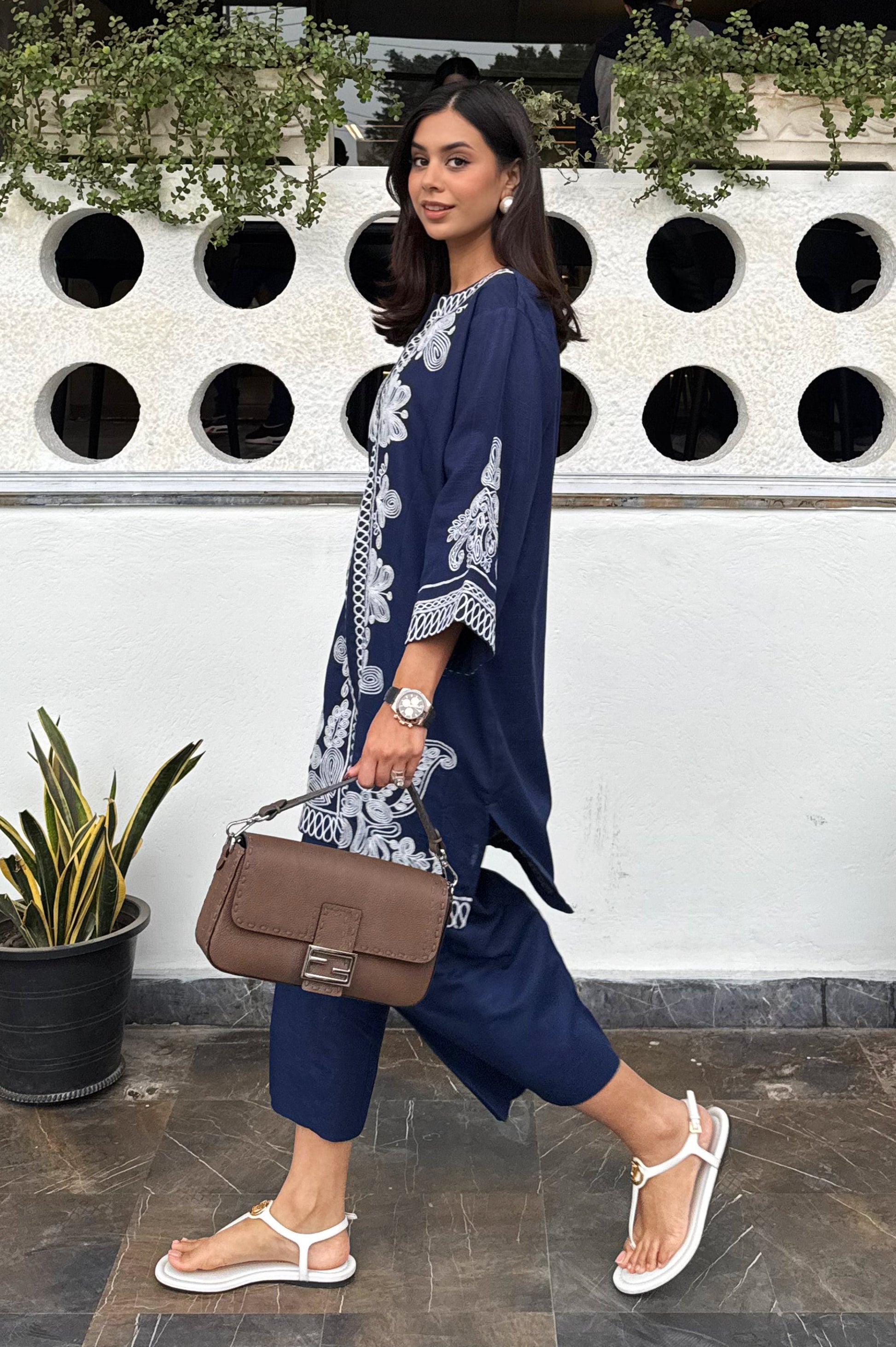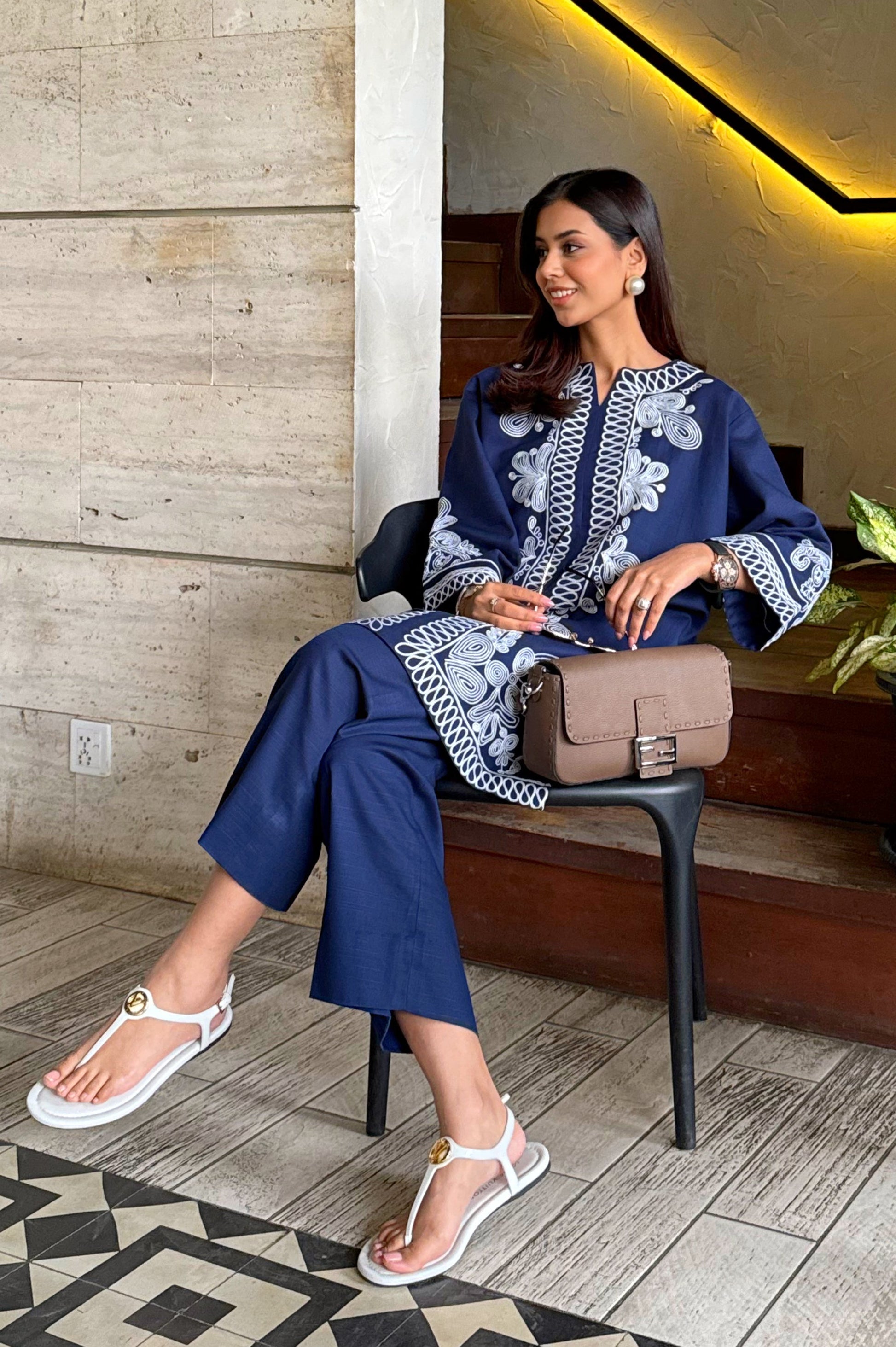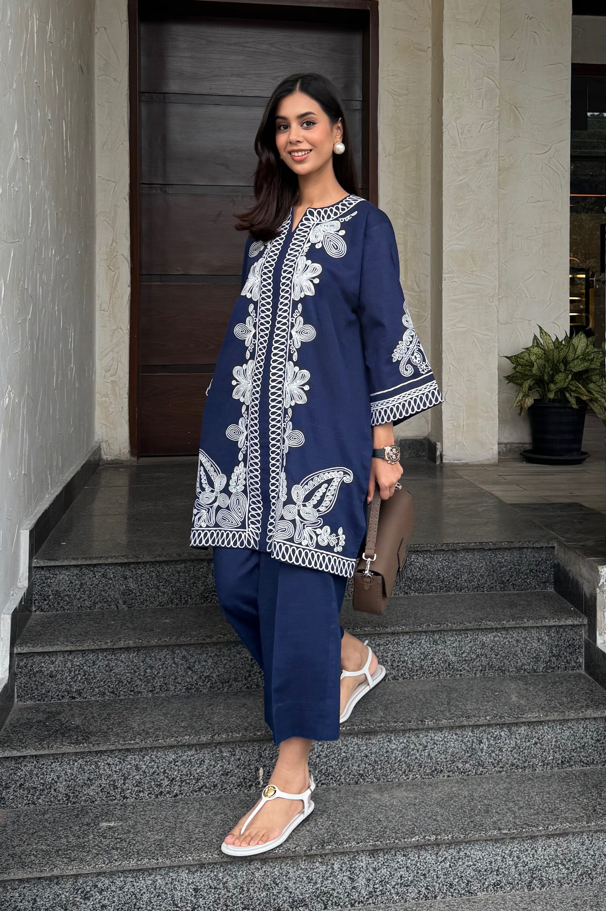 The Sapphire Set is made in breathable khaddar; the shirt features detailed white embroidery along the front, sleeves, and hem, creating a clean contrast against the deep blue base. The straight-cut silhouette keeps it comfortable and easy to wear, while the embroidery adds a polished look. Paired with matching straight trousers, this set works well for casual outings, workdays, or daytime gatherings.