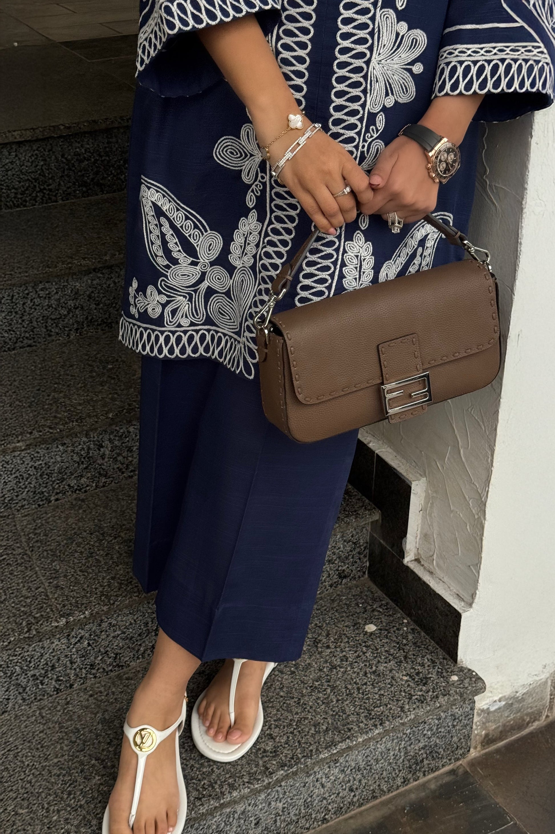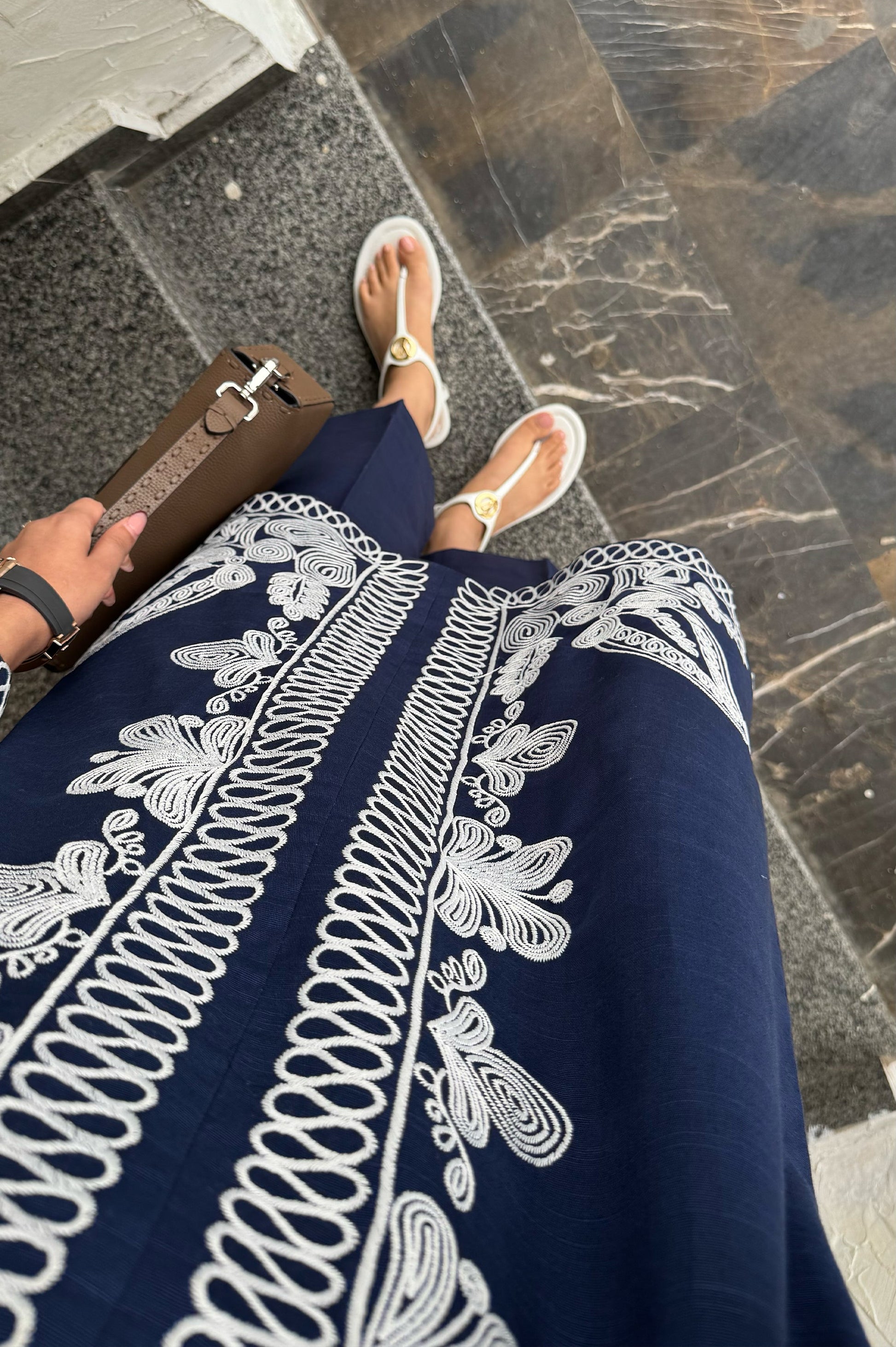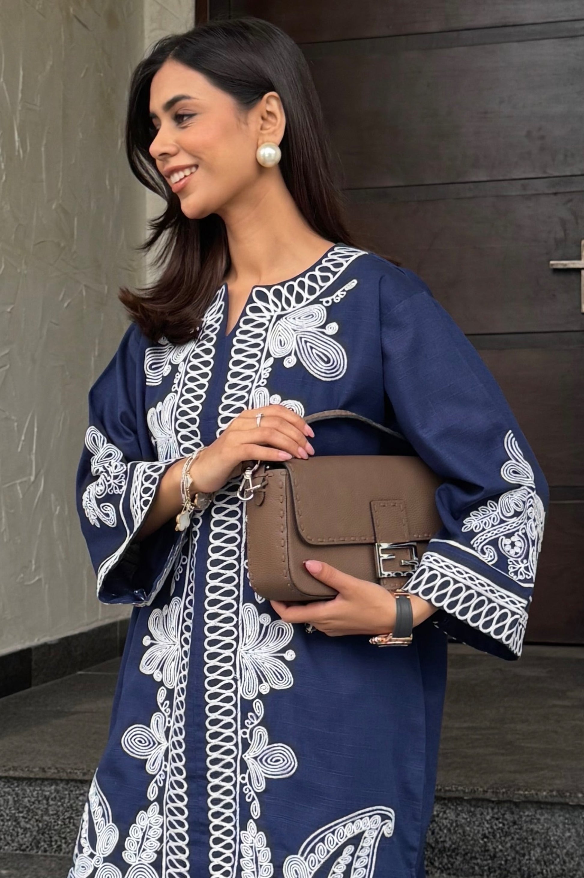 The Sapphire Set is made in breathable khaddar; the shirt features detailed white embroidery along the front, sleeves, and hem, creating a clean contrast against the deep blue base. The straight-cut silhouette keeps it comfortable and easy to wear, while the embroidery adds a polished look. Paired with matching straight trousers, this set works well for casual outings, workdays, or daytime gatherings.