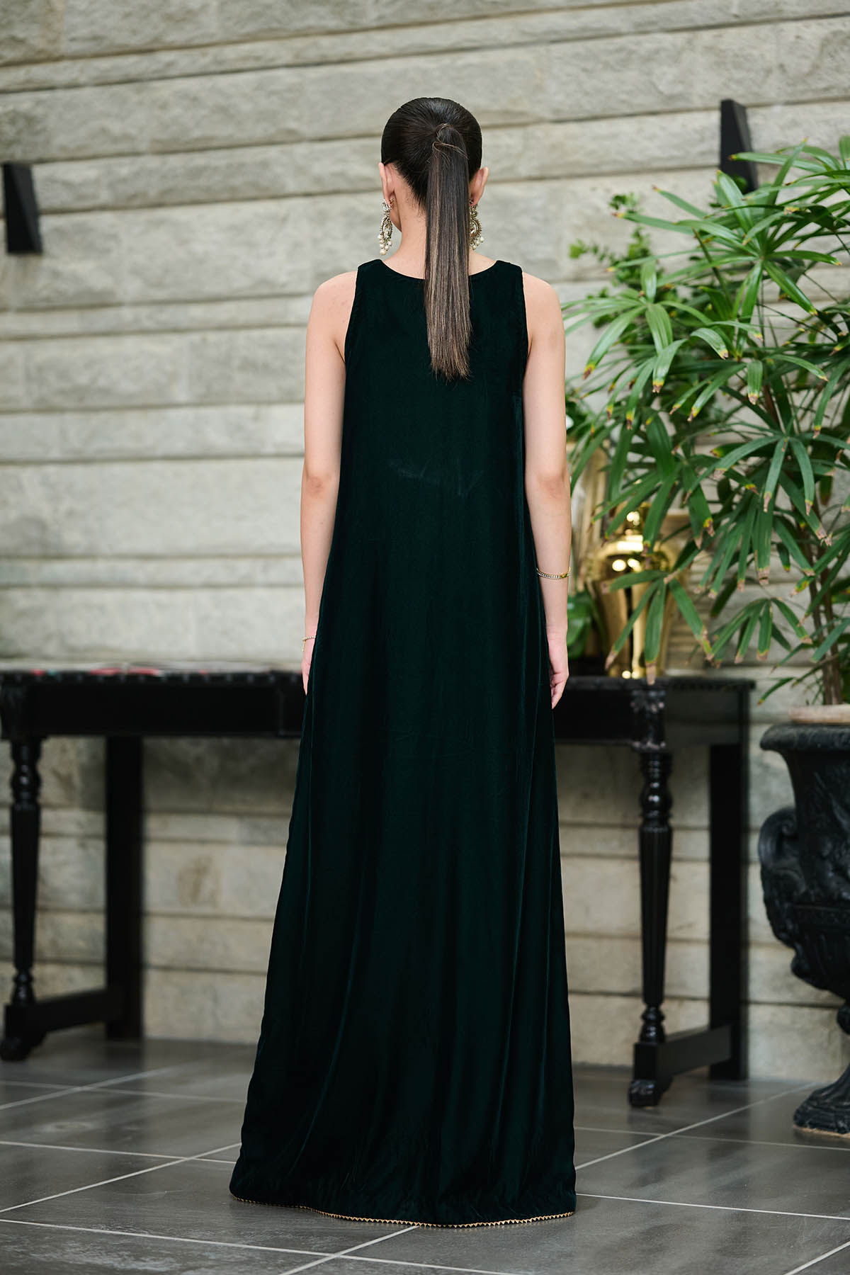 A beautiful flowing angrakha in bottle green velvet with flowy pants. Hand worked Crystal motif with gold lace detailing all over. Full Sleeves with gold lace trimming can be added upon request. Silk dupatta in included.