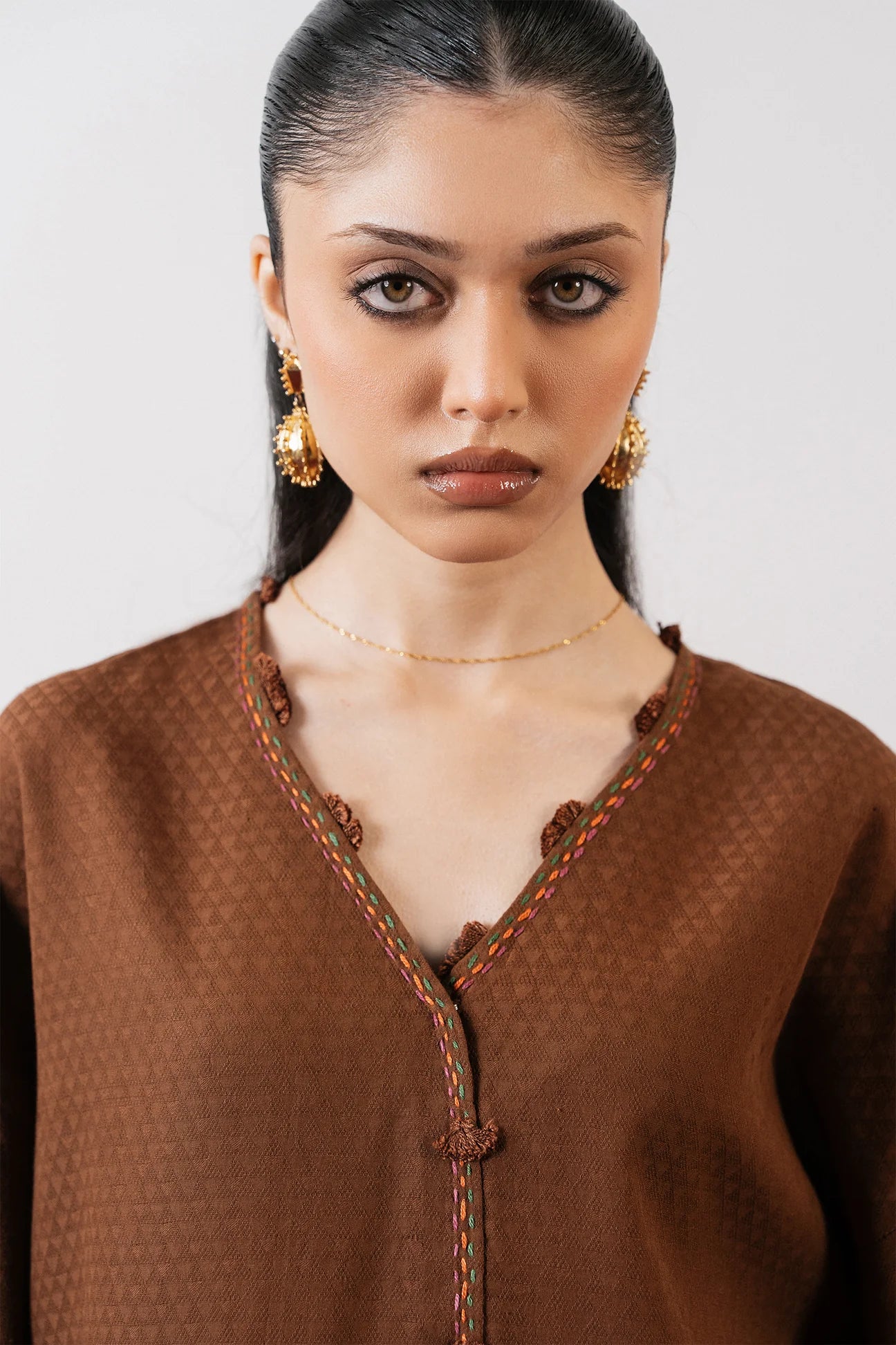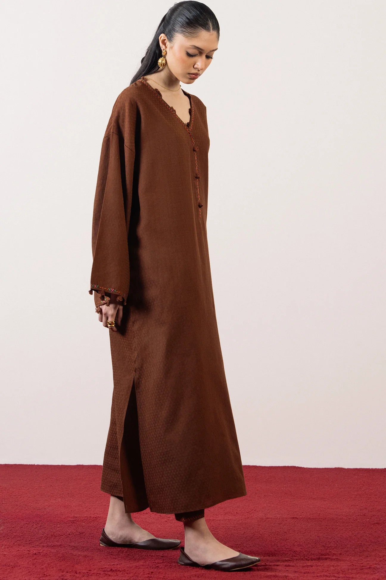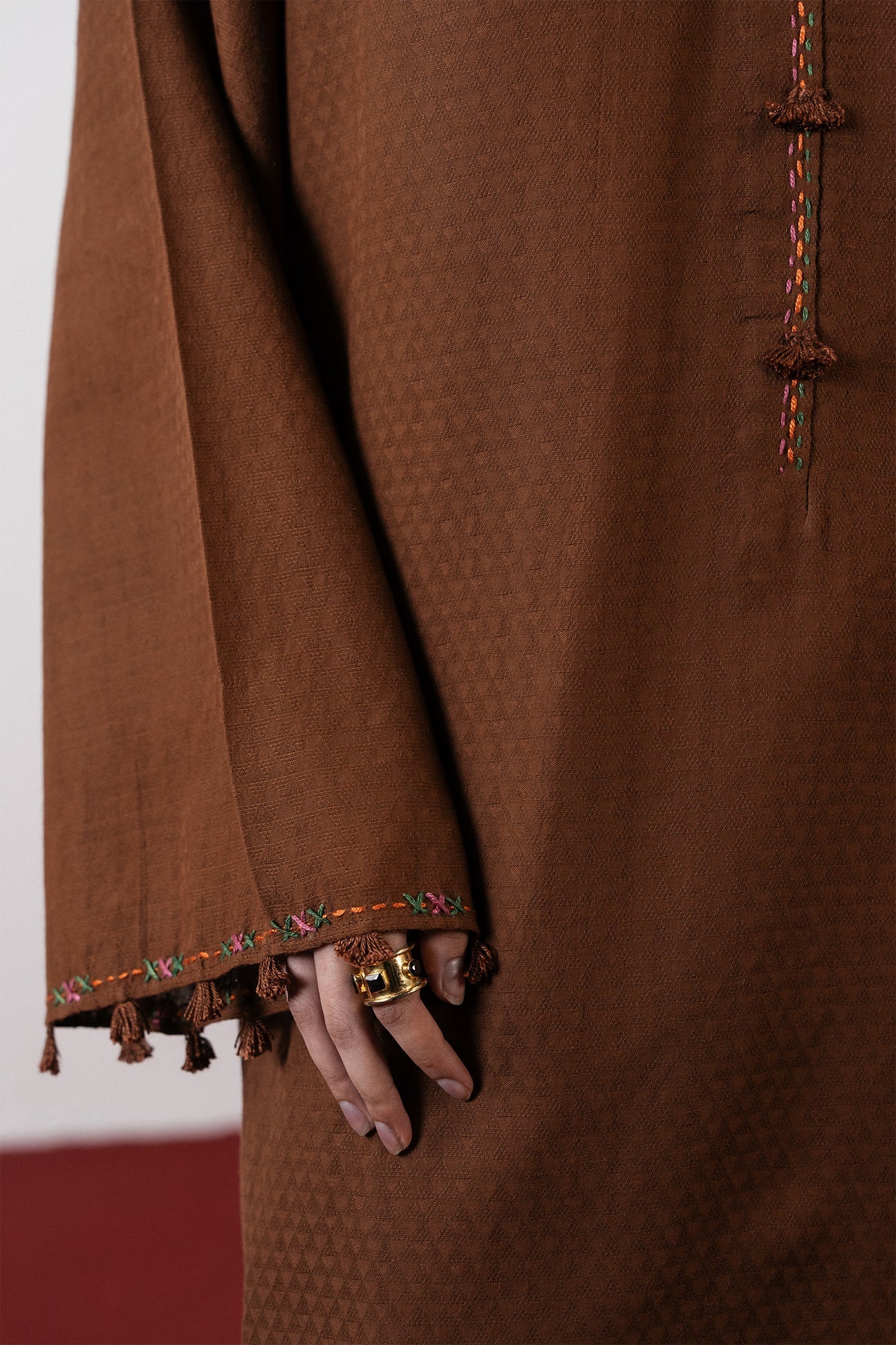 SÉRA — chocolate brown jacquard in a long, flowing silhouette. Tassels and delicate hand-stitching add subtle depth to winter-ready elegance.
