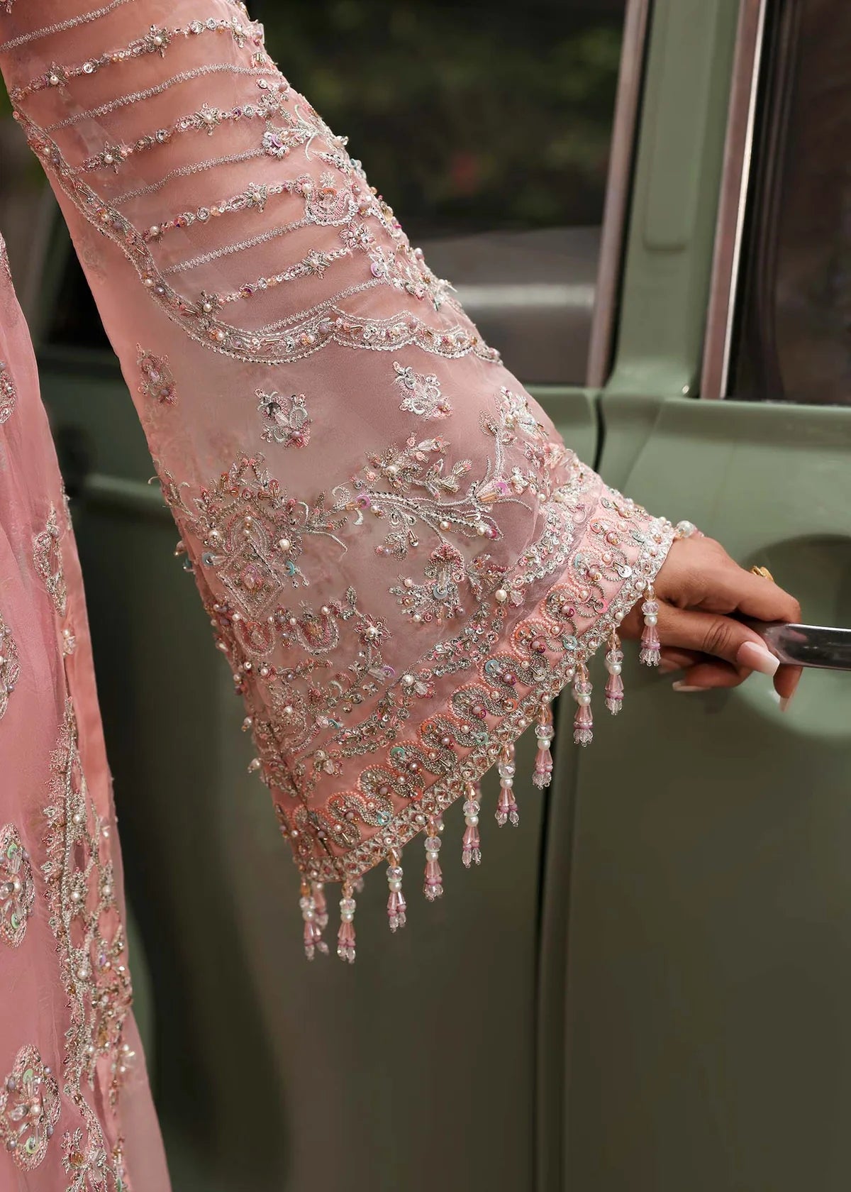 Delicate and graceful, this ethereal blush rose ensemble is a vision of timeless beauty. The shirt is adorned with geometric embroidery and hand-embellished organza panels, framed by intricately worked borders that add refined charm. The statement dupatta, detailed with laser-embroidered pallus and laser-cut patches, drapes effortlessly, making it the centerpiece of the design. Paired with a screen-printed trouser and dyed inner, the look balances tradition with modern artistry. Subtle sequin spray and intricate adda work bring a touch of radiance, completing an ensemble that celebrates elegance in every detail.