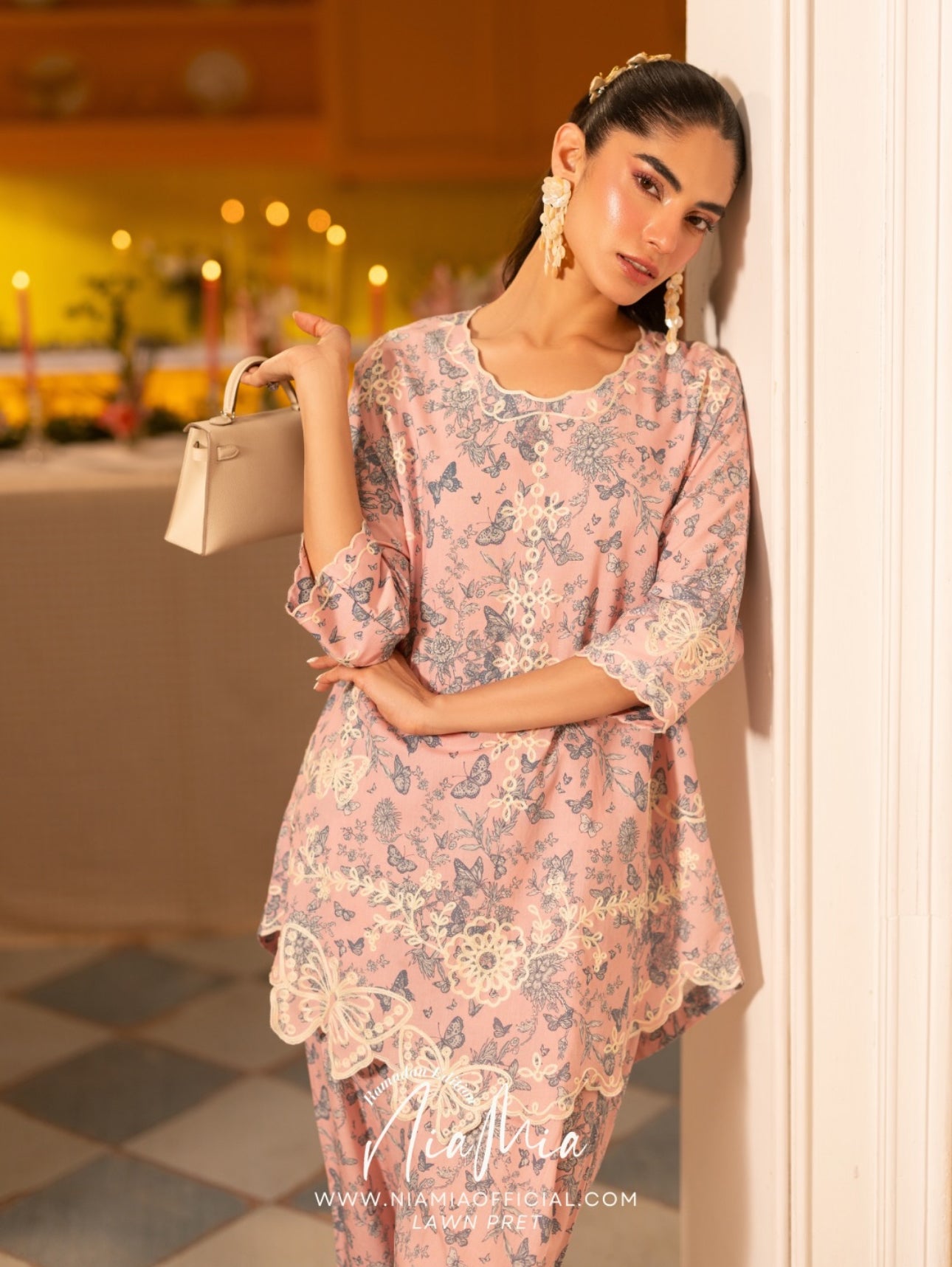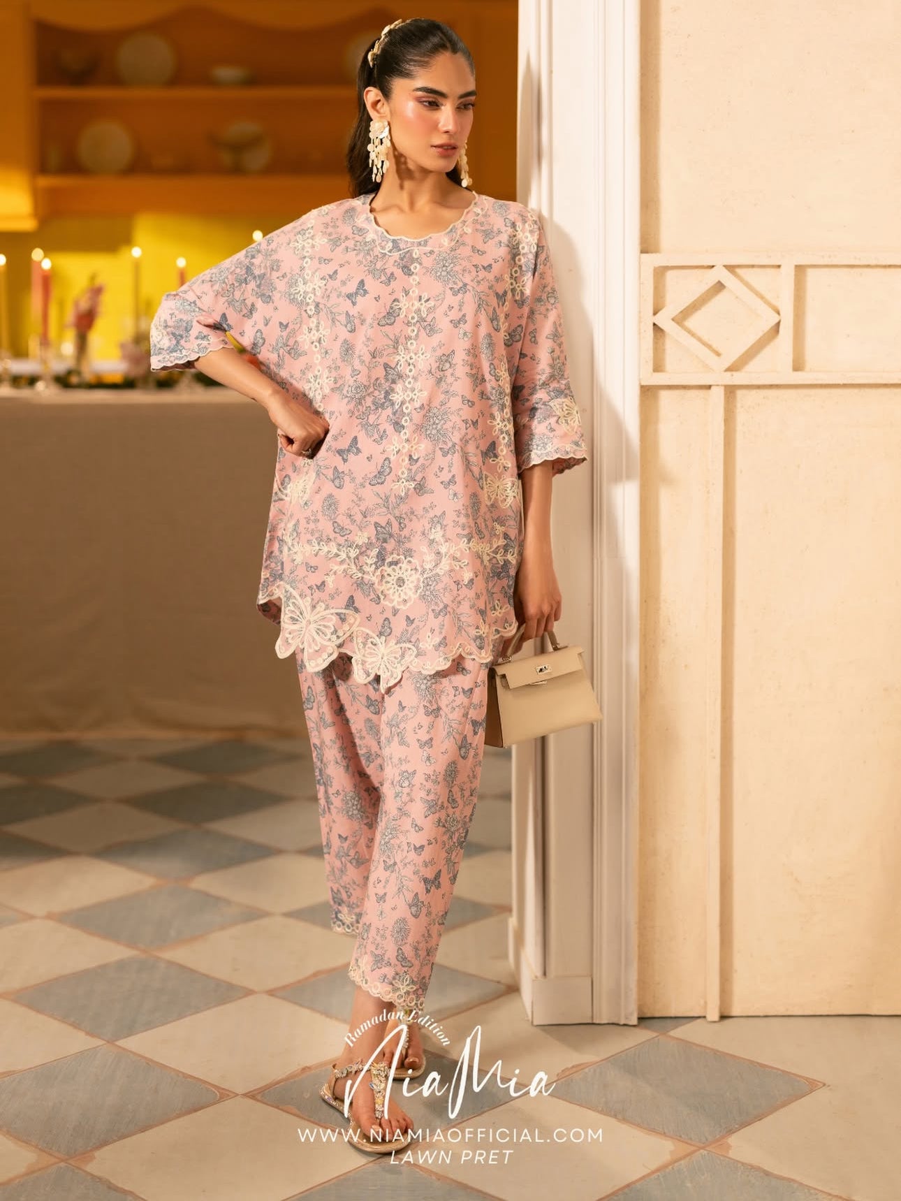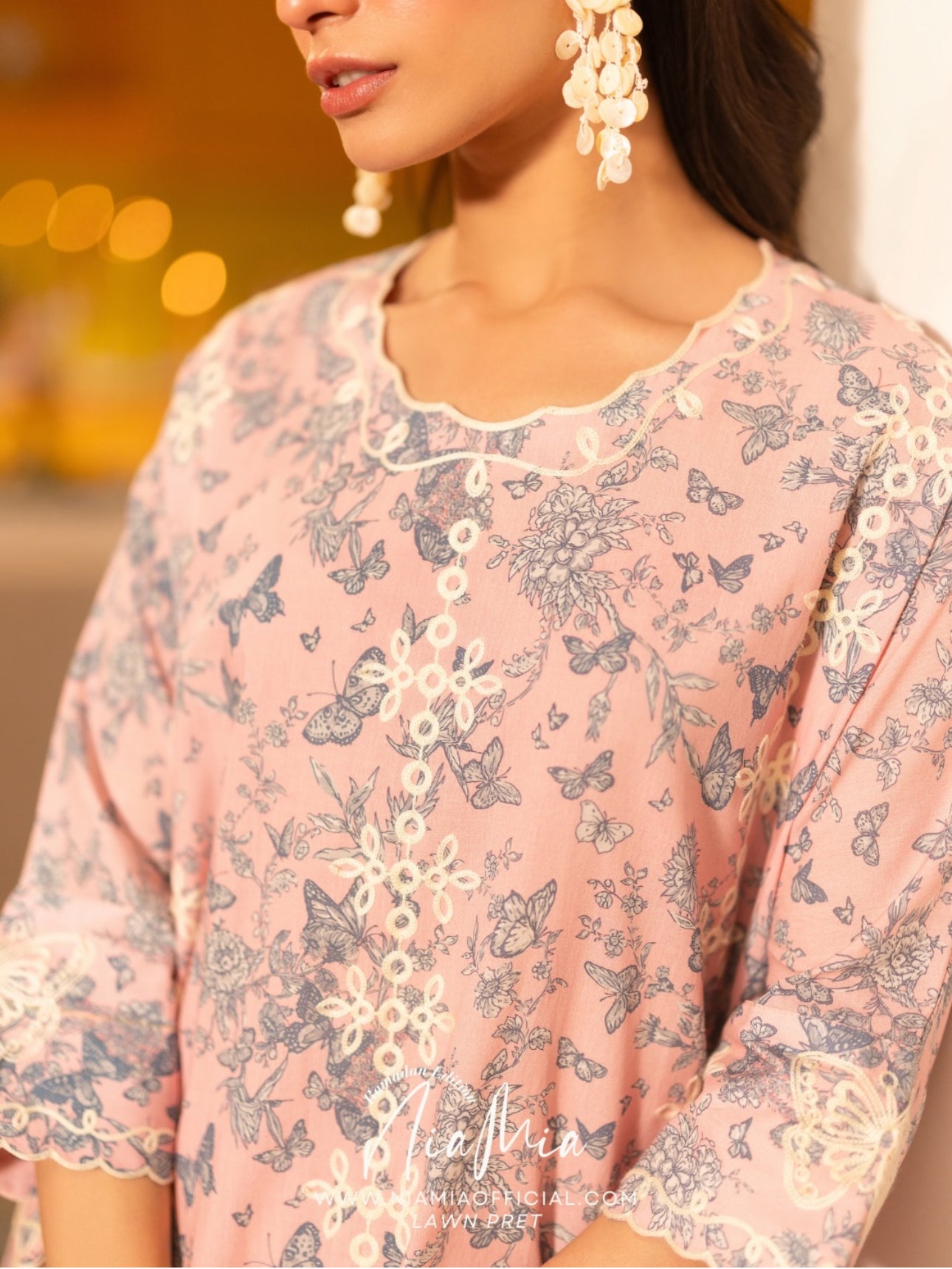 Shortbread is crafted in lawn with an all-over butterfly print, brought to life with delicate white embroidery across the shirt. Fine embroidered detailing finishes the sleeves and shalwar edges, while butterfly-shaped embroidered cutwork along the shirt hem adds a distinctive, playful finish.