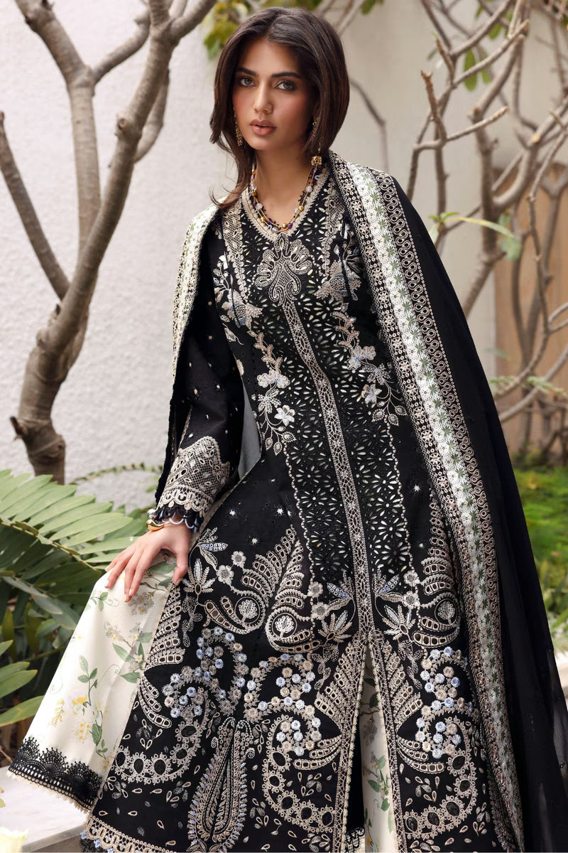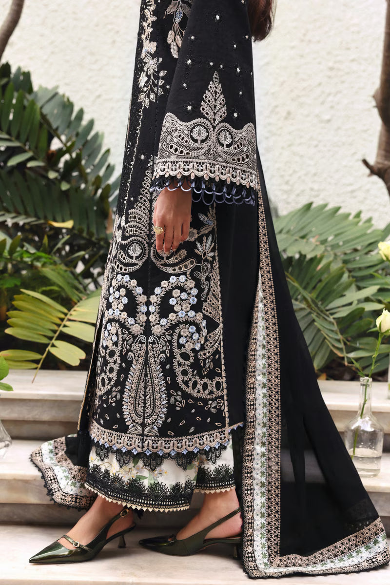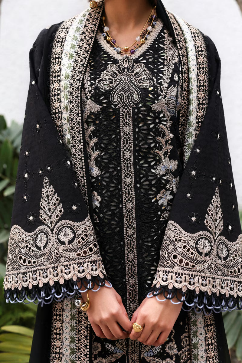 A new take on black for summer. Crafted with intricate cutwork jali and layered with printed patch details, Sienna brings depth, texture, and confidence into a season usually ruled by color. Paired with tropical printed pants and a light chiffon dupatta, the look feels bold, modern, and effortlessly refined.
