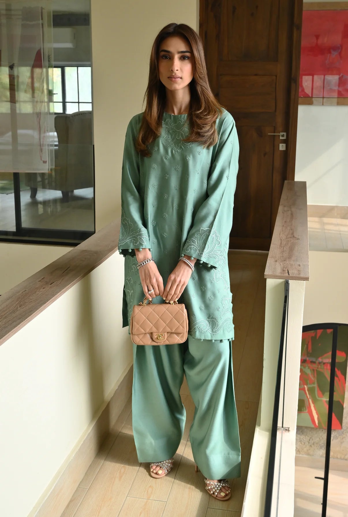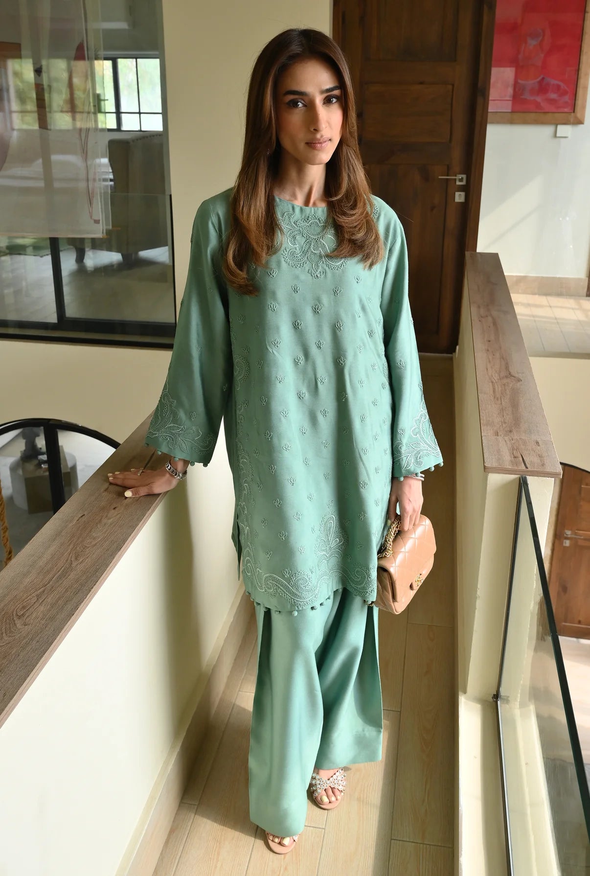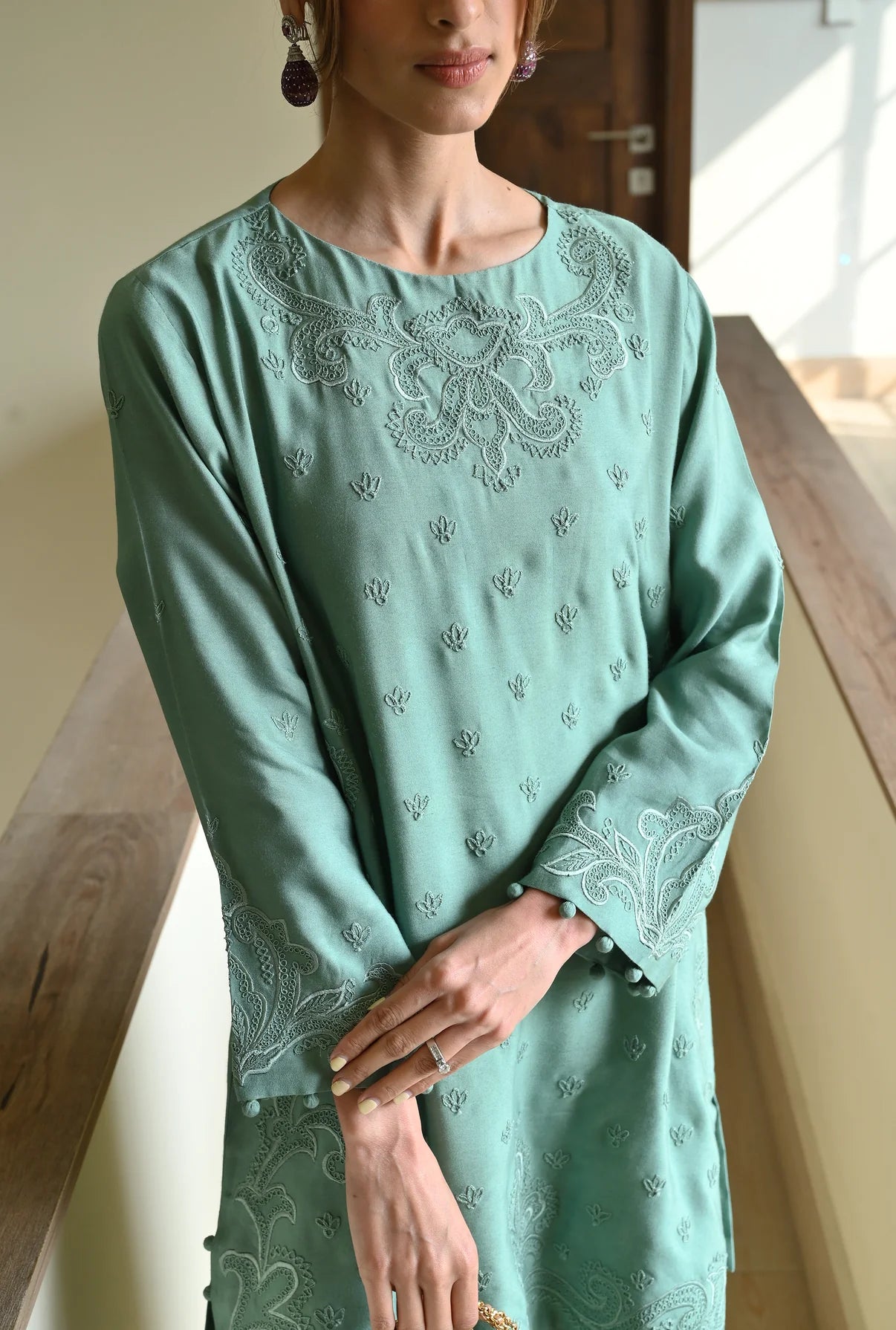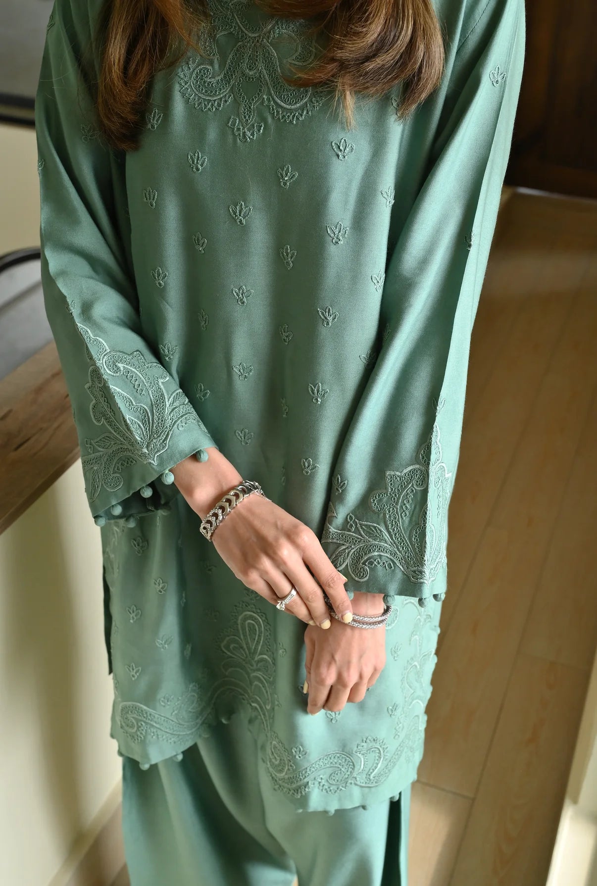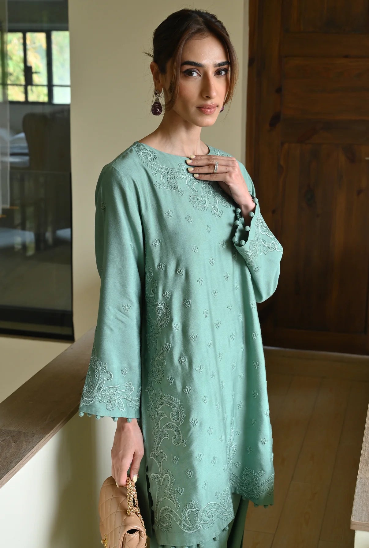 This 2-piece set comes in a soft mint green, made from Pure Kora Silk, which gives the outfit a rich, grainy texture and a natural structure. The shirt is covered in delicate tonal embroidery, featuring small floral motifs scattered across the front and more intricate, swirling patterns bordering the neckline and hem. The sleeves and hem are finished with Potli lace, adding a distinctive, elegant detail. For a traditional touch, it comes with a regular chic shalwar. The set is light, breathable, and designed for a coordinated & comfortable look.