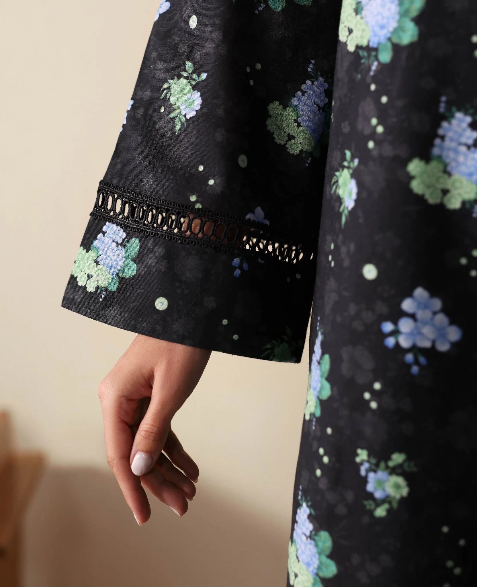 A black shirt adorned with vibrant lime and green florals, paired with matching floral trousers. The long shirt and beautifully detailed print create a striking, fresh look that's both bold and elegant.