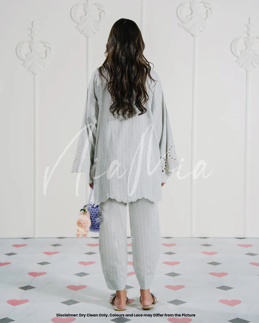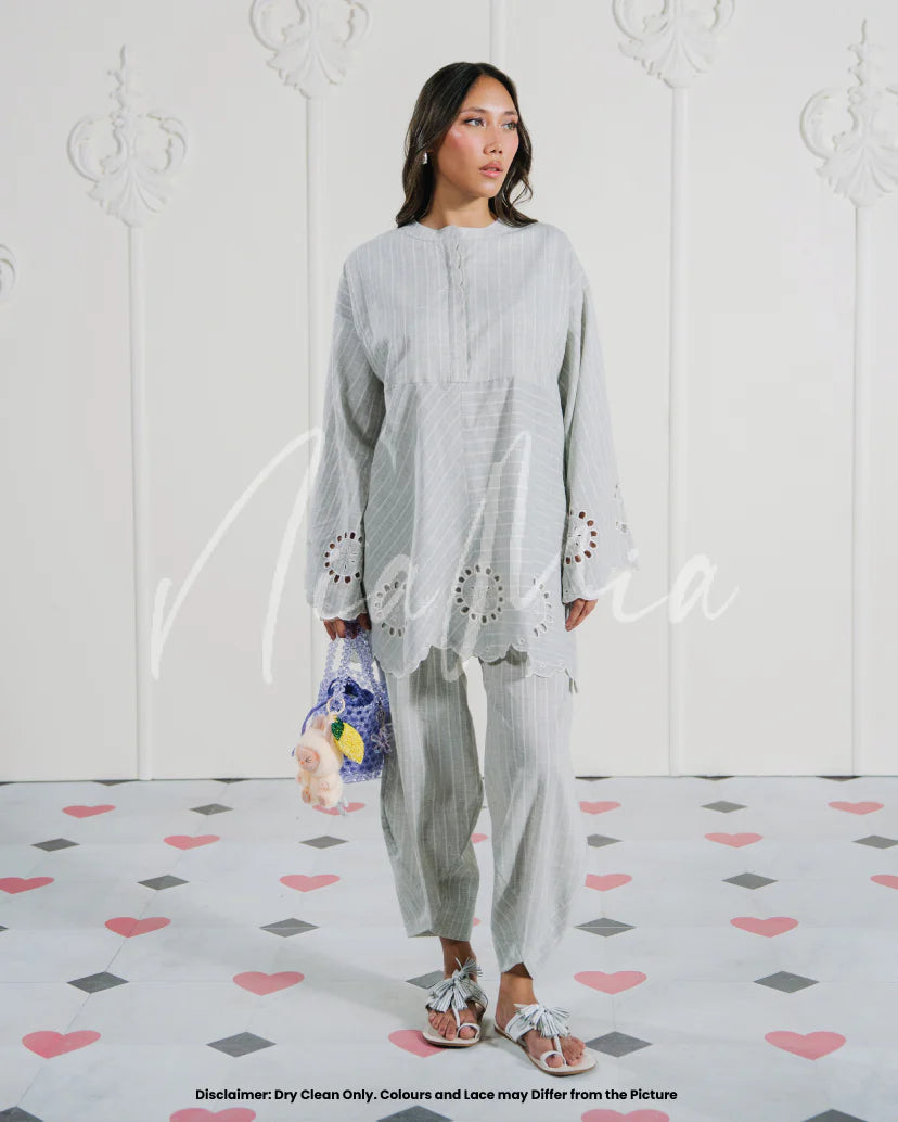 A grey linen weave co-ord set featuring fine white pinstripes and circular cutwork detailing along the sleeves and hem. The kurta has a straight silhouette with a scalloped neckline and a relaxed fit for easy movement.