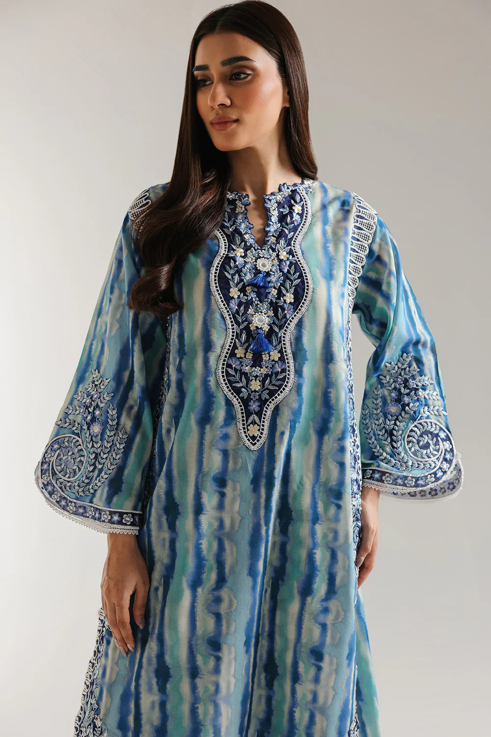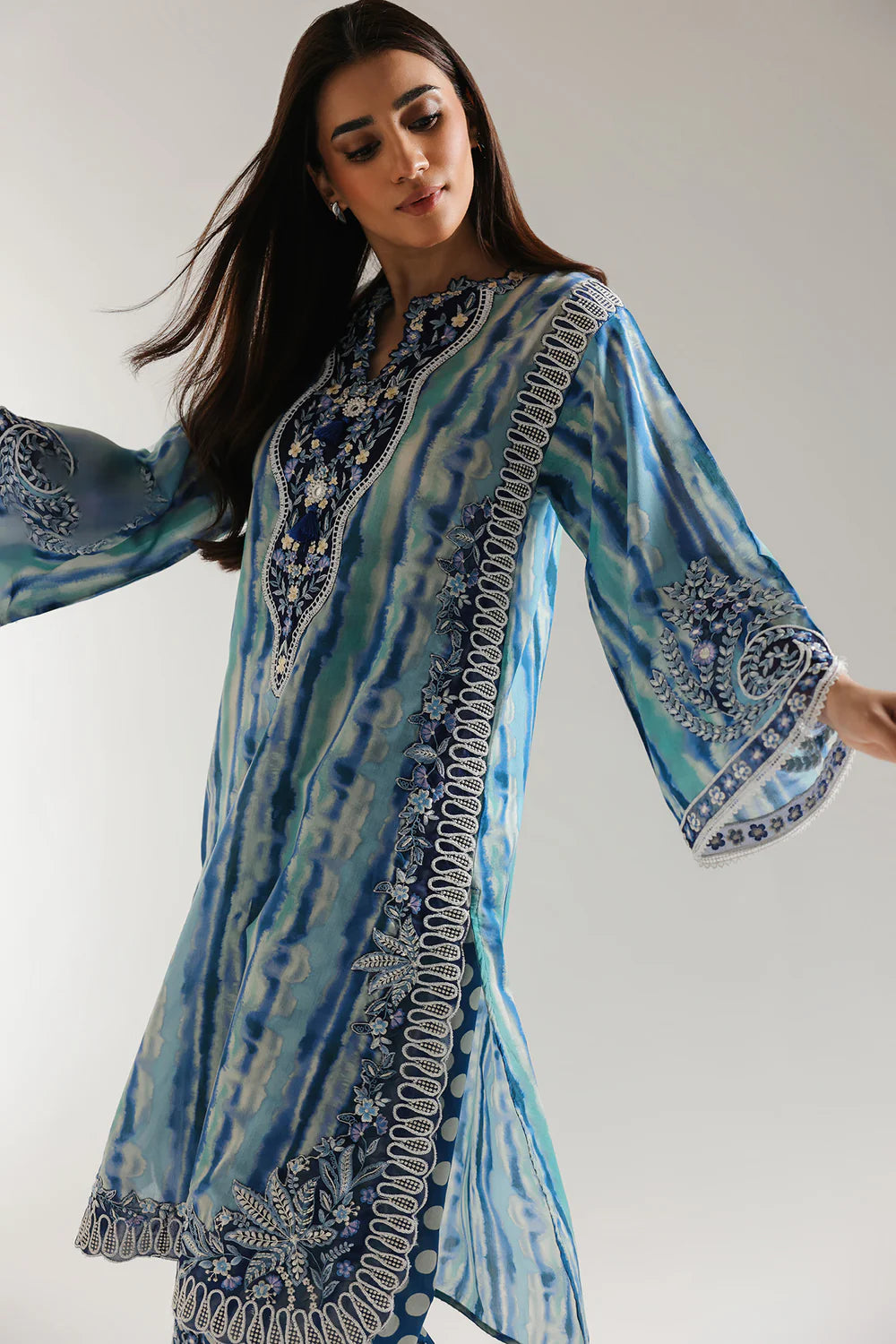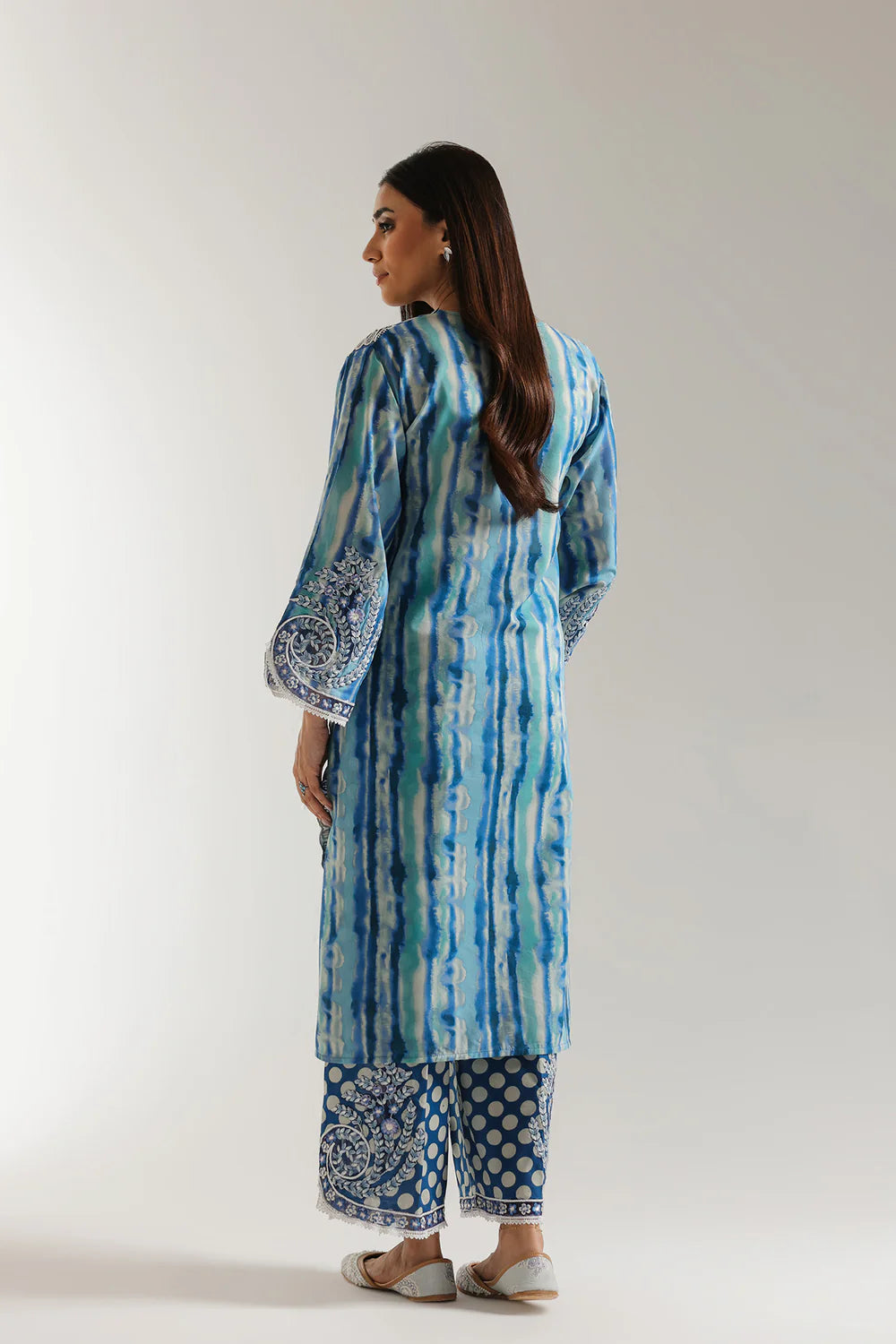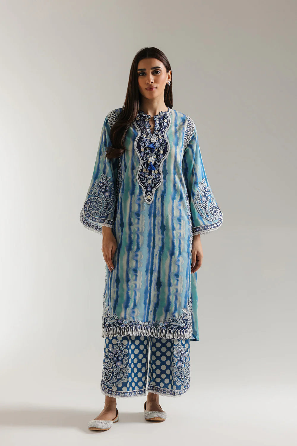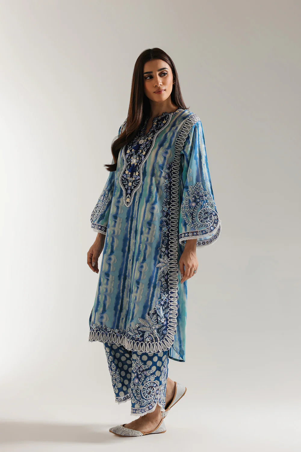 Radiate fresh, breezy vibes in this elegant blue kurta set that fuses traditional embroidery with contemporary flair. The kurta features a serene water-wash effect in varying shades of blue and green, adorned with intricate thread embroidery along the neckline, sleeves, and hem. The floral motifs and tassel accents add a playful touch, while the scalloped borders lend a polished finish. Paired with bold polka dot shalwar, detailed with complementary embroidery, this ensemble is perfect for daytime chic or festive summer outings.