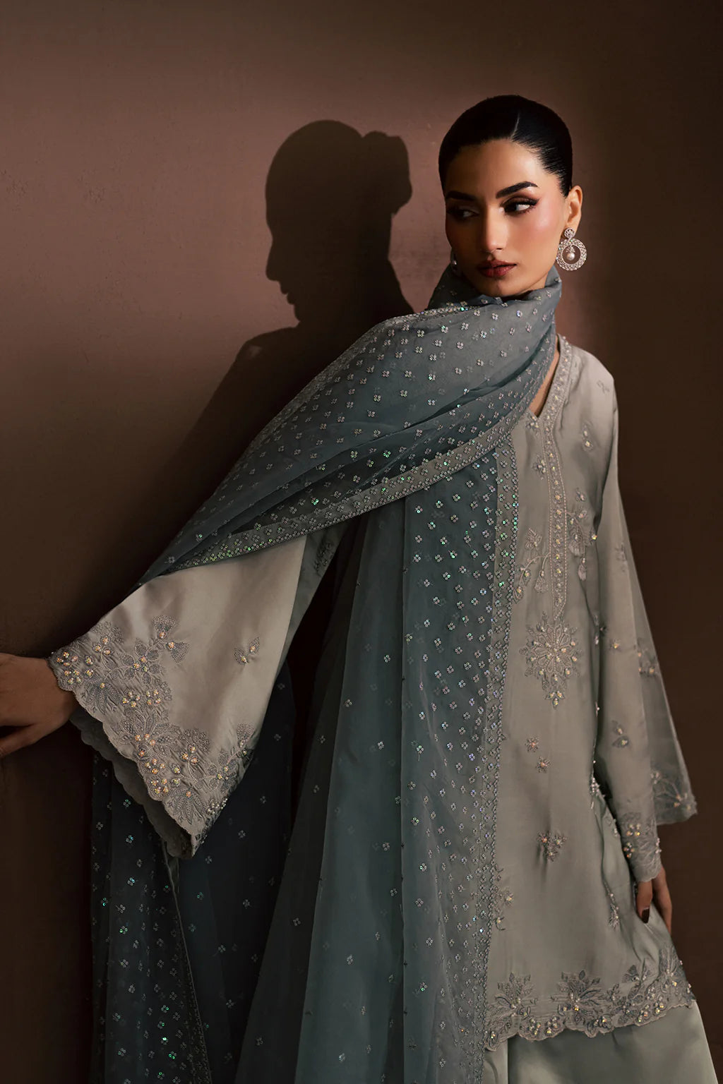 A timeless ensemble crafted in delicate grey shamoos silk, featuring fine embroidery enhanced with subtle hand embellishments that add a soft, elegant shimmer paired with fluid wide-leg trousers for modern grace. Completed with a sheer organza dupatta.