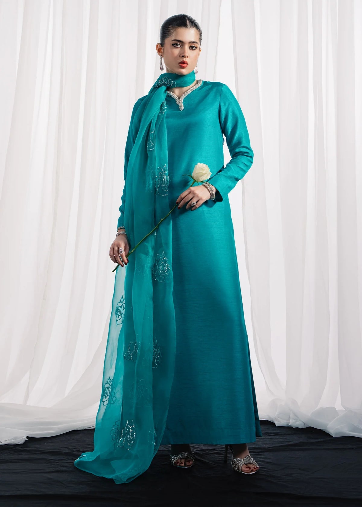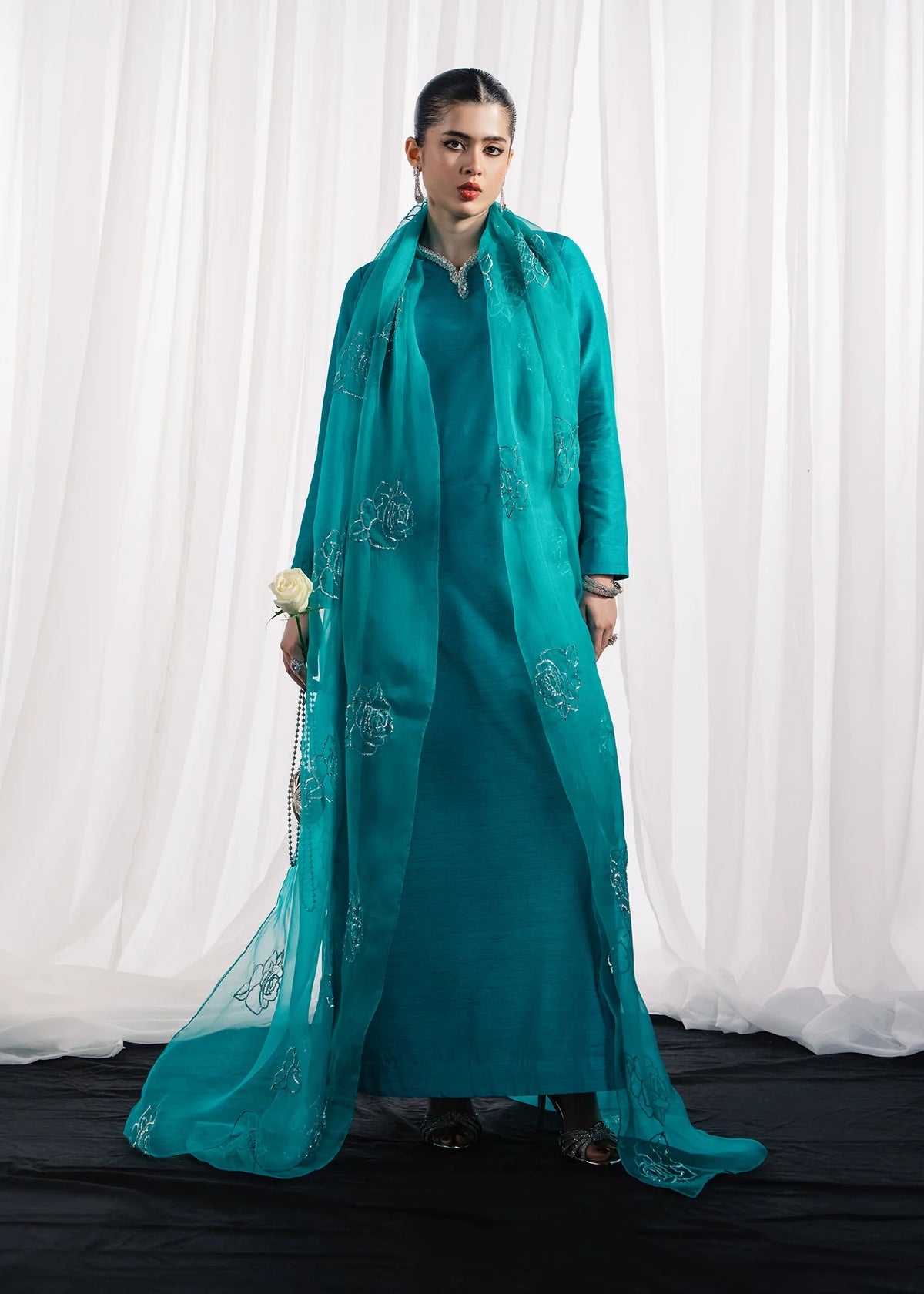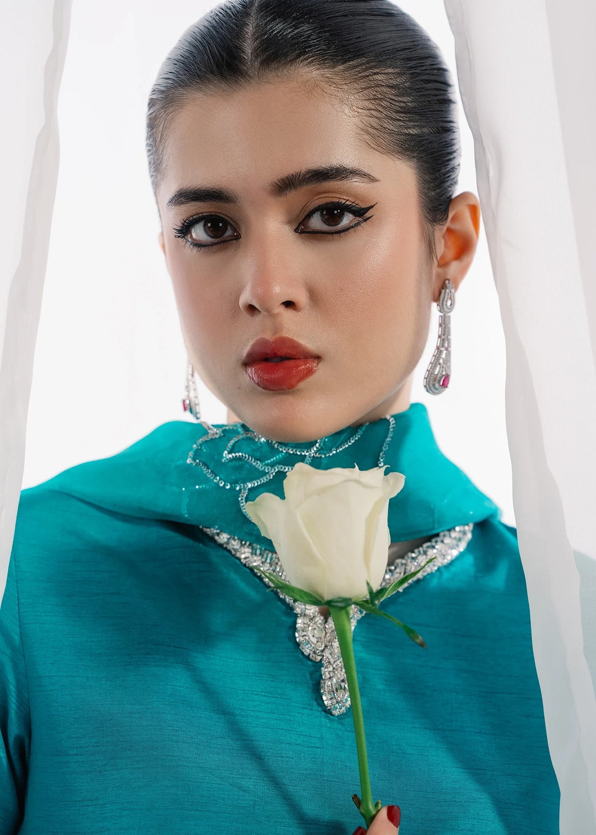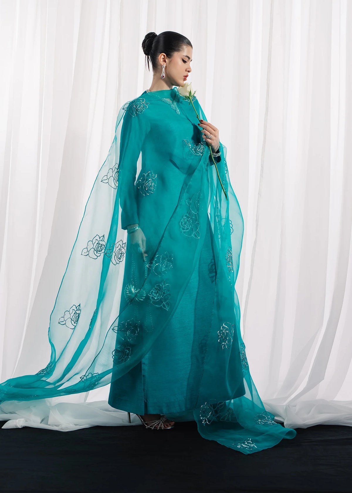 Emerald green silk set with a handcrafted stone encrusted serpent neckline. Paired with an organza matching dupatta with sequin worked roses.