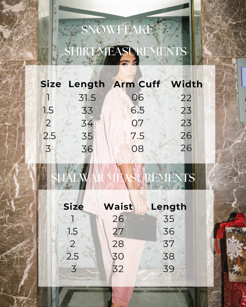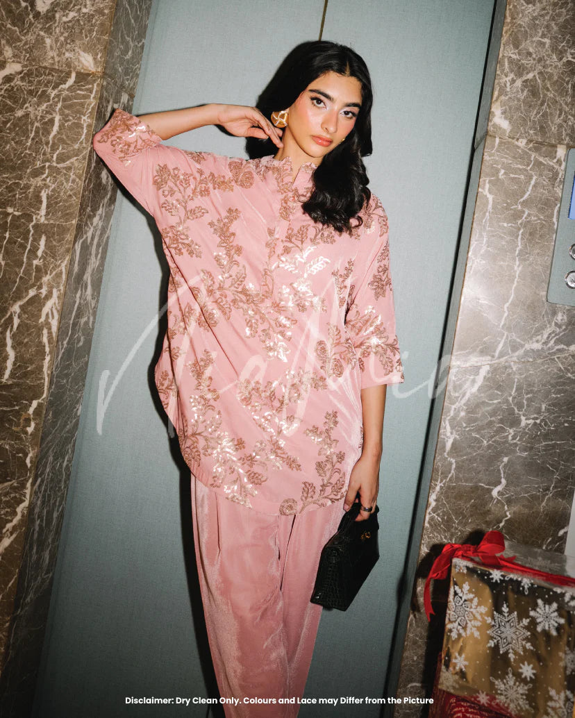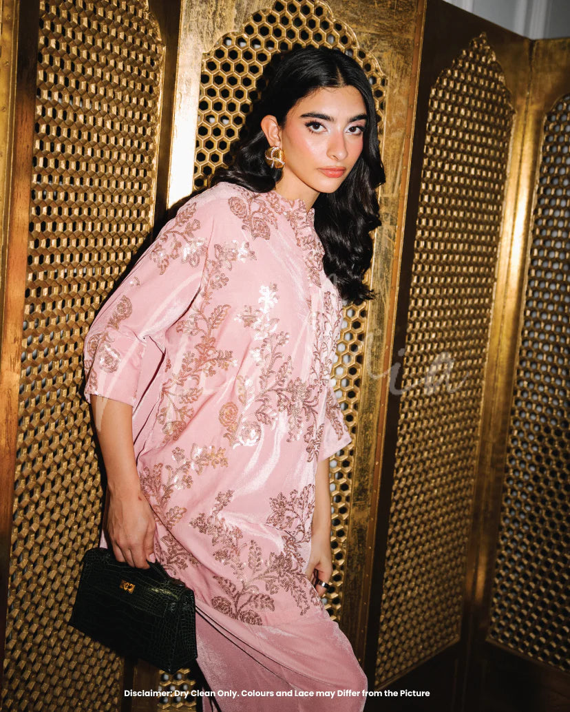 Snowflake is a two-piece velvet set featuring intricate sequin embroidery that adds understated shimmer to a soft pastel base. The NM-cut shirt is detailed with delicate floral and vine motifs across the front, creating texture and dimension without overwhelming the silhouette. Paired with matching shalwar, this look is refined, festive, and effortlessly elegant.