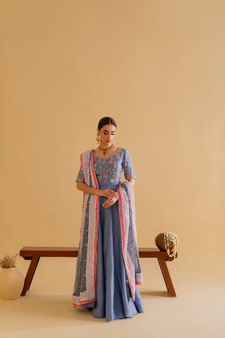 A canvas of intricate craftsmanship, Sofia redefines modern royalty. The blue Korean raw silk choli comes alive with zardozi and resham embroidery, weaving together colors in timeless harmony. Paired with a statement Korean raw silk lehenga featuring delicate lace, and kamdaani accents, the ensemble radiates regal charm. A handworked net dupatta completes the look, flowing gracefully to add grandeur and sophistication.