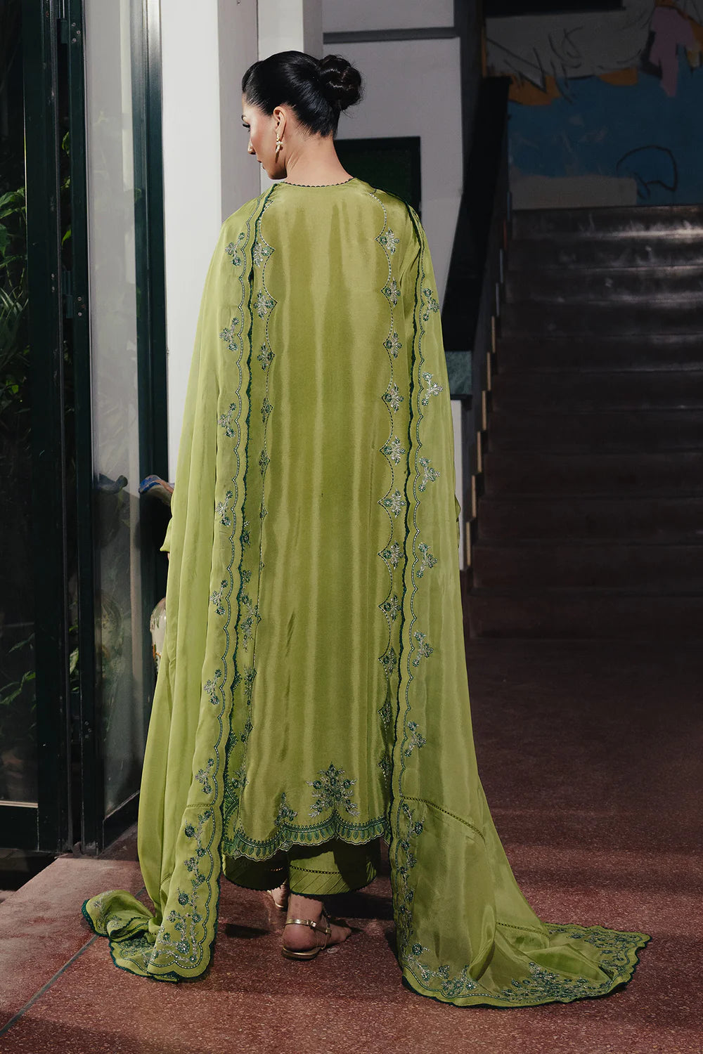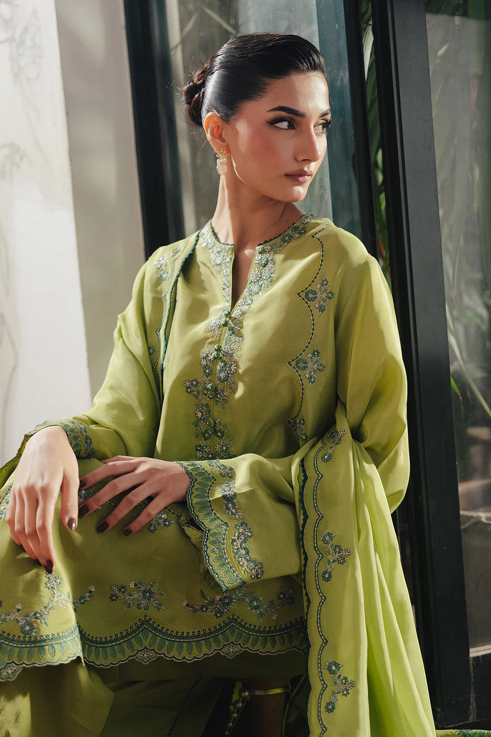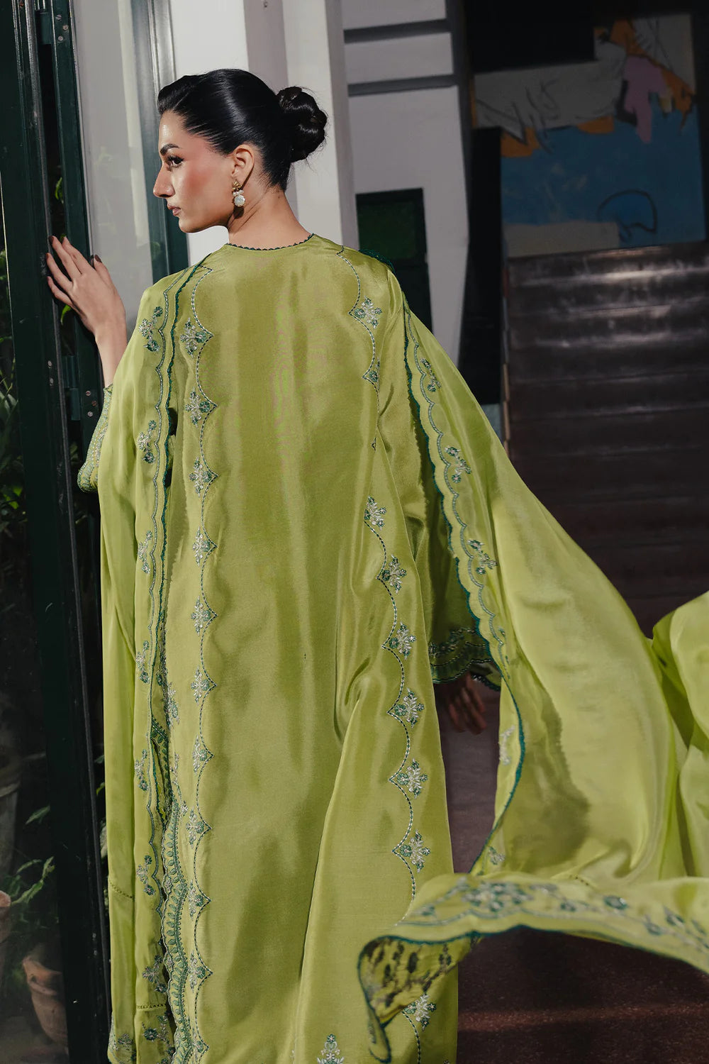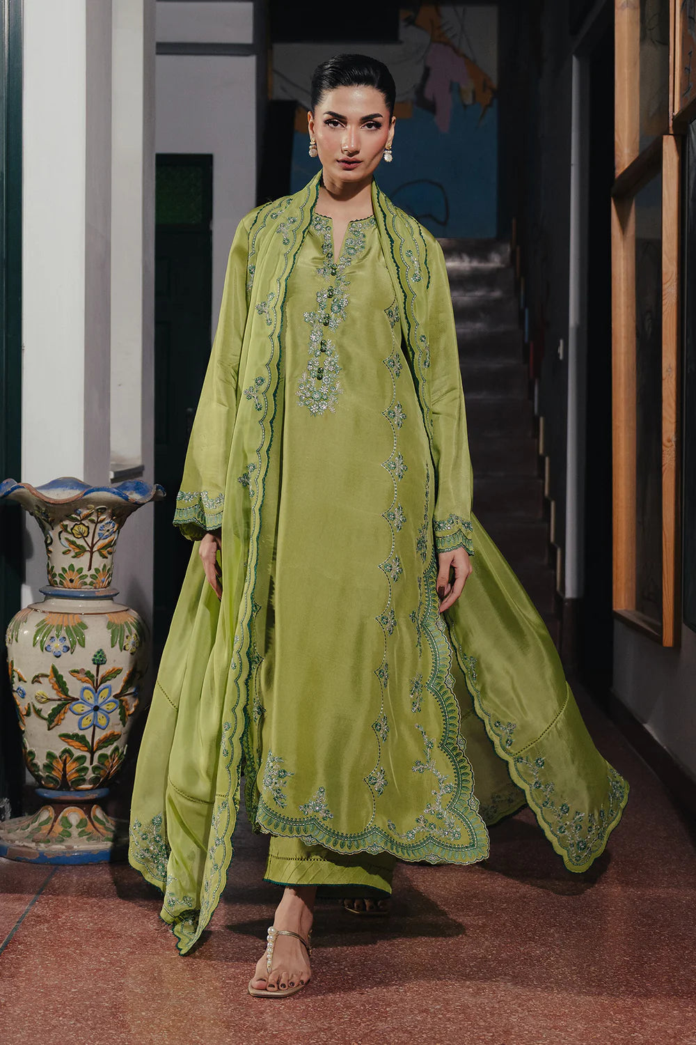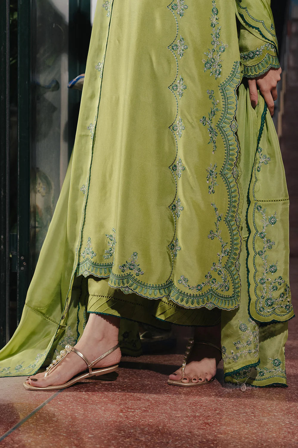 A vibrant lime green set featuring a loose-fit embroidered shirt with scalloped hem and sleeve detailing, paired with loose-fit pants and an embroidered silk dupatta.