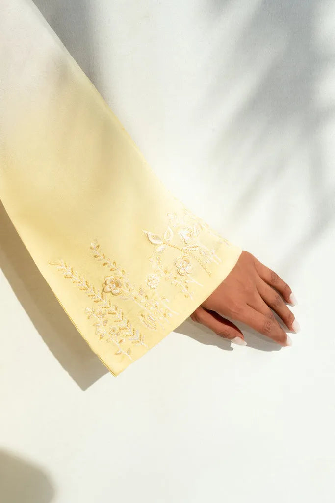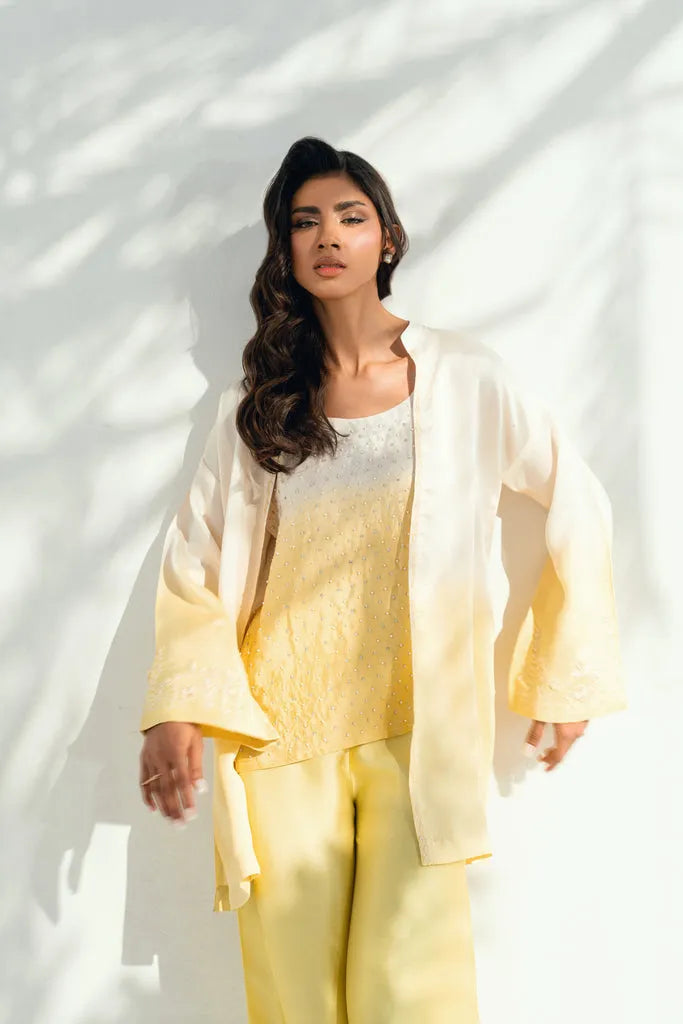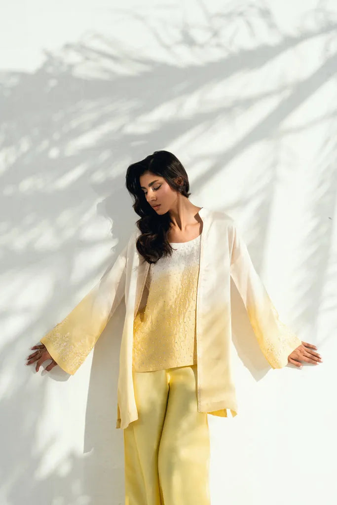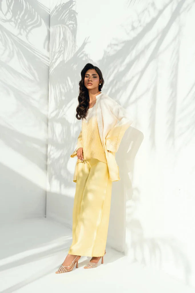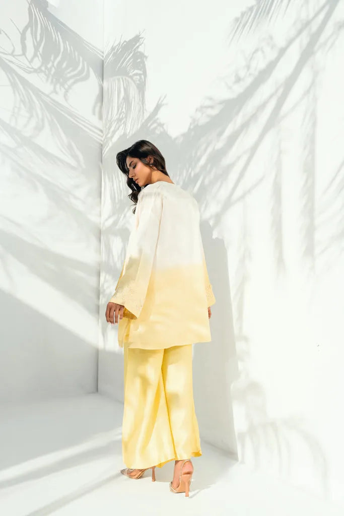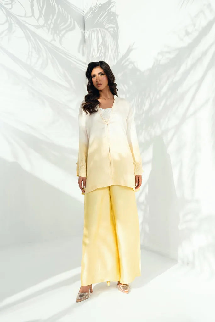 This two-tone ensemble features a short shirt and straight culottes, both crafted in pure sheesha silk and detailed with delicate floral embroidery and subtle three-dimensional floral accents along the neckline and sleeves. The inner layer is adorned with fine pearl and sequin work, adding depth without overwhelming the design