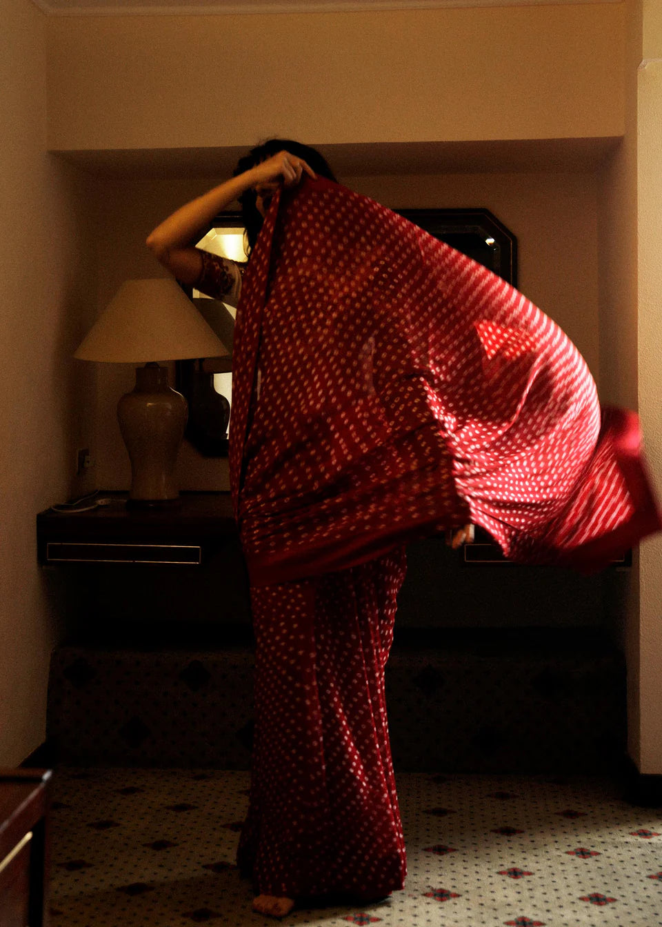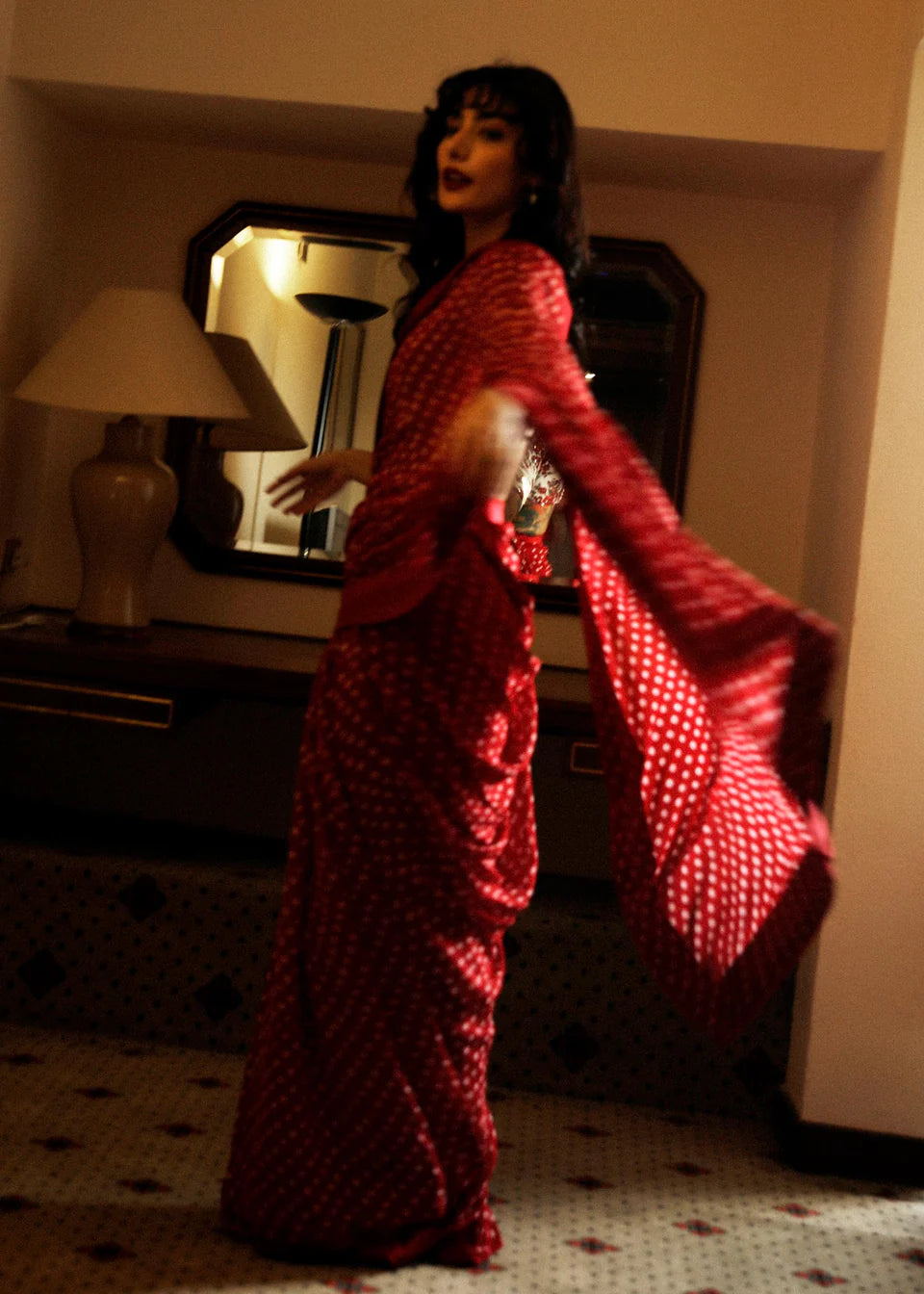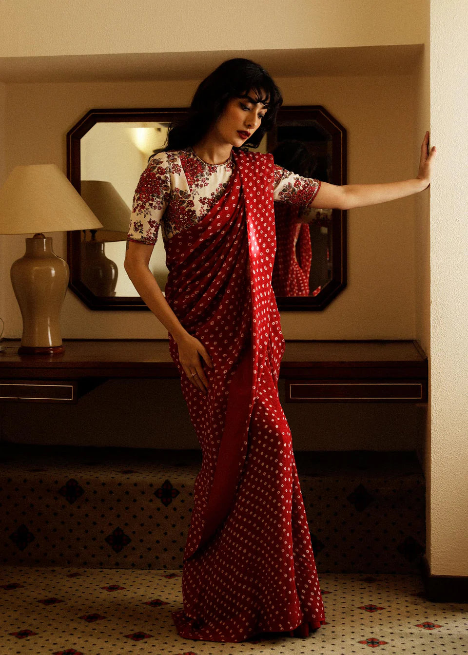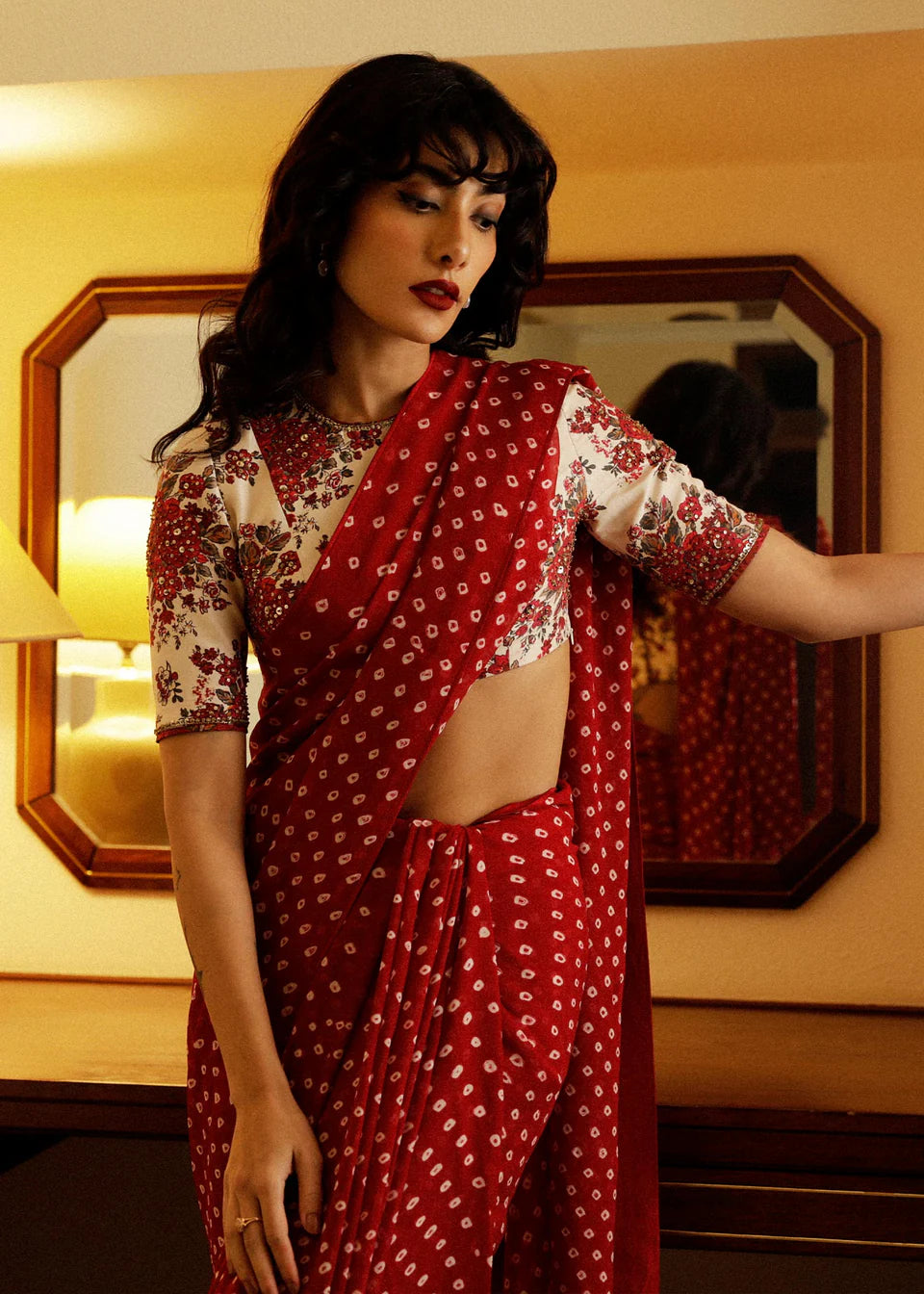 This red hand-dyed bandhani sari with silk finishes is paired with a floral printed silk blouse embellished with sequins and handwork.