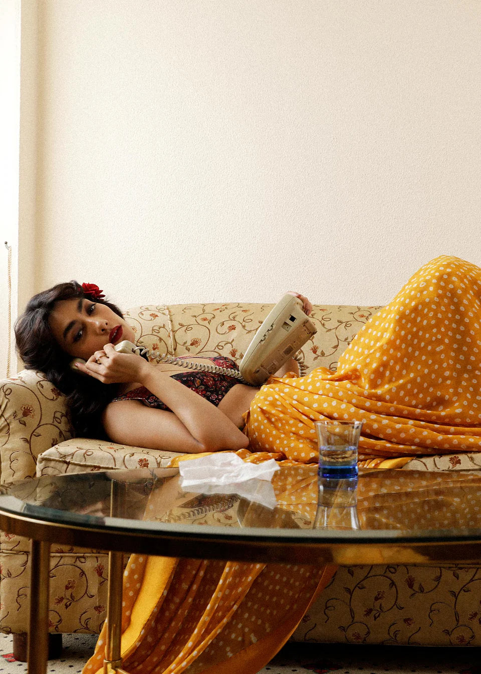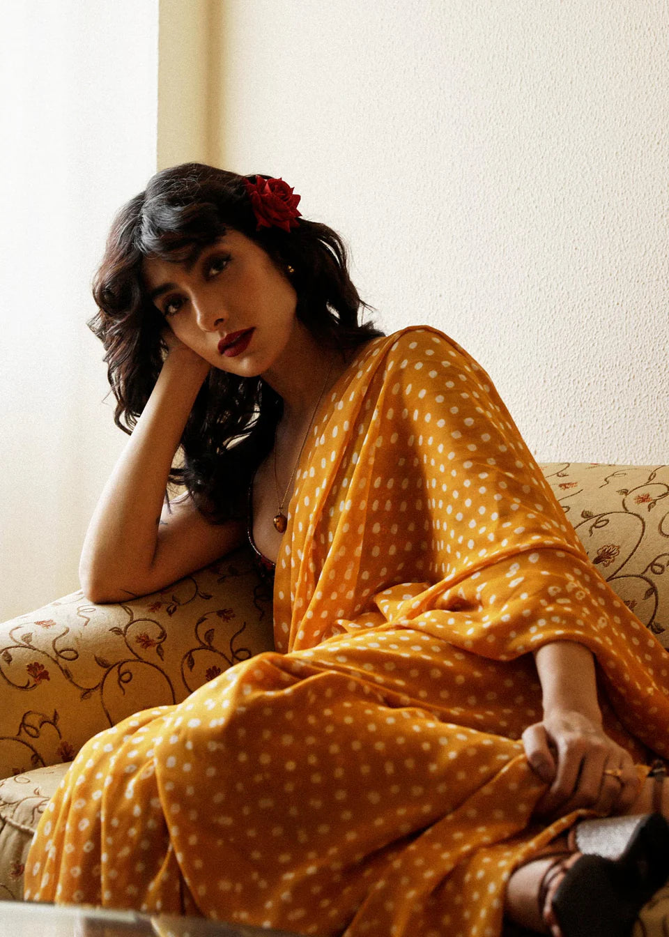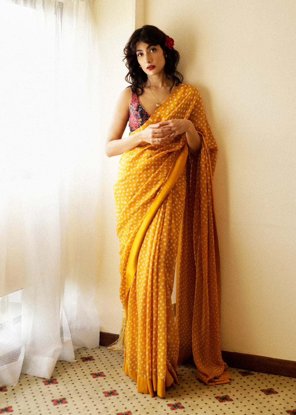 This mustard hand-dyed bandhani sari with silk details comes with our signature floral printed silk blouse embellished with sequins and beadwork.