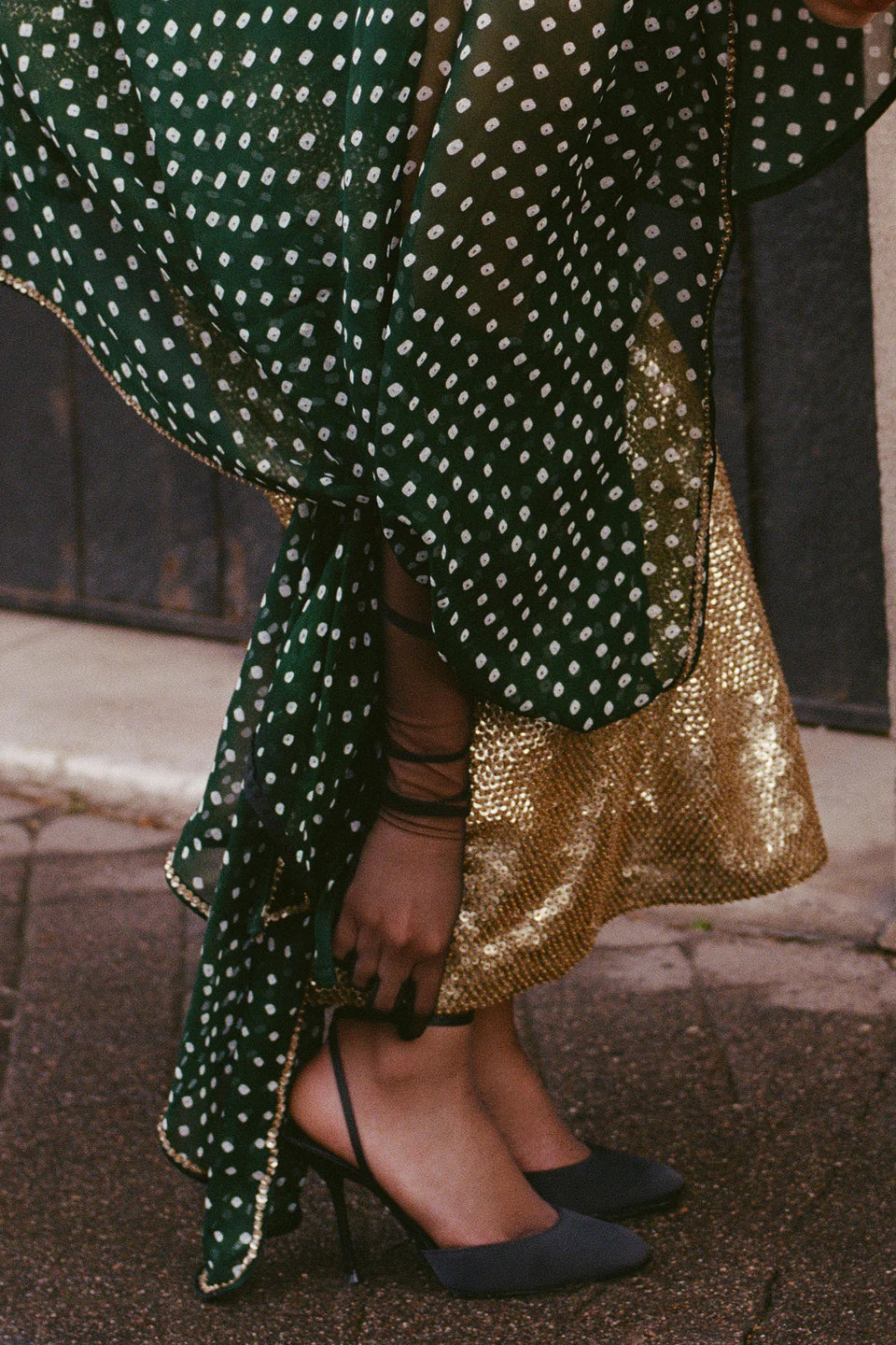 Our skirt set is finely crafted in gold with a modern cut blouse which features sequins and beaded handwork. It comes with an emerald green hand dyed bandhani dupatta.