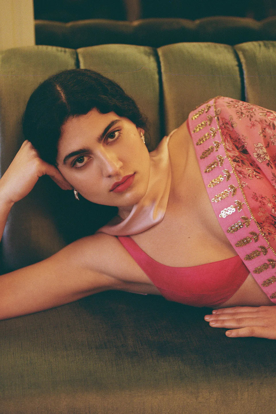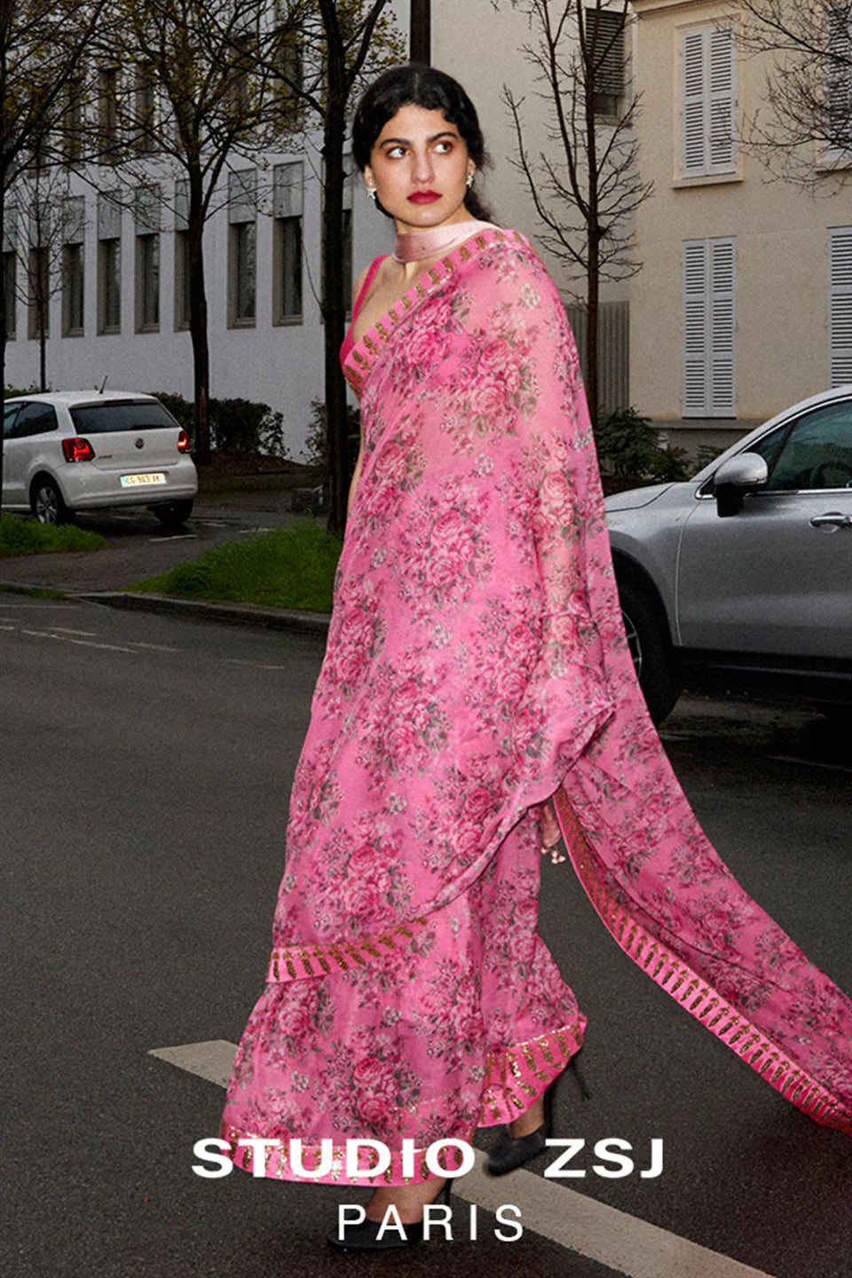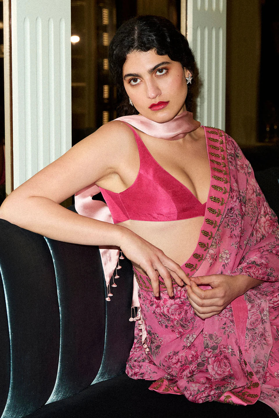 Our signature floral printed sari in gold sequins and beaded hand embellishments comes with a solid pink silk blouse.