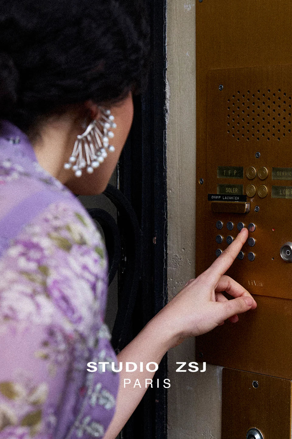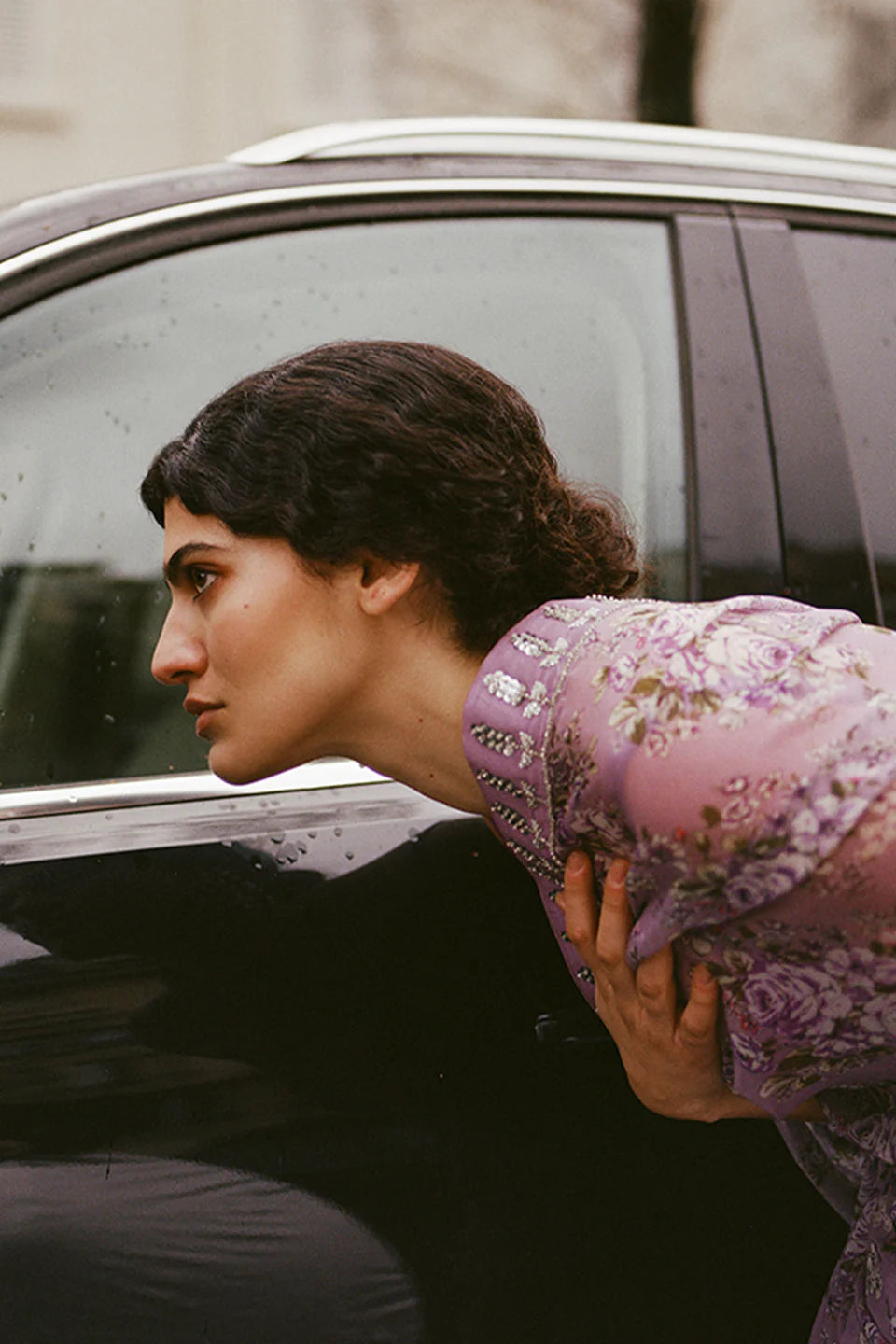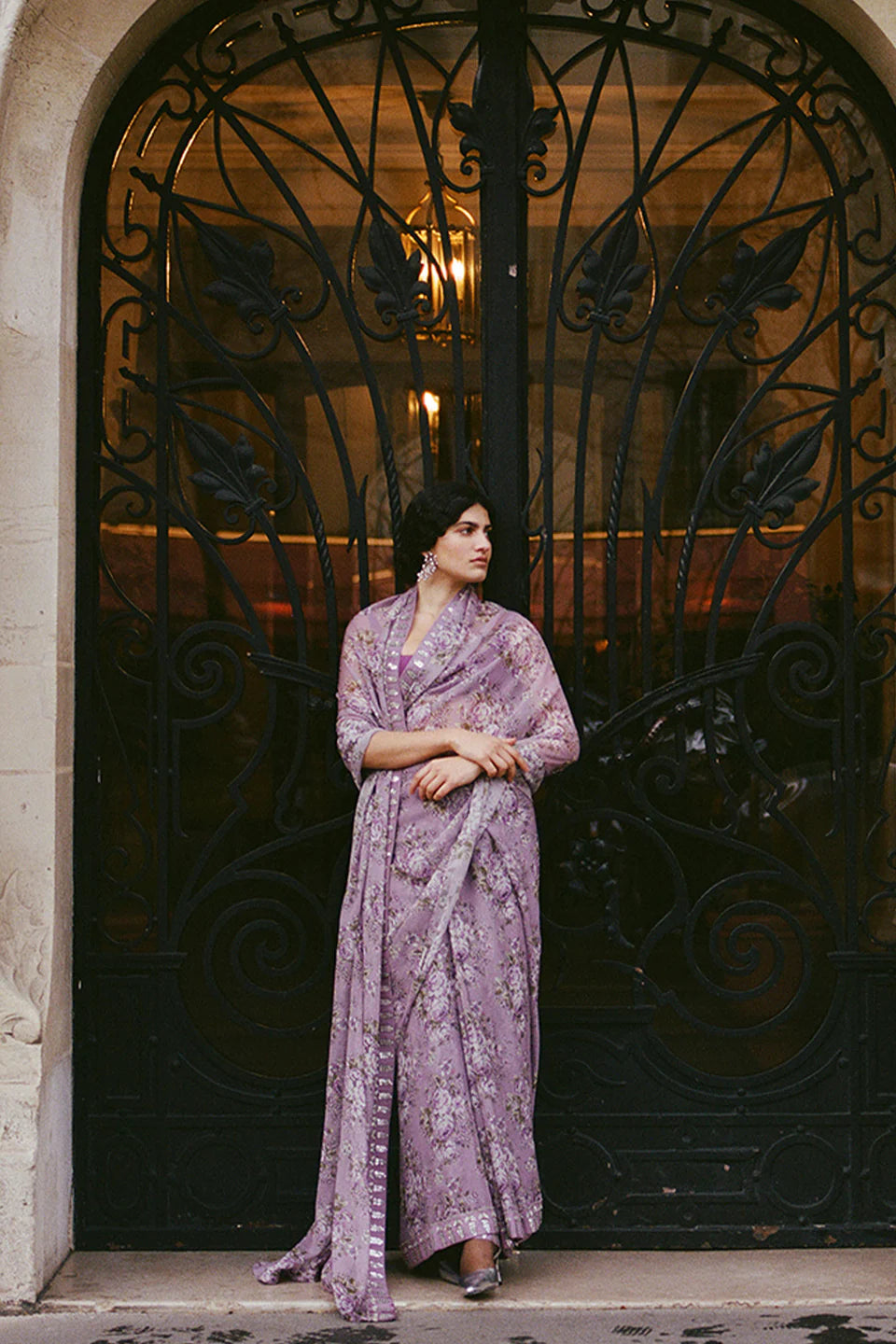 Our signature floral printed sari in silver sequins and beaded hand embellishments comes with a solid purple silk blouse.