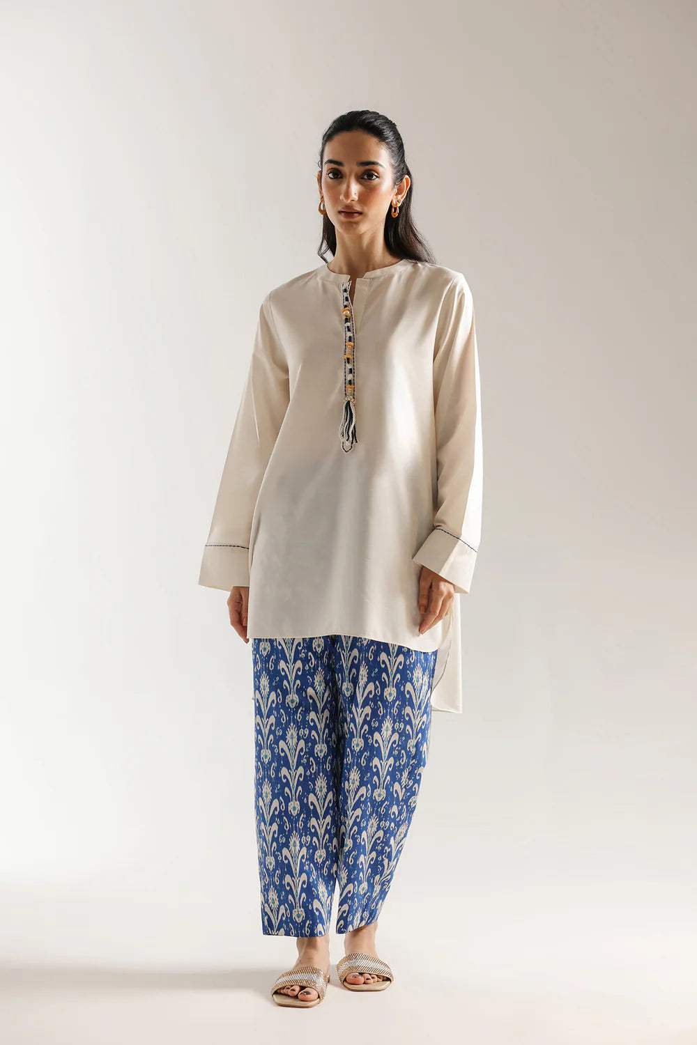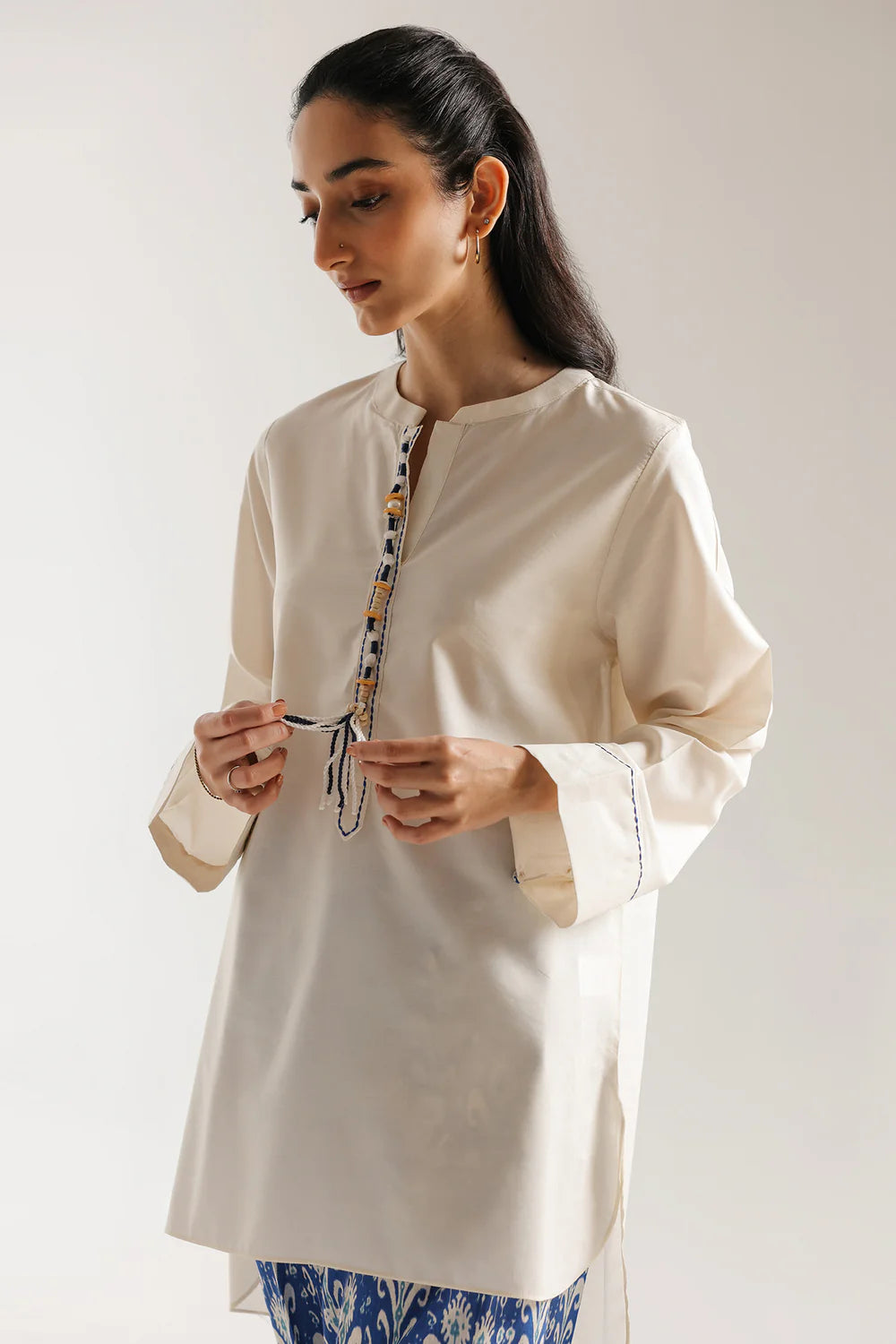 Embrace effortless style with this charming two-piece printed suit, perfect for your casual wardrobe. The ensemble features a relaxed-fit kurta in a creamy off-white shade, beautifully detailed with a subtle blue and yellow patterned placket along the neckline and a delicate blue border on the cuffs. Paired with it are vibrant blue trousers that steal the show with their bold, striking white Ikat-style print, offering a comfortable and breezy silhouette. This fusion of minimalist design and eye-catching patterns creates a chic, contemporary look that is ideal for daytime outings or casual gatherings.