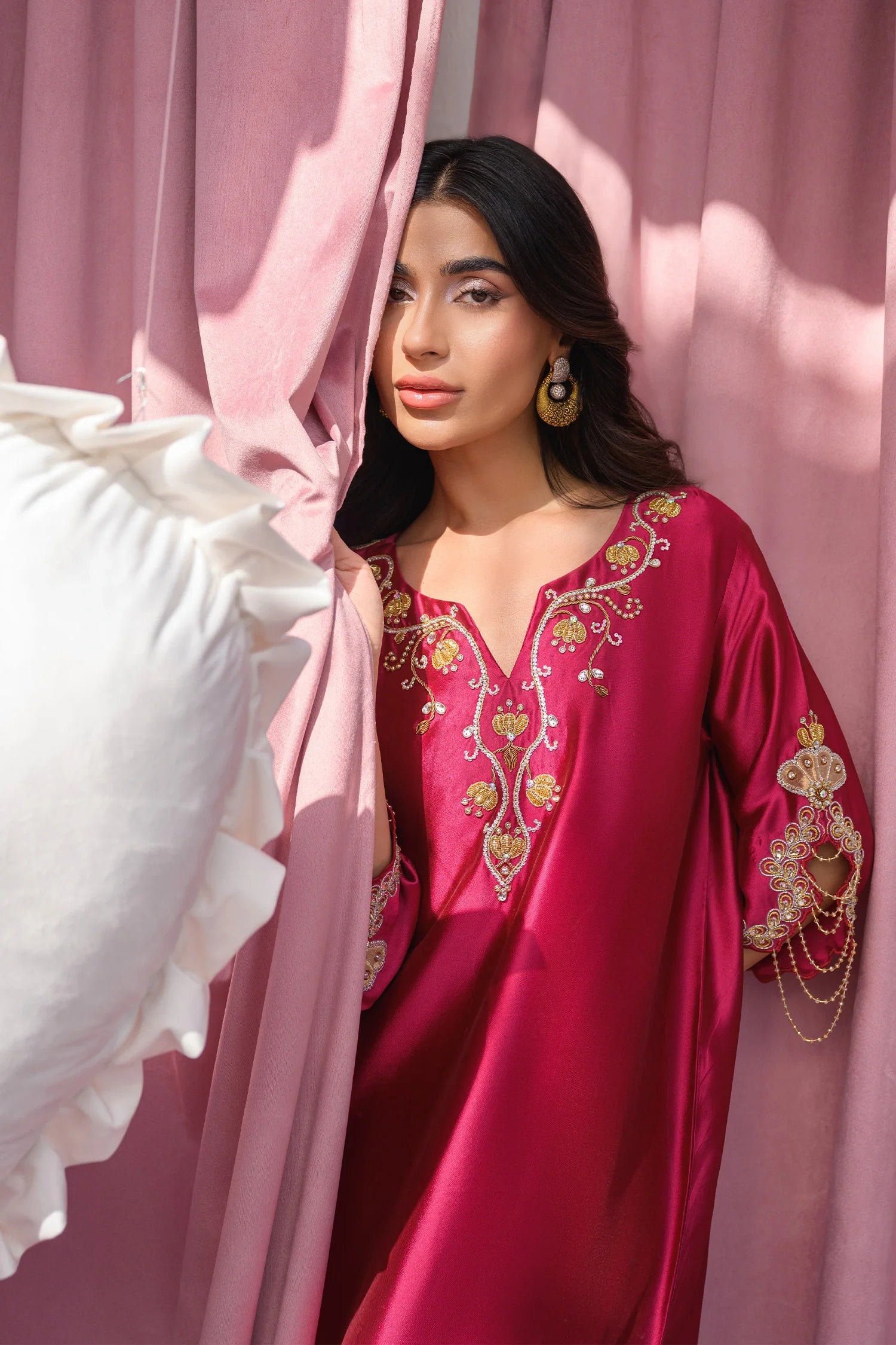 Cranberry-toned long kaftan set crafted in pure Sheesha silk, paired with matching pants. The kaftan features intricate golden dabka and kora work on the daman, sleeves, and hemline, with delicate golden hangings on the sleeves for added elegance.