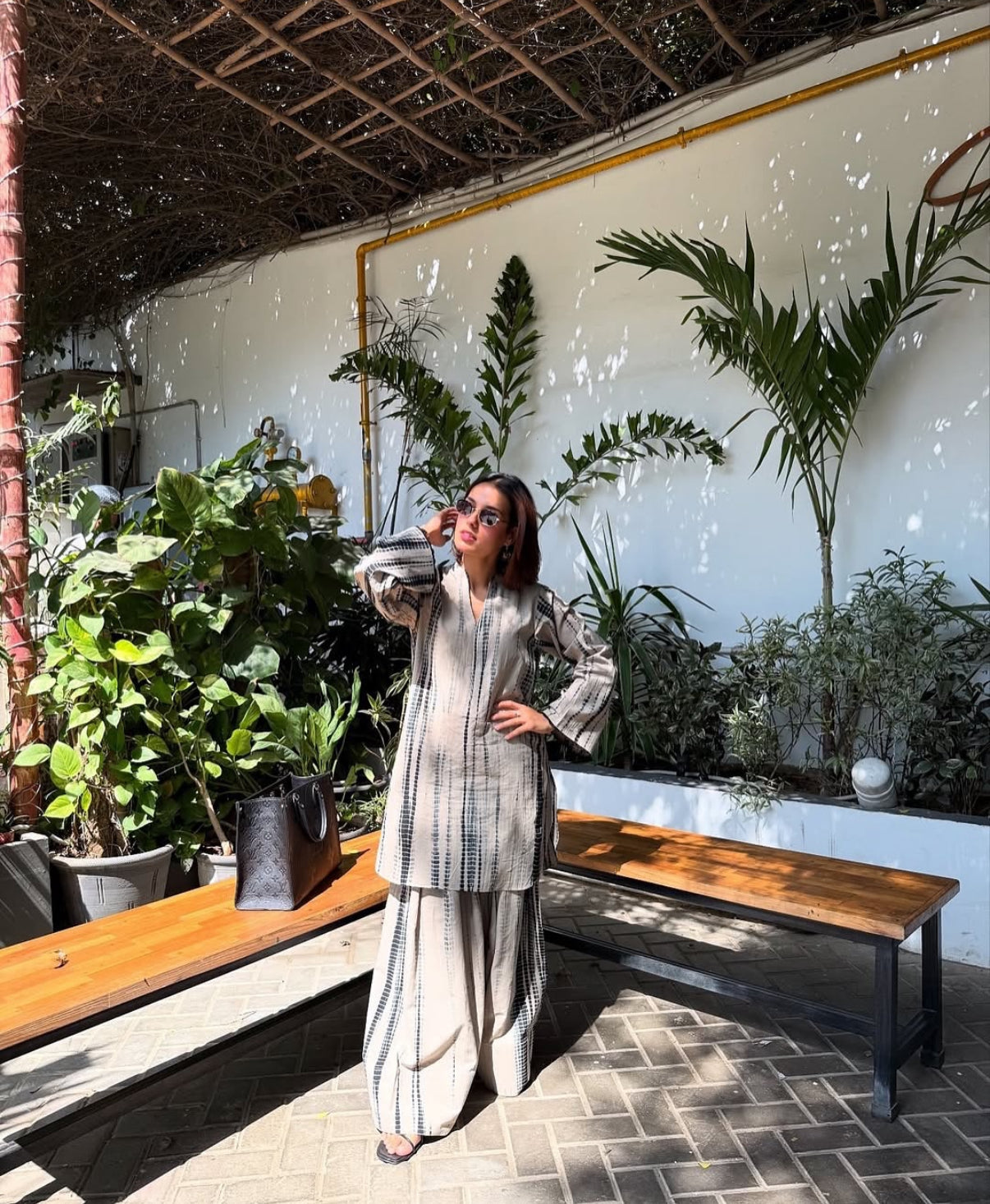 Made from hand-woven cotton, and hand-dyed black stripes on beige base, offering a unique blend of traditional craftsmanship and contemporary style. This breathable cord set of shalwar and kurta features sustainable fabric, perfect for sensitive skin ensuring comfort throughout the day.