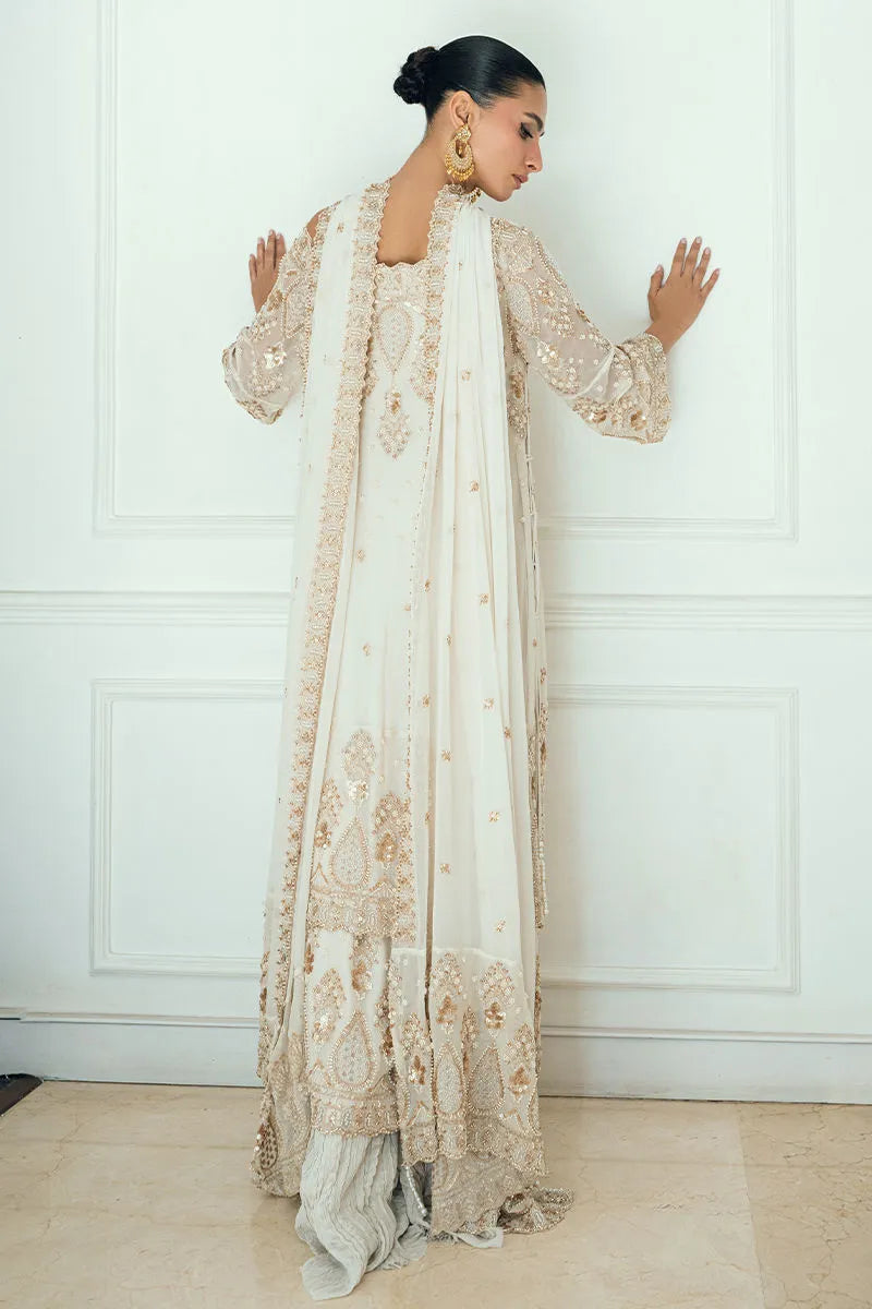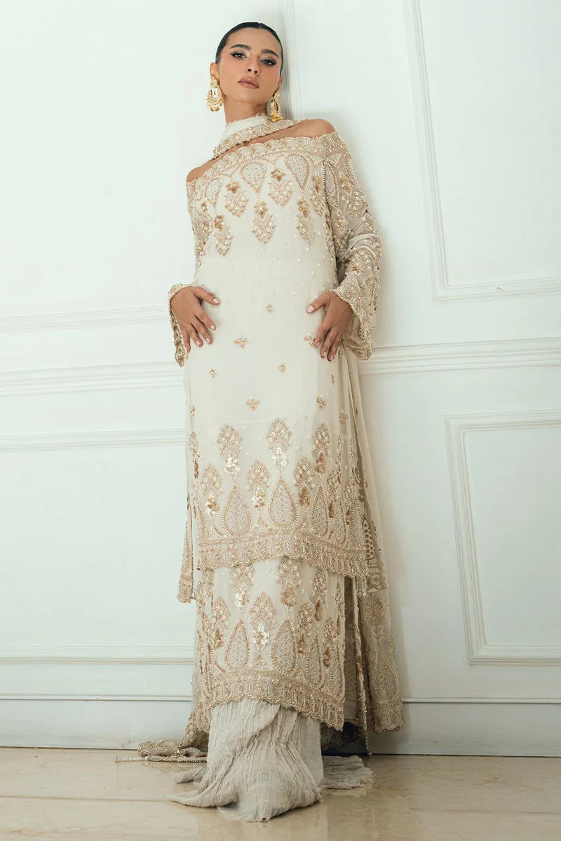 Zunaira ivory georgette chiffon shirt carries delicate thread, pearl, and bead borders throughout. Designed as a double-panel silhouette finished with pearl tassels along the sides.