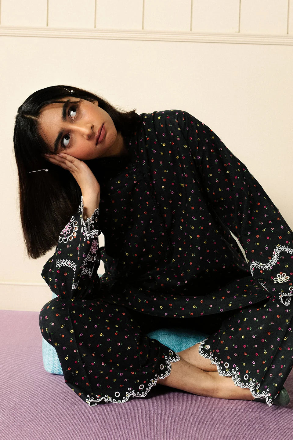 A loose-fit, short black cambric kurta with bright embroidery on the sleeves, paired with embroidered cropped culottte pants. Bold yet playful, this look brings vibrant detail to a classic silhouette, effortlessly balancing elegance with lively energy.