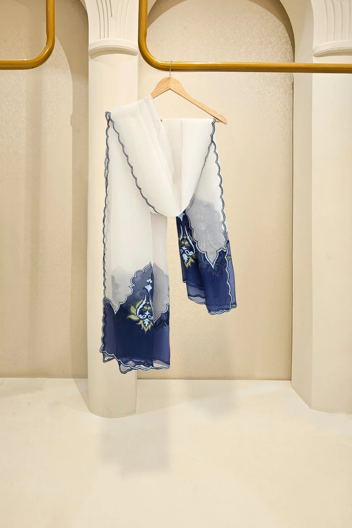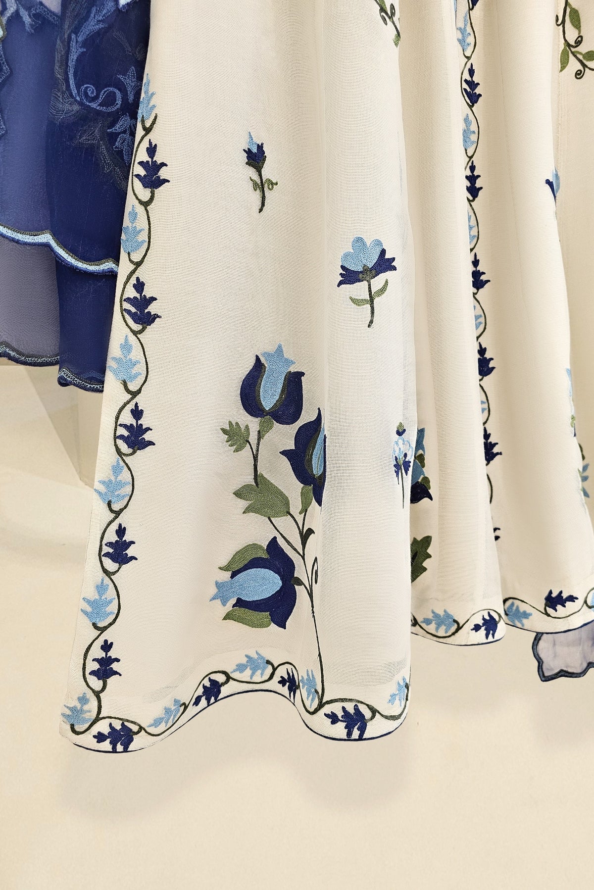 An embellished beautiful three piece on pure handloom cotton net, embellished intricately with ari motifs done by our expert artisans. Paired with a scalloped pure organza dupatta and pure raw silk straight loose pants as seen. The length of the long panelled kalidaar is 48 inches.