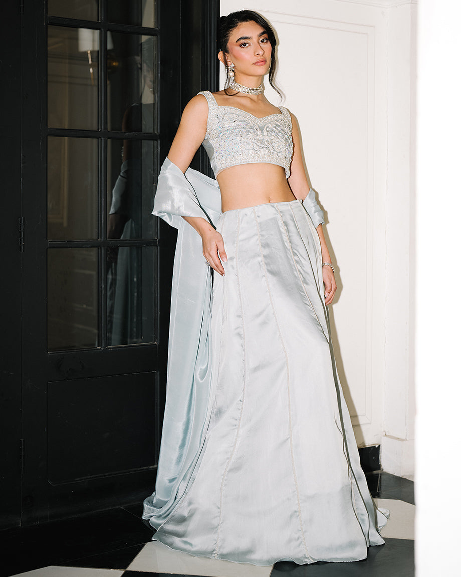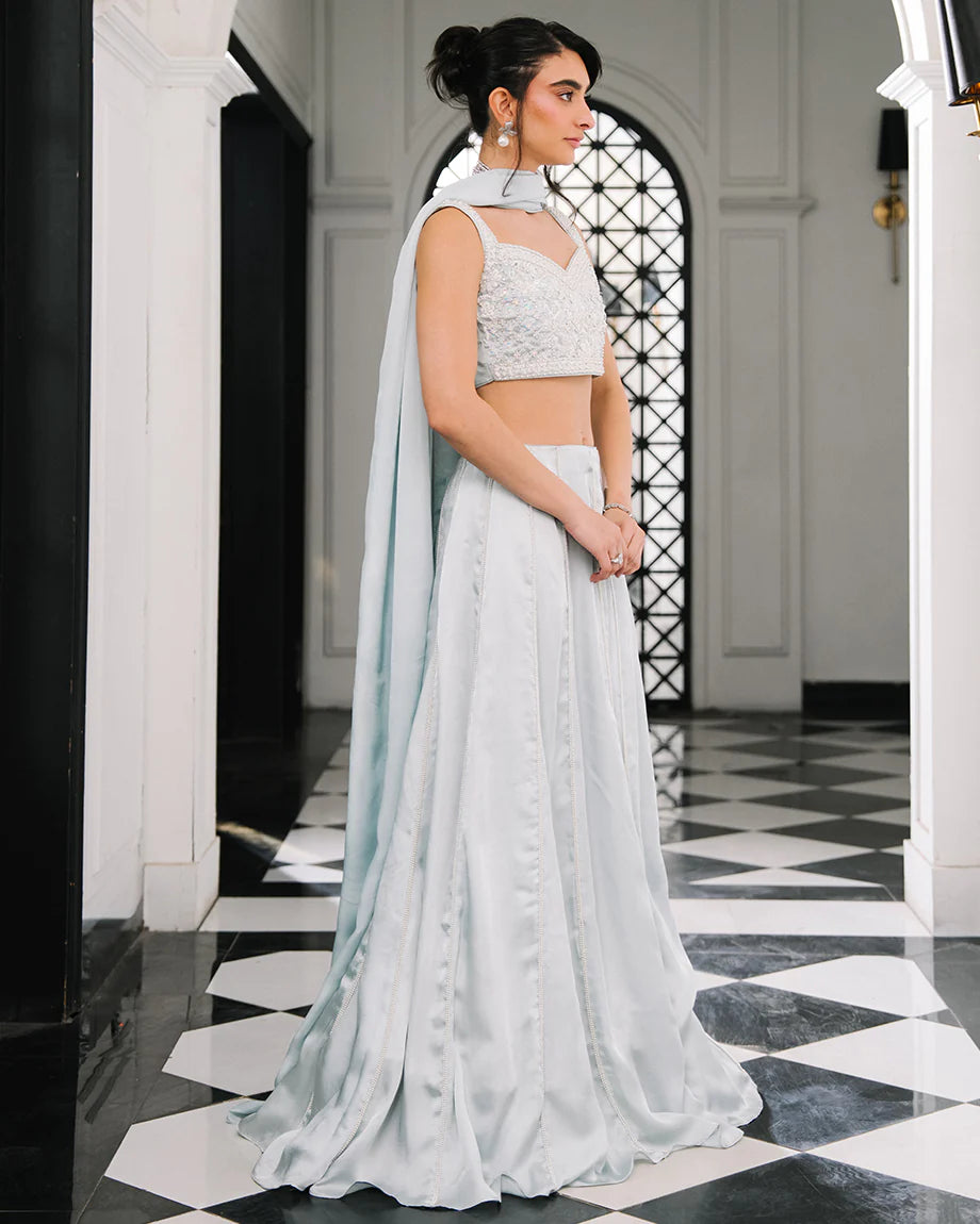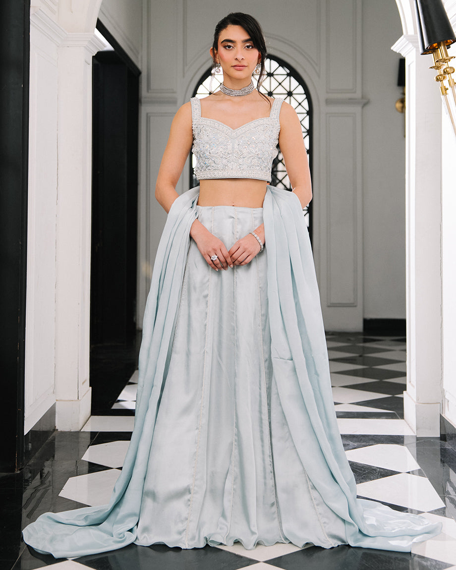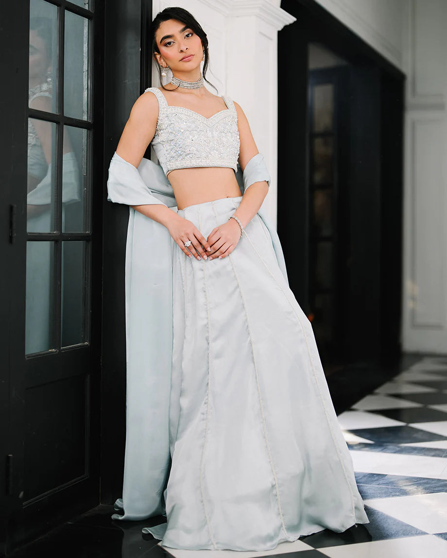 A baby blue 3-piece set featuring a shamus choli and lehenga with inner lining, paired with a soft silk dupatta. Detailed with handwork across the choli and lehenga for an intricate finish, offering a graceful silhouette. Zips & hooks are on the sides & cancan is attached.