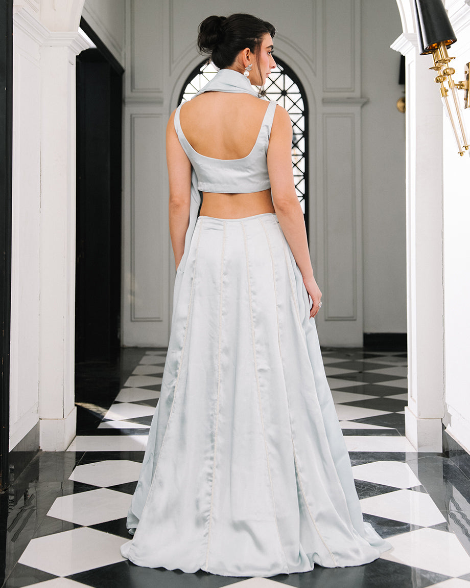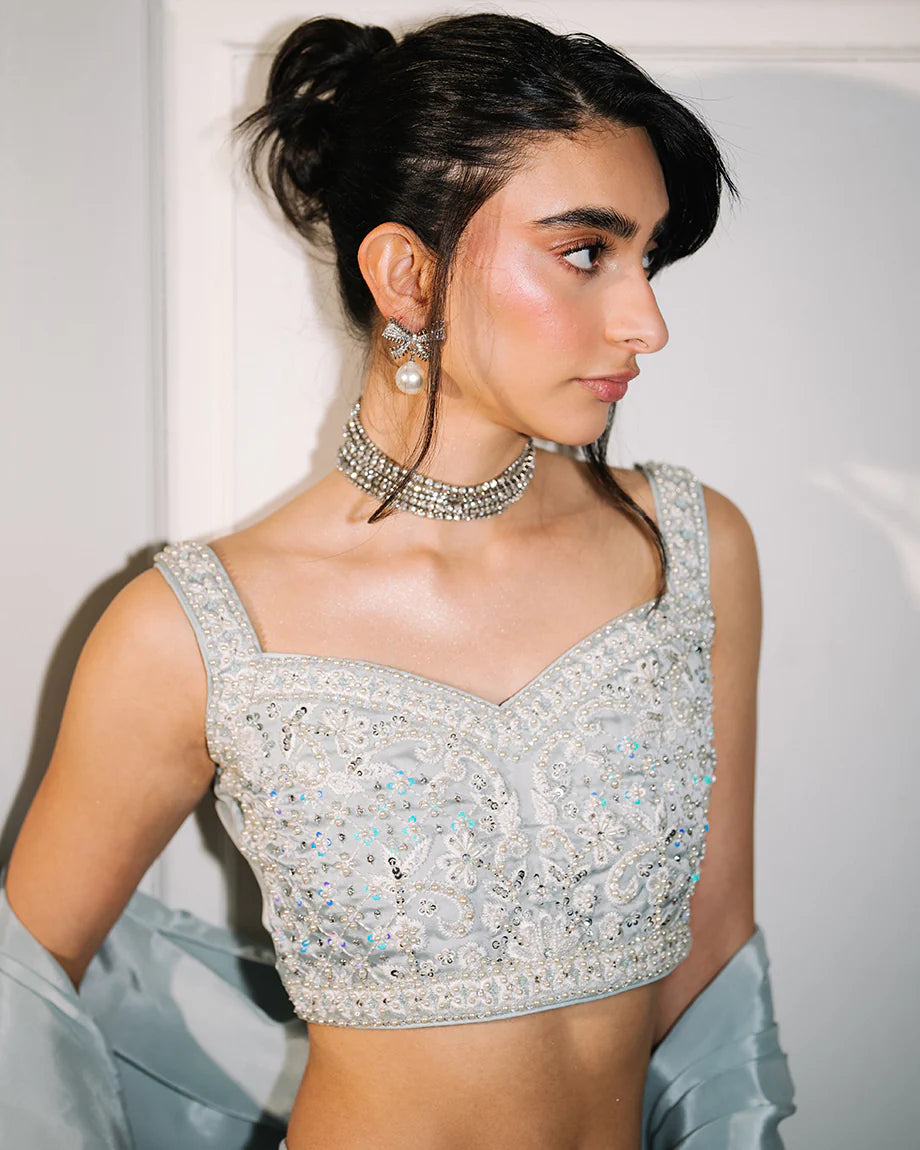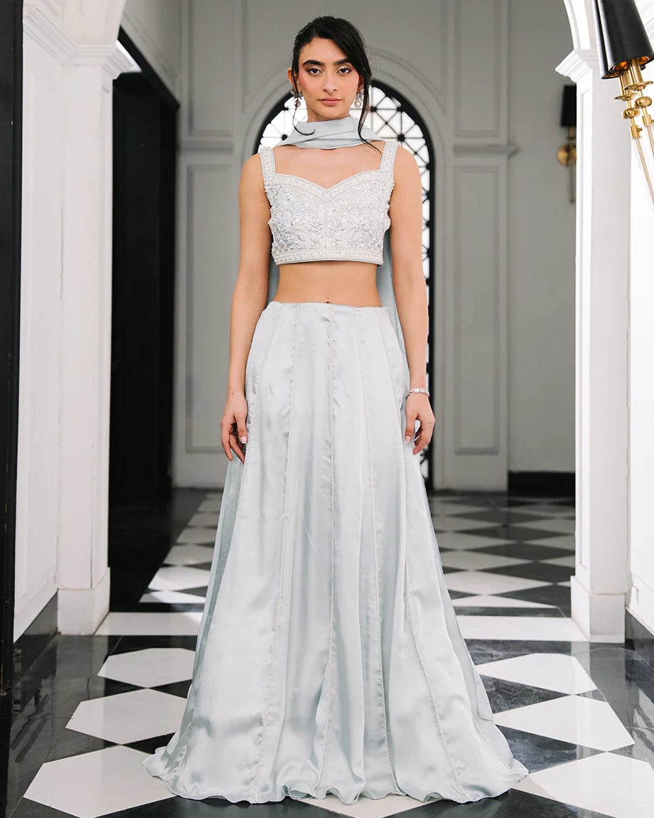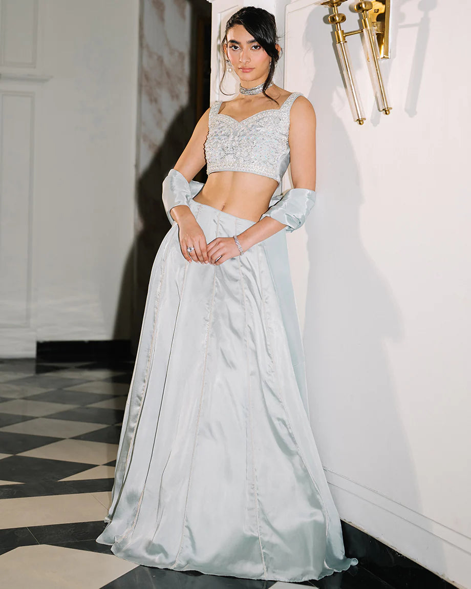 A baby blue 3-piece set featuring a shamus choli and lehenga with inner lining, paired with a soft silk dupatta. Detailed with handwork across the choli and lehenga for an intricate finish, offering a graceful silhouette. Zips & hooks are on the sides & cancan is attached.