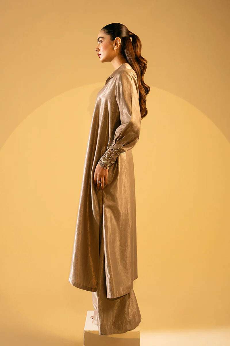 An epitome of refined glamour — this long shirt is defined by its elegant collar neckline and balloon sleeves, accentuated with intricately ada work on cuffs. Paired with flowing flared pants, the ensemble captures the essence of timeless luxury and modern grace.