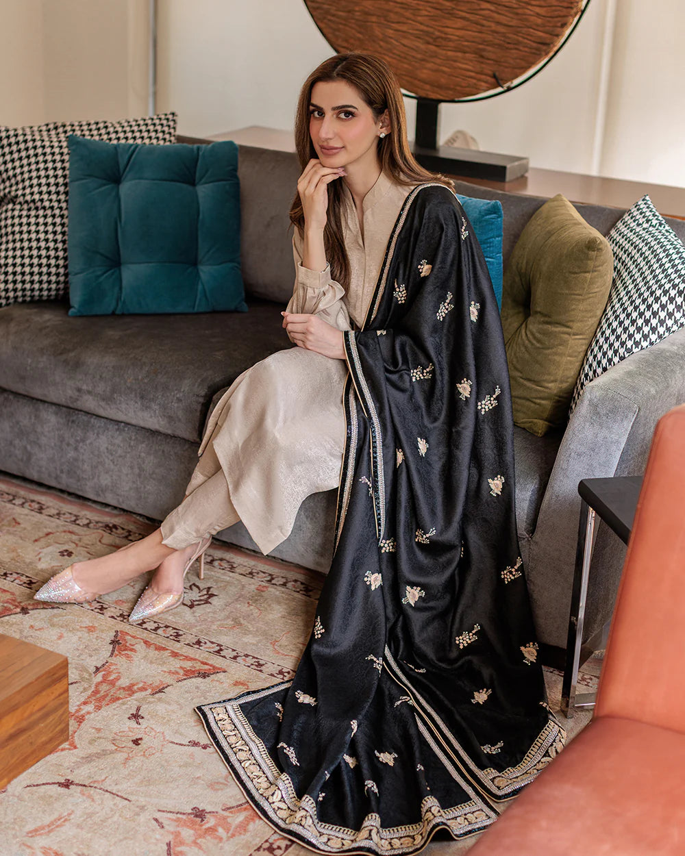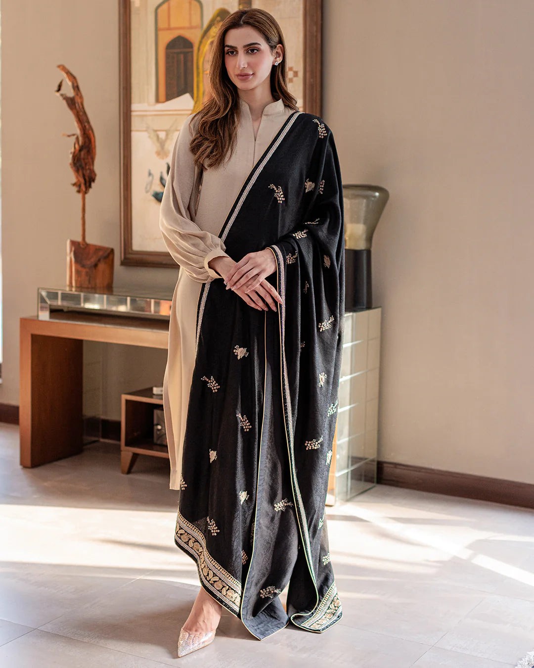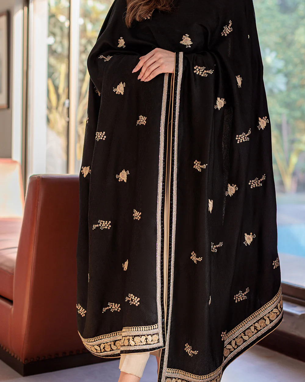 The shawl is intricately handworked with Resham and Swarovski embellishments.