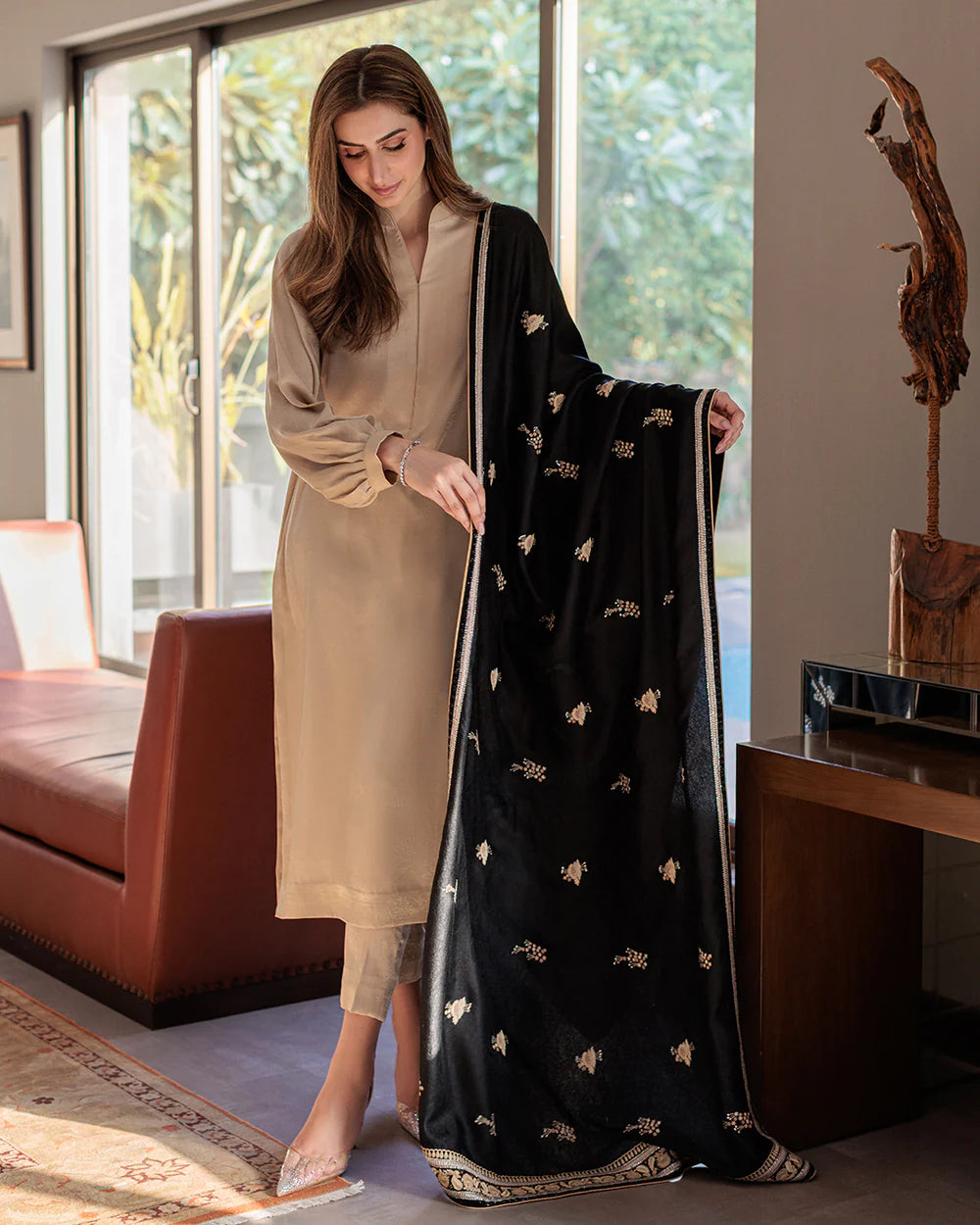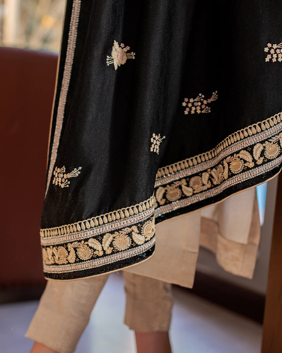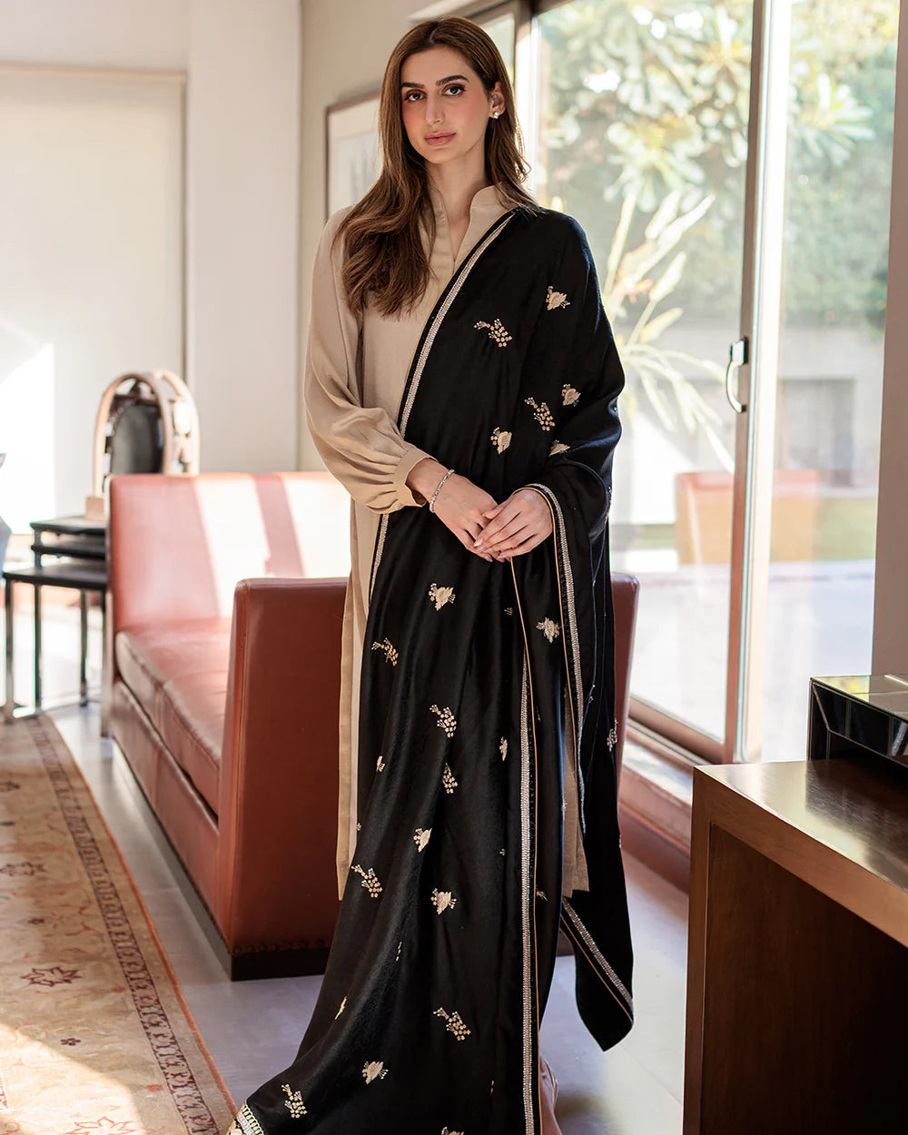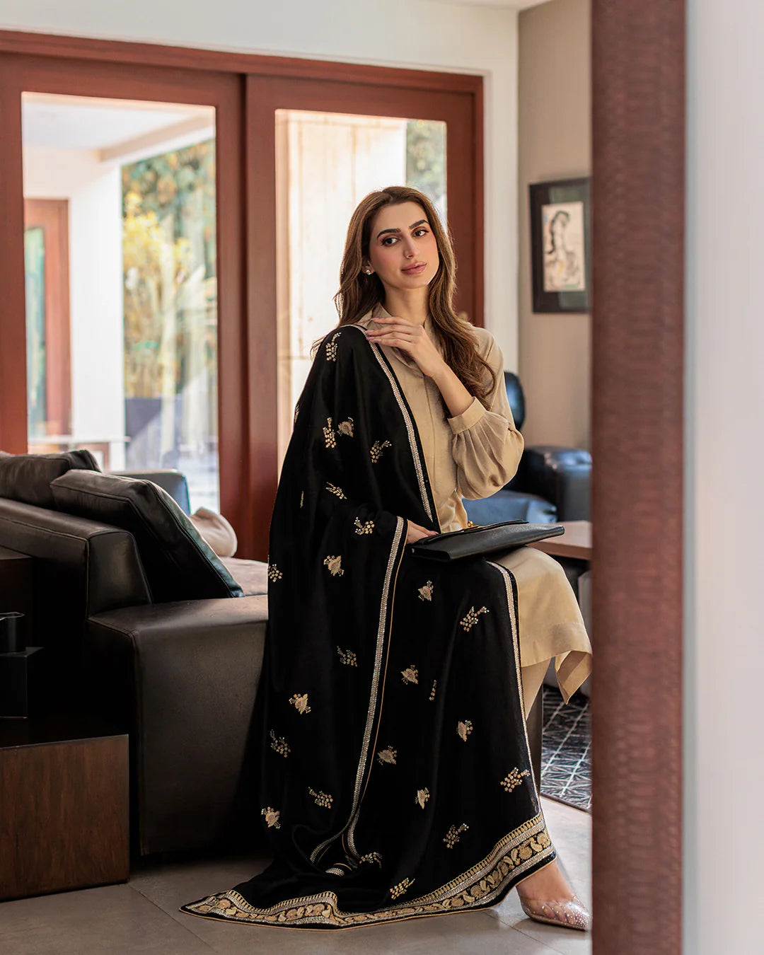 The shawl is intricately handworked with Resham and Swarovski embellishments.