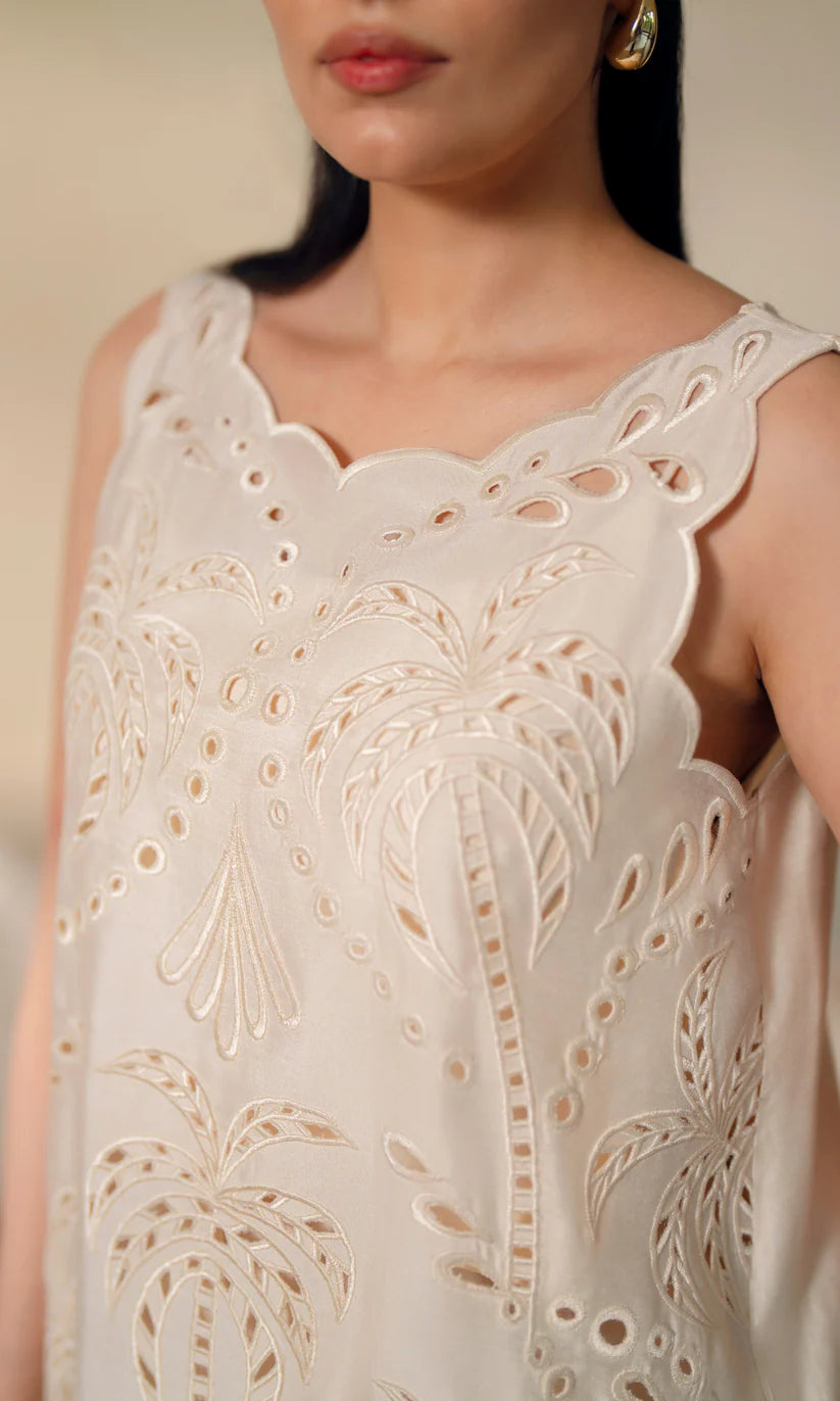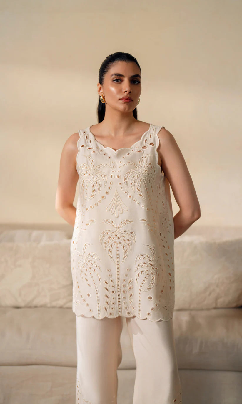 An Cotton Silk ensemble with intricate palm cutwork and scalloped edges. Paired with wide-leg trousers, the Cordoba Set brings together relaxed ease and refined detailing, making it a timeless summer statement.