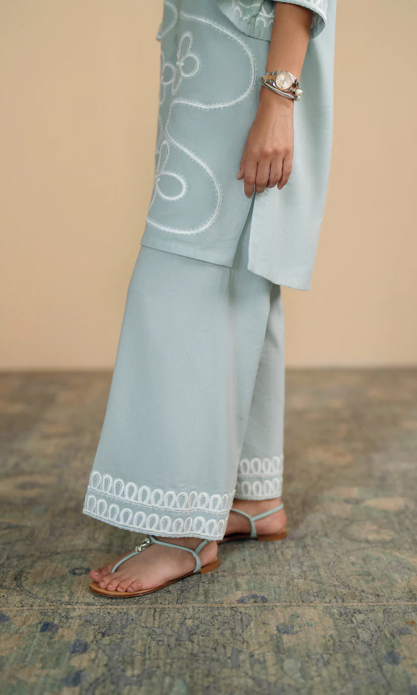 A soft aqua linen set adorned with delicate white floral embroidery and intricate lace-up detailing. The relaxed shirt silhouette with wide trousers exudes coastal sophistication, blending breezy lightness with modern structure.
