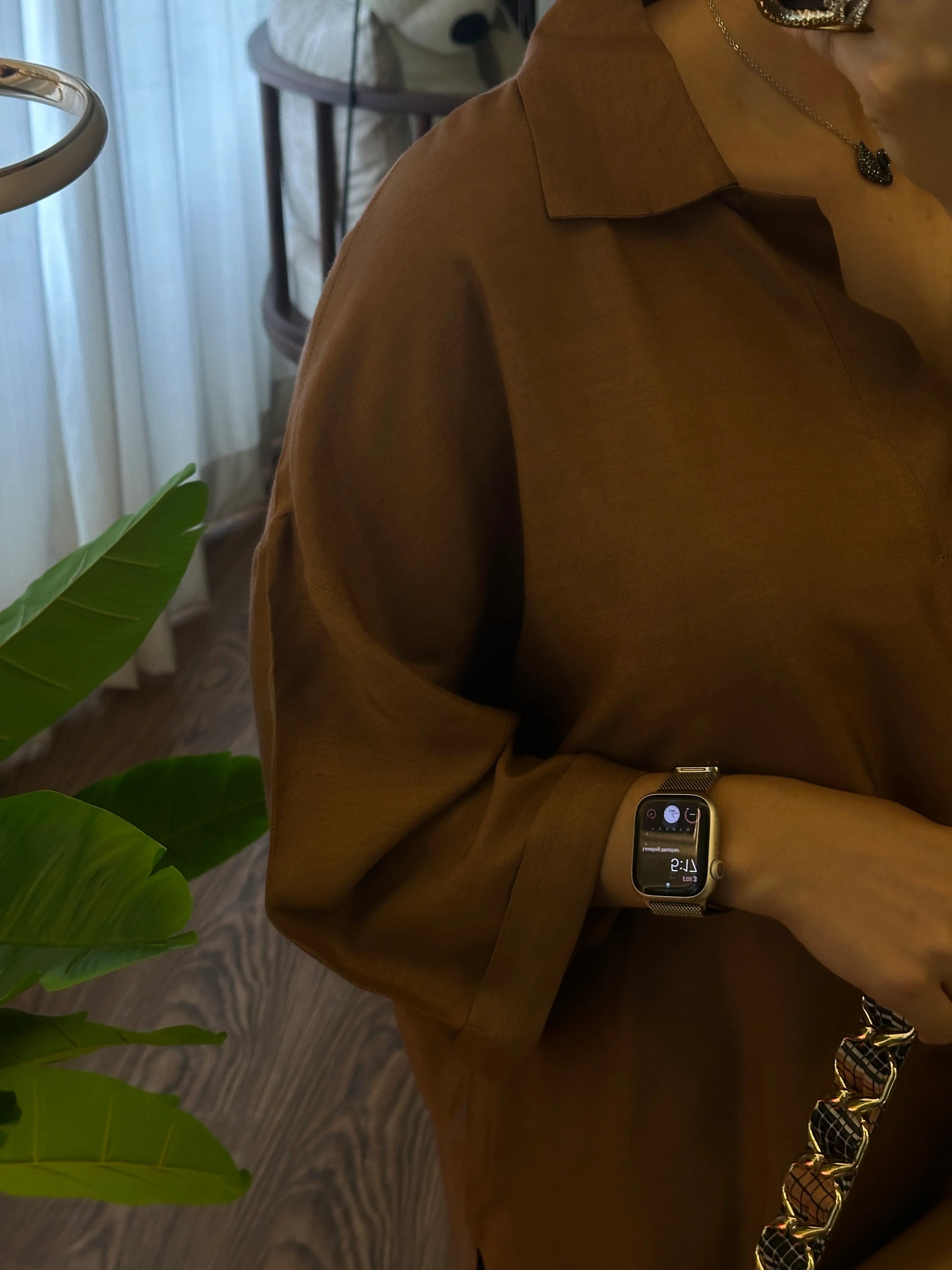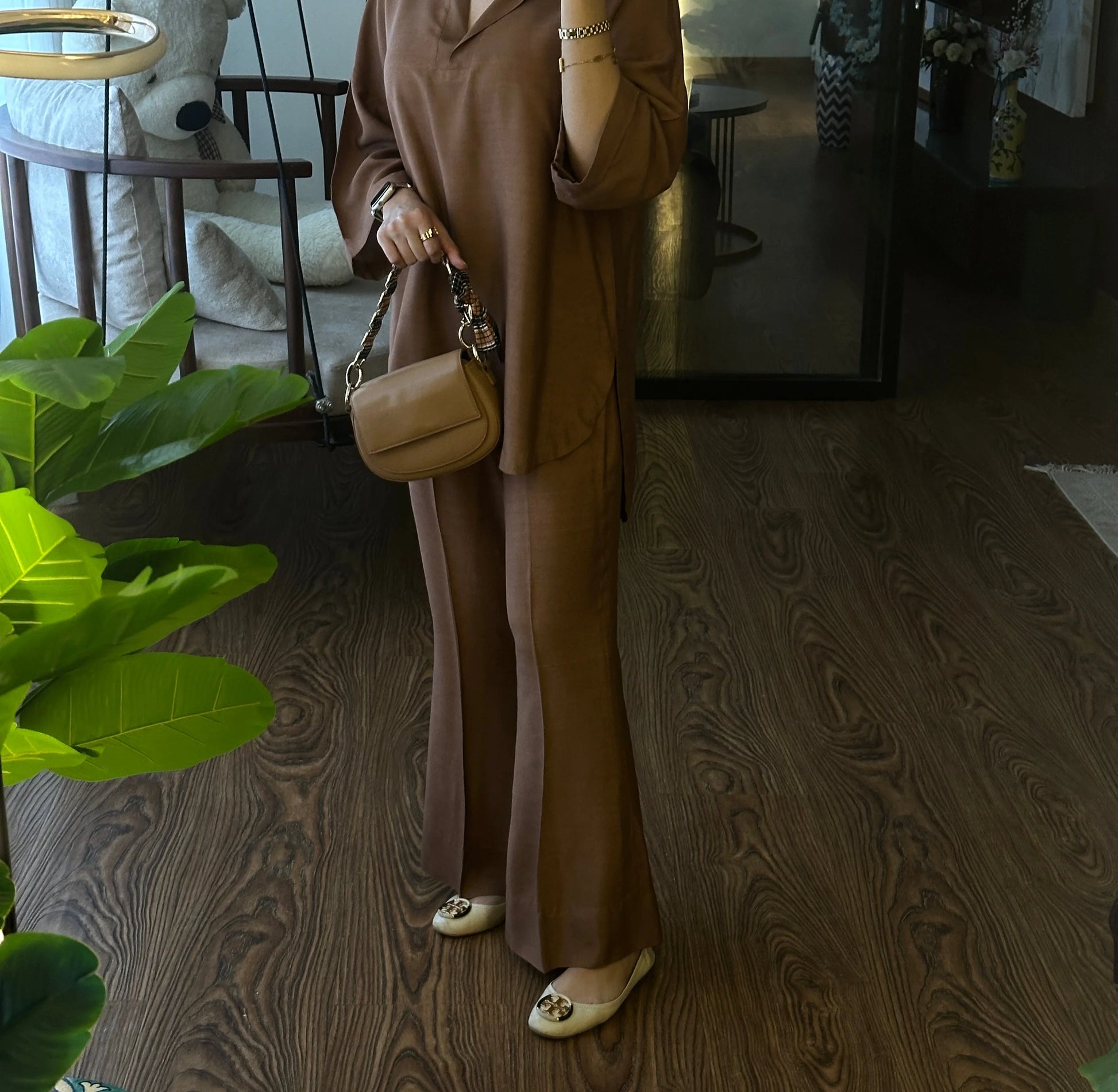 This outfit features a relaxed two-piece set in a warm caramel-brown shade. The top is a loose, long kameez-style shirt with a soft collar and half sleeves, paired with bell shaped pants in matching fabric.