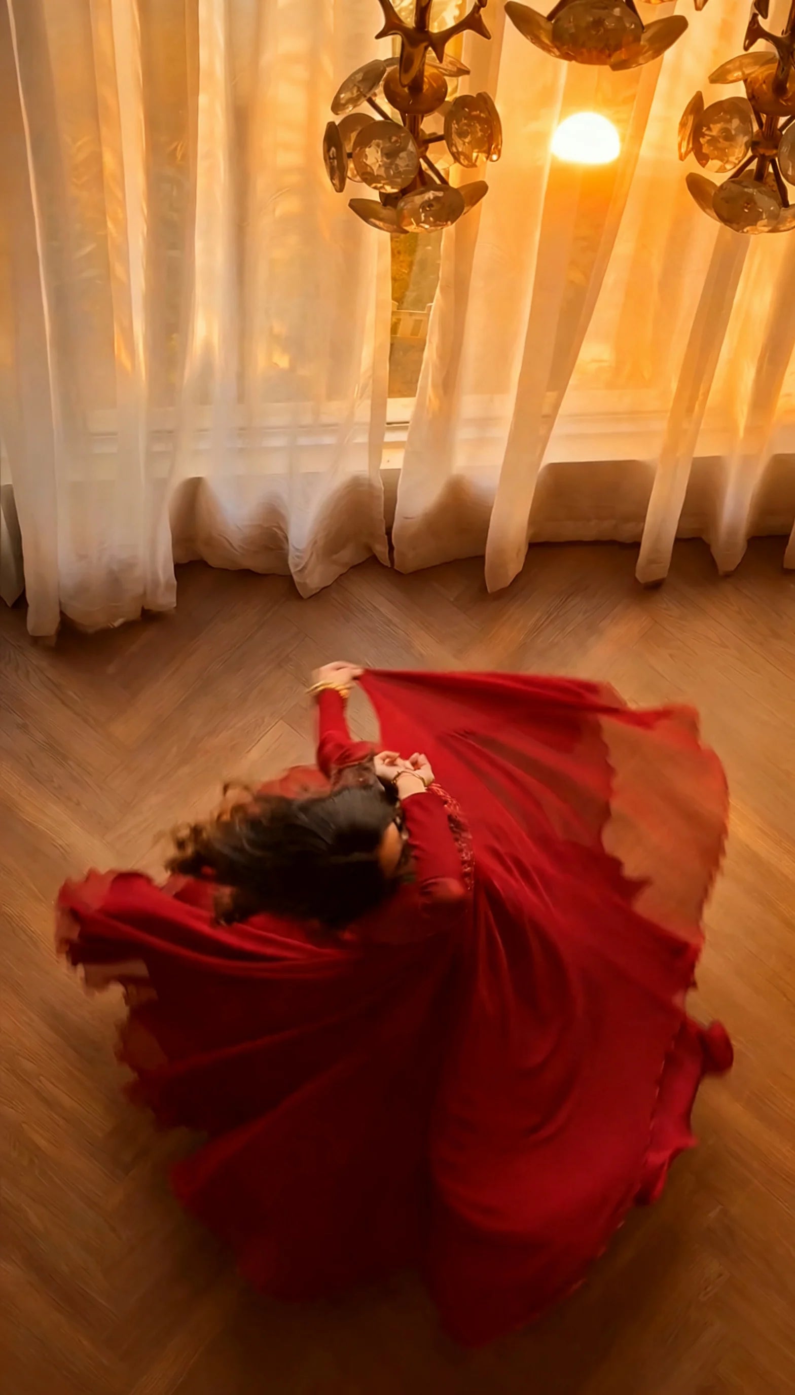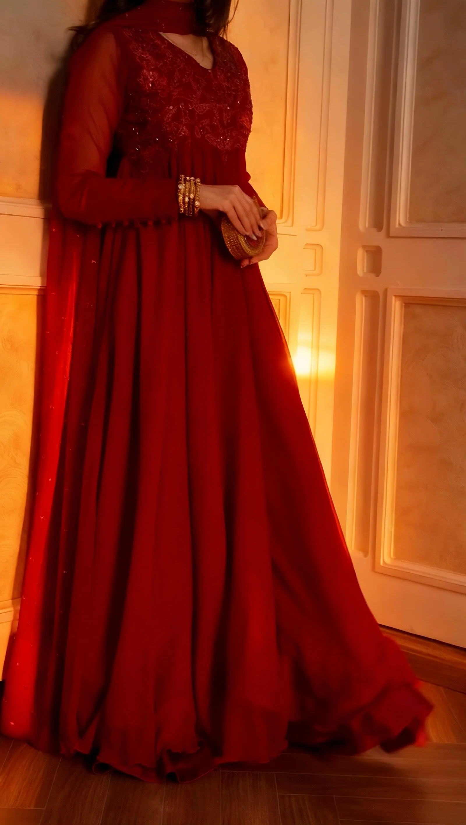A flowing deep red chiffon pishwaz crafted in a soft, fluid silhouette that moves effortlessly with every step. The bodice features intricate tonal embroidery, delicately placed to add texture and depth while maintaining a refined, understated elegance.