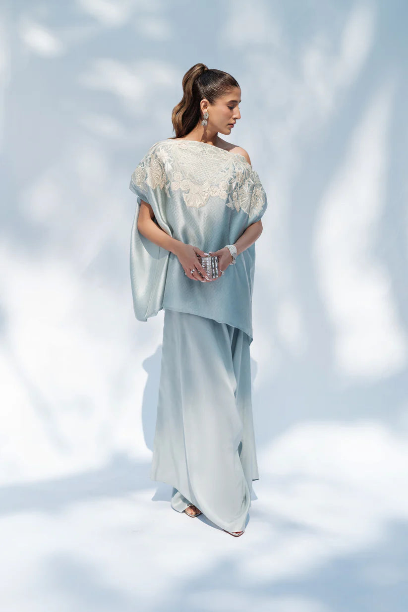A powder blue, textured Off-Shoulder ensemble featuring a fluid draped top with intricate beige embroidery and an asymmetric neckline. Diffrent embroiderey techniques have been used to create this emsemble. Paired with box pants for an effortless yet elevated look. Model Is 5'7 and wearing XS