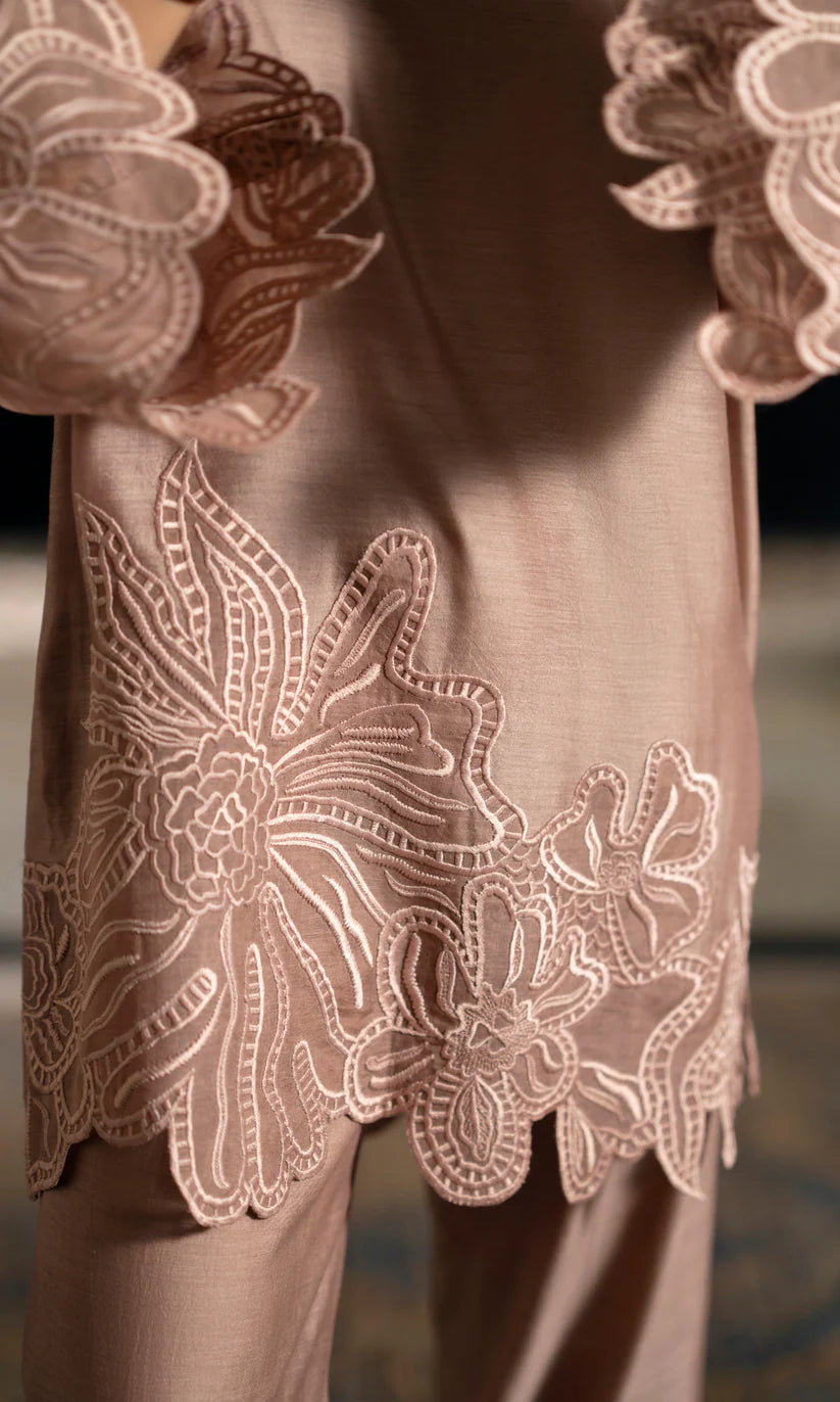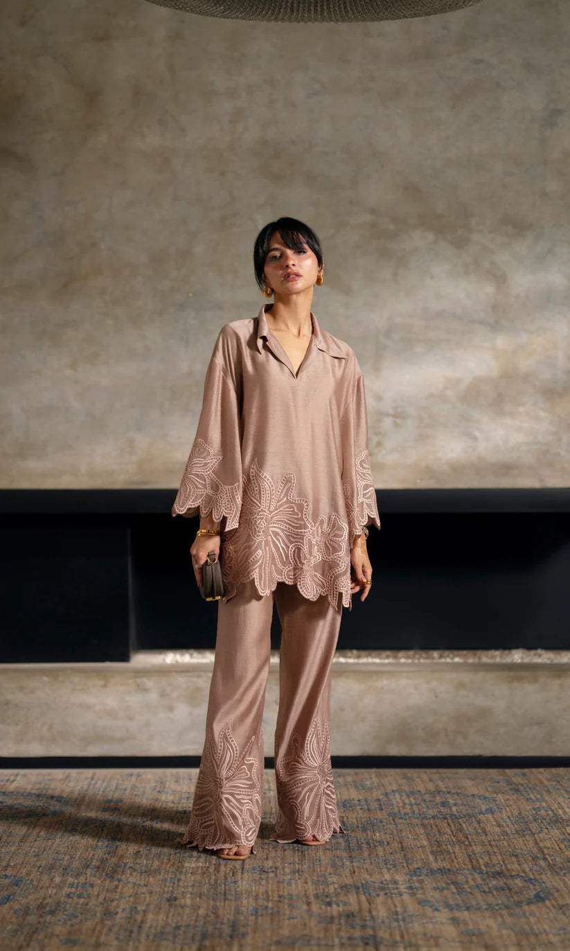 Crafted in a muted blush tone, this relaxed silhouette features oversized floral cutwork embroidery along the hem, sleeves, and trousers. The flowing structure and intricate detailing strike the perfect balance between ease and refinement.