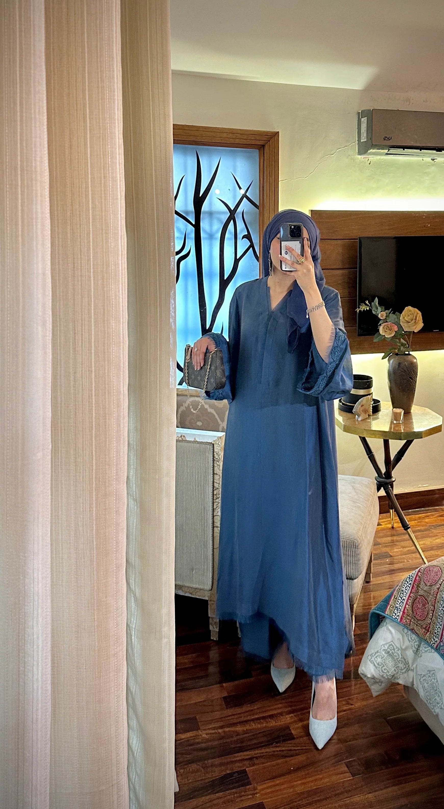 This article features a stunning blue long silk kameez with organza detailing on the neckline. Its paired with matching azar pants.