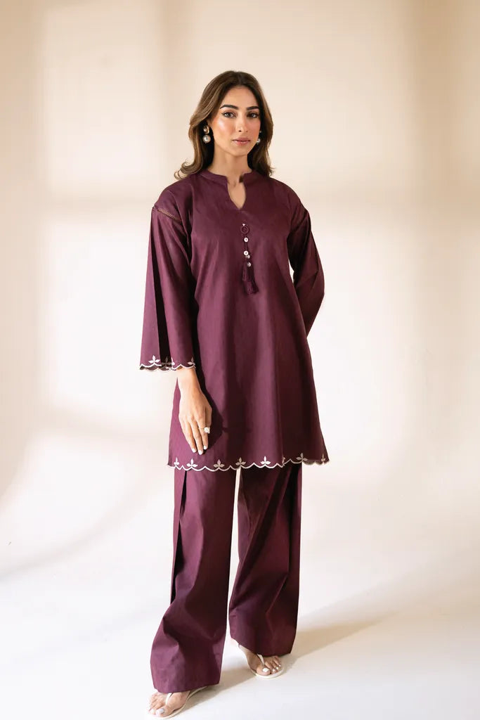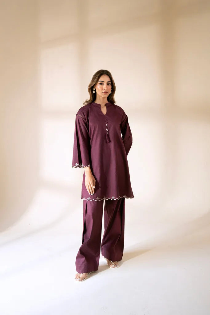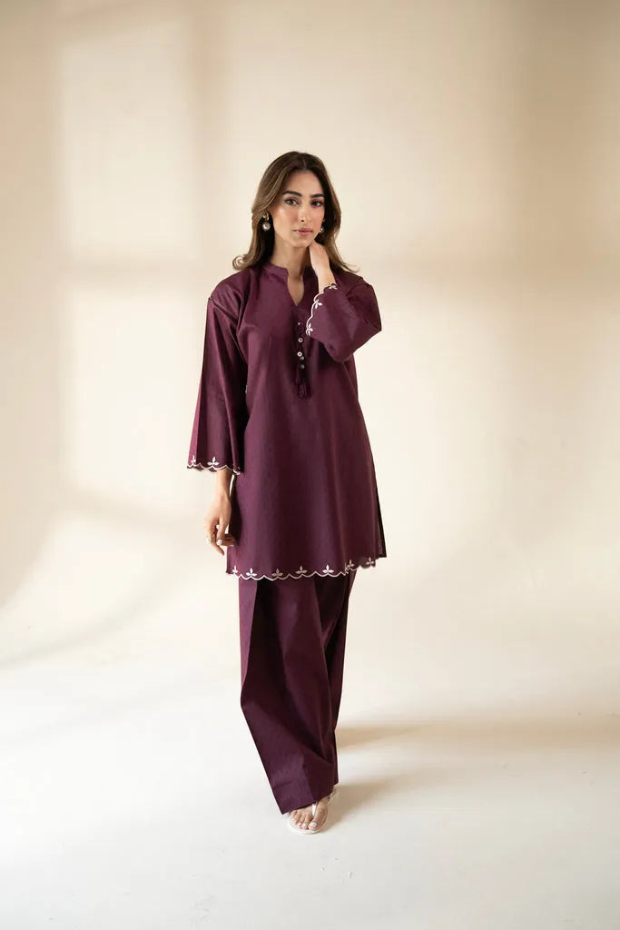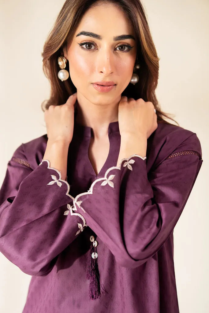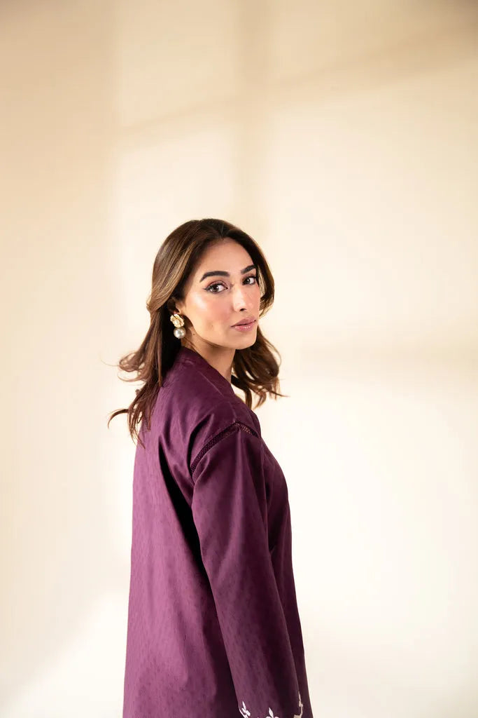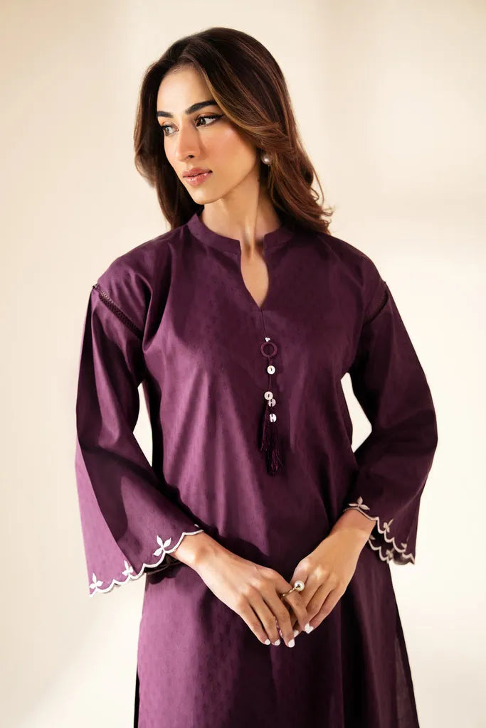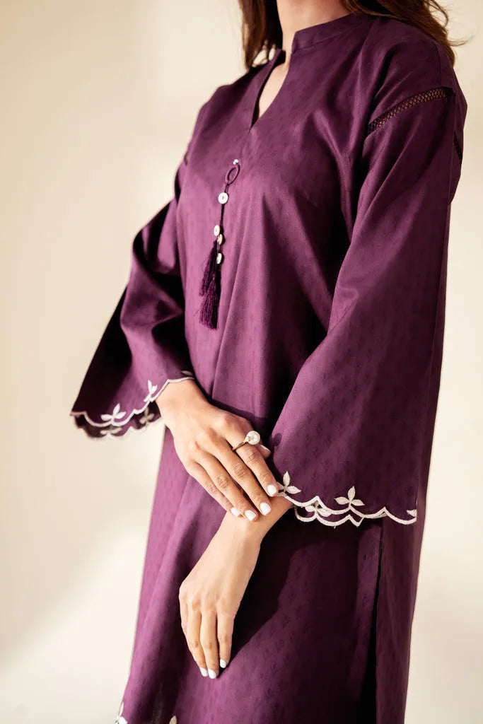 This short jacquard cotton shirt features a distinctive neckline with tassel ties, joined laces on the shoulder seam, and minimal embroidery on the sleeves and border. Paired with a farshi shalwar, it blends tradition with confidence — made for women who lead in every moment.