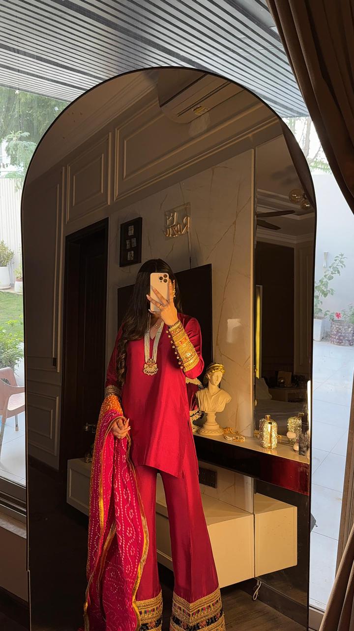 Completing the look is a vibrant chunri dupatta in shades of fuchsia and orange, finished with a gold kiran edging — a perfect blend of tradition and festivity. Ideal for mehndi, dholki, or intimate wedding celebrations, this ensemble celebrates colour, culture, and craft in one striking piece.