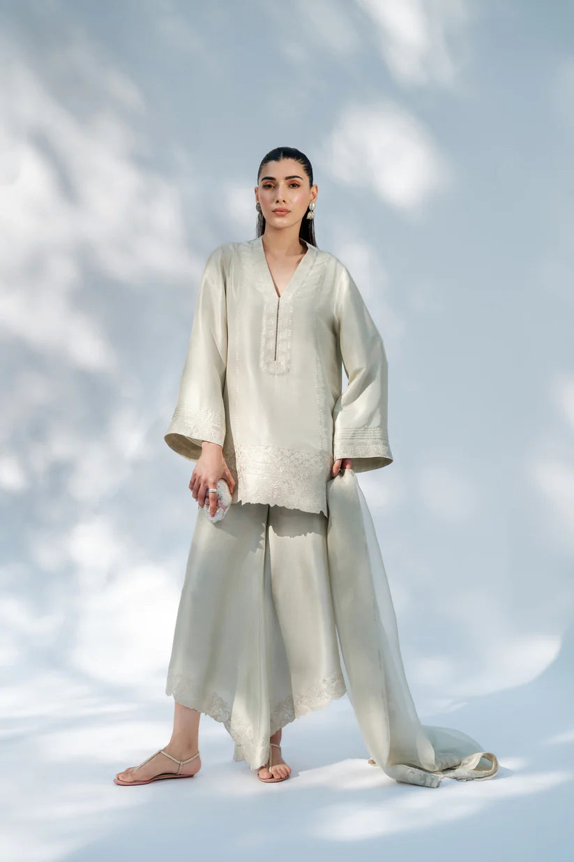 A serene pistachio pastel ensemble, crafted from luxurious fabric with a soft, flowing drape. The kurta features delicate embroidery along the hem, adding depth and texture to its minimal silhouette. The pants, cut in an elegant asymmetric shape, are adorned with intricate tonal embroidery along the edges, creating a graceful and fluid movement. The sheer organza dupatta is finished with finely embroidered borders.