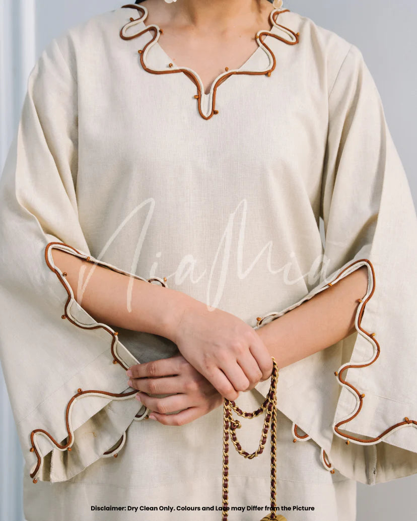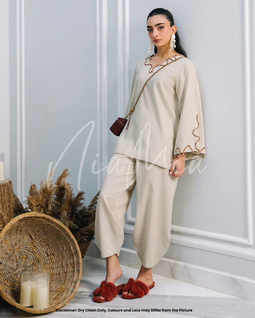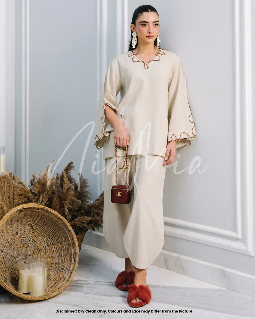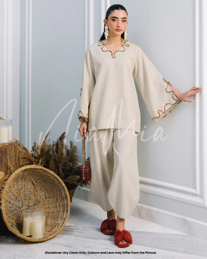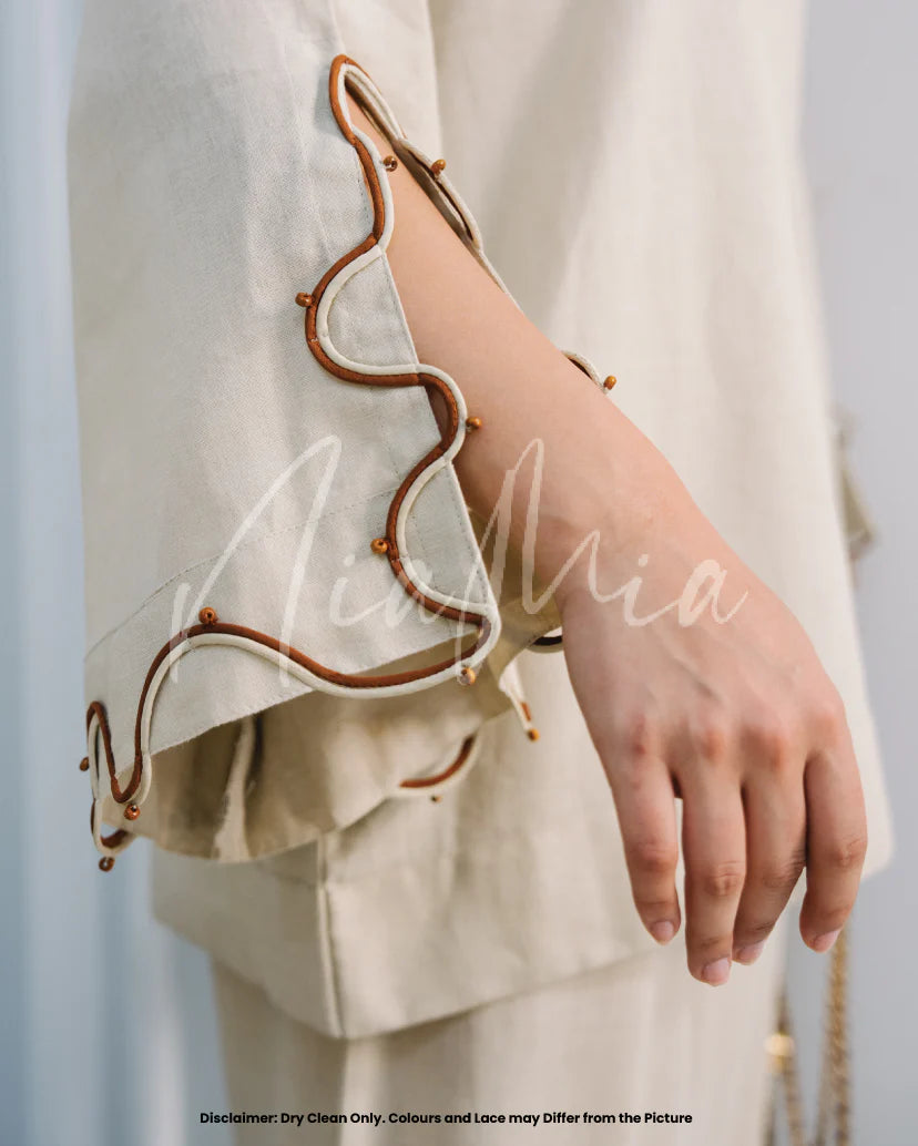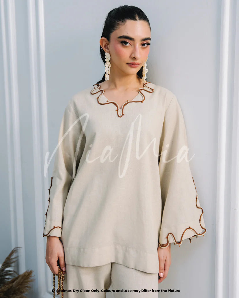 Crafted from soft linen in a timeless neutral hue, Tiramisu embodies effortless sophistication. Featuring NiaMia’s signature relaxed silhouette with delicate wave detailing along the neckline and sleeves, this co-ord is the perfect balance of comfort and understated elegance for the fall season.