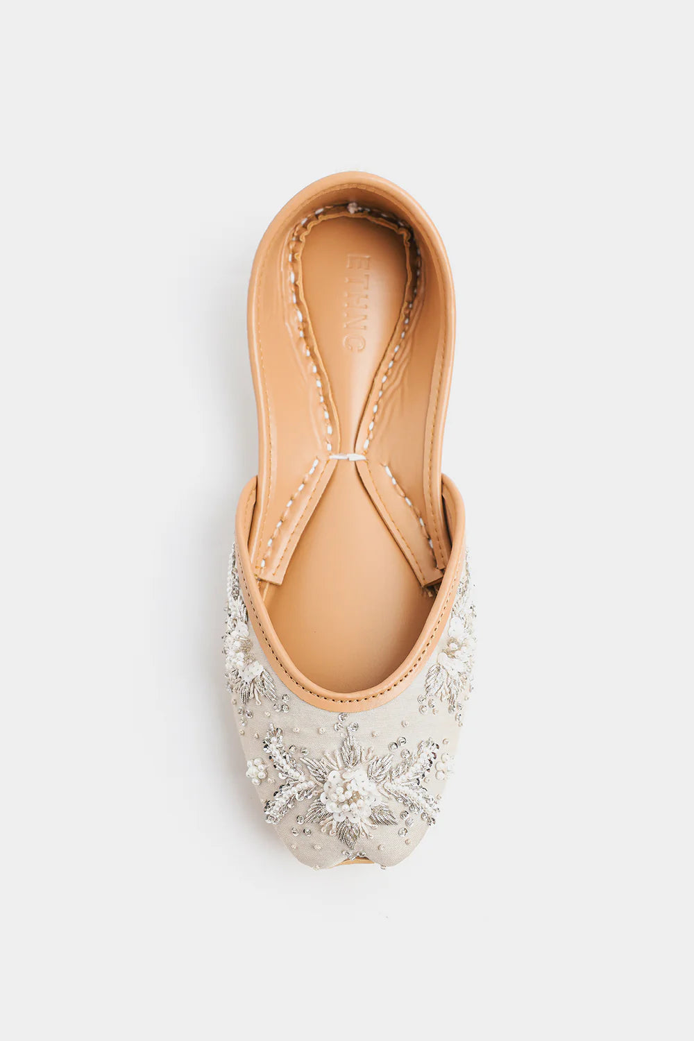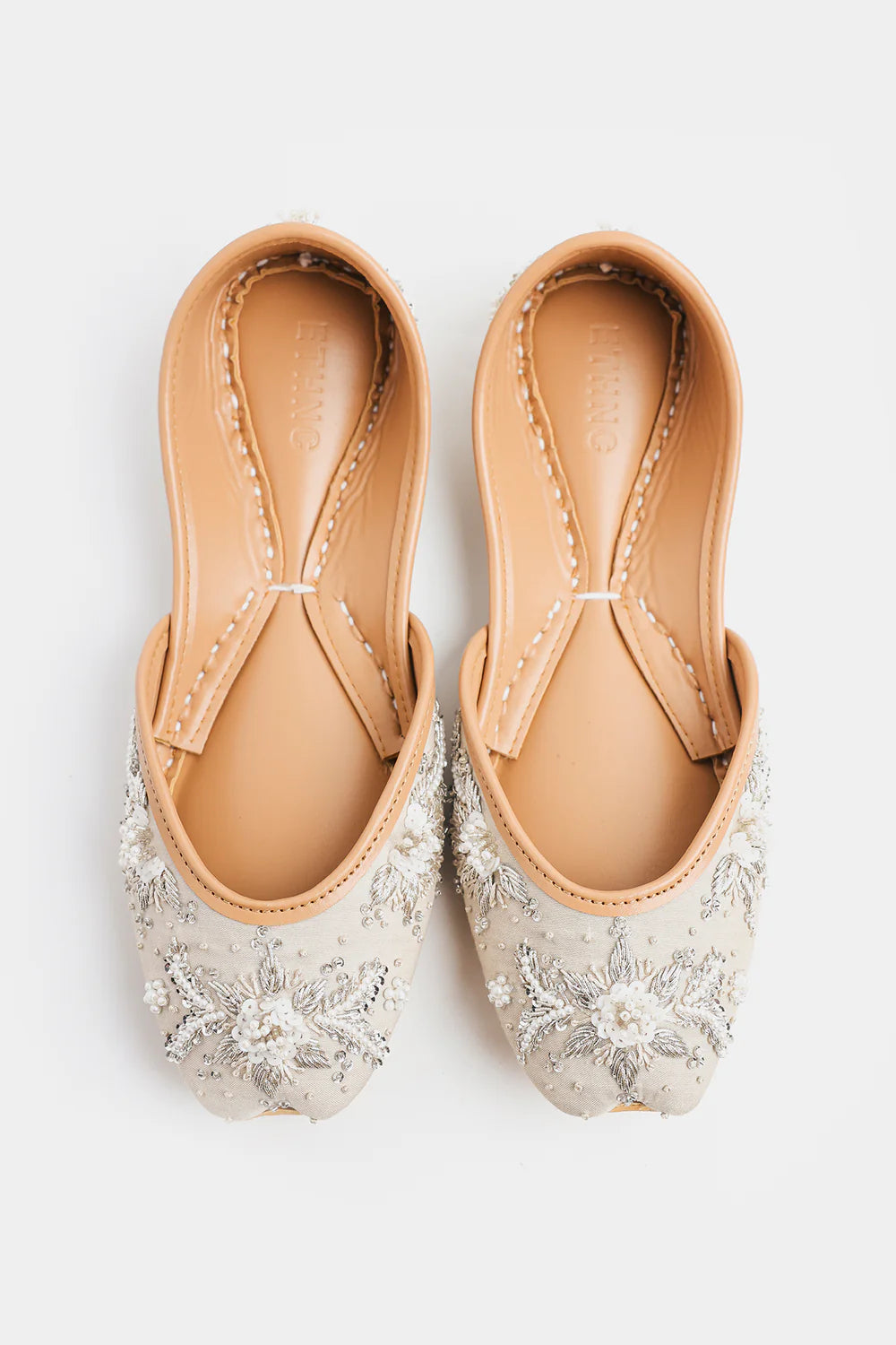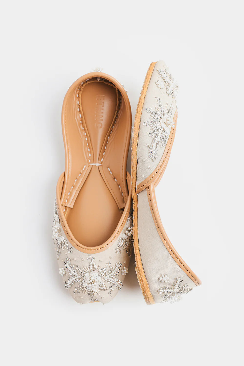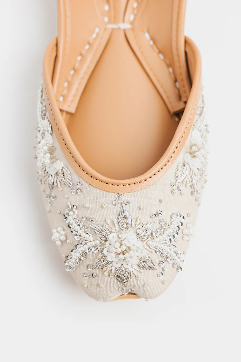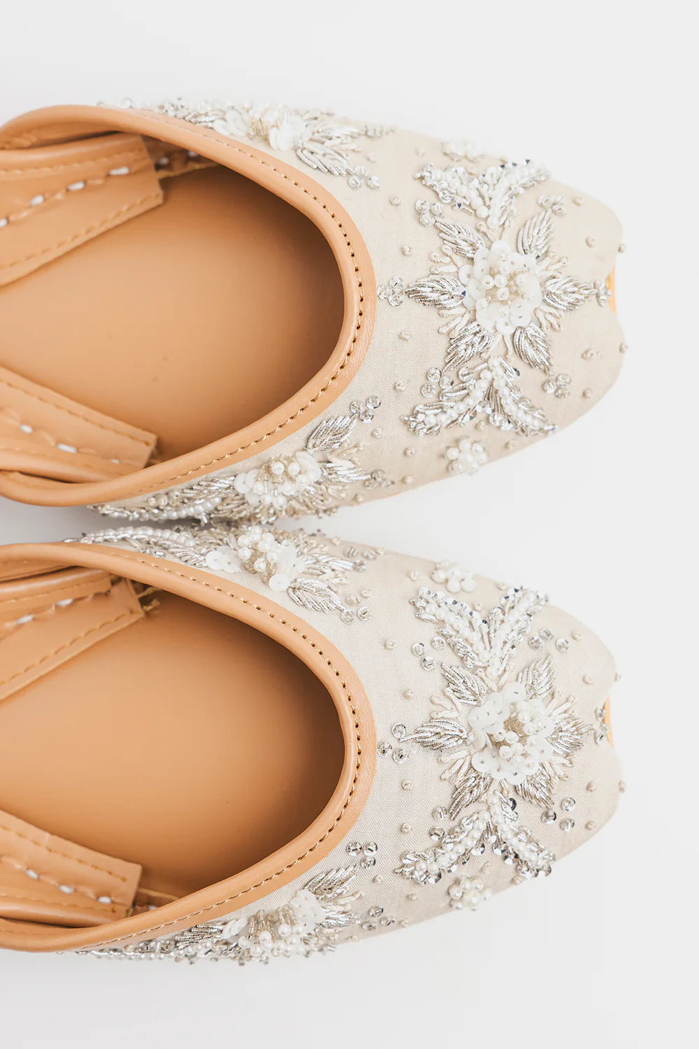 Step into delicate radiance with these breathtaking handcrafted Khussas. Set on a soft vanilla ice color fabric, the entire toe is transformed by elaborate silver and pearl embellishment. The design features stunning, dense silver threadwork and sequins that form intricate floral and starburst motifs, accented with luminous white pearls. The overall effect is one of ethereal luxury, perfect for bridal wear or any grand celebration. Finished with the comfortable, traditional tan leather sole and lining, these Khussas offer both supreme comfort and undeniable, gentle glamour.