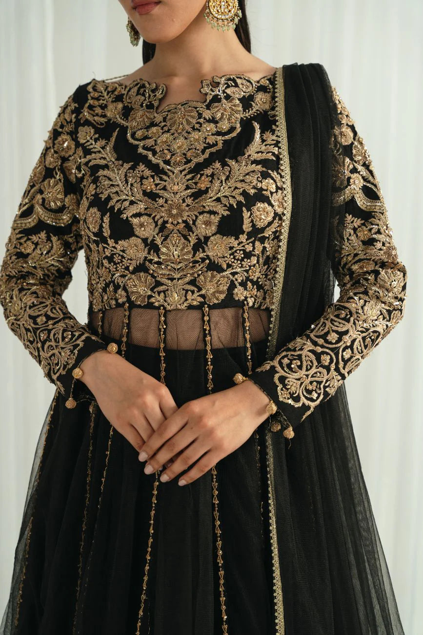Step into timeless elegance with this stunning long pishwas-style frock, designed with a luxurious Korean raw silk bodice and a beautifully flowing net layered panelled frock. The bodice and panels are adorned with exquisite adda work, featuring intricate handcrafted detailing that adds depth and richness to the outfit.