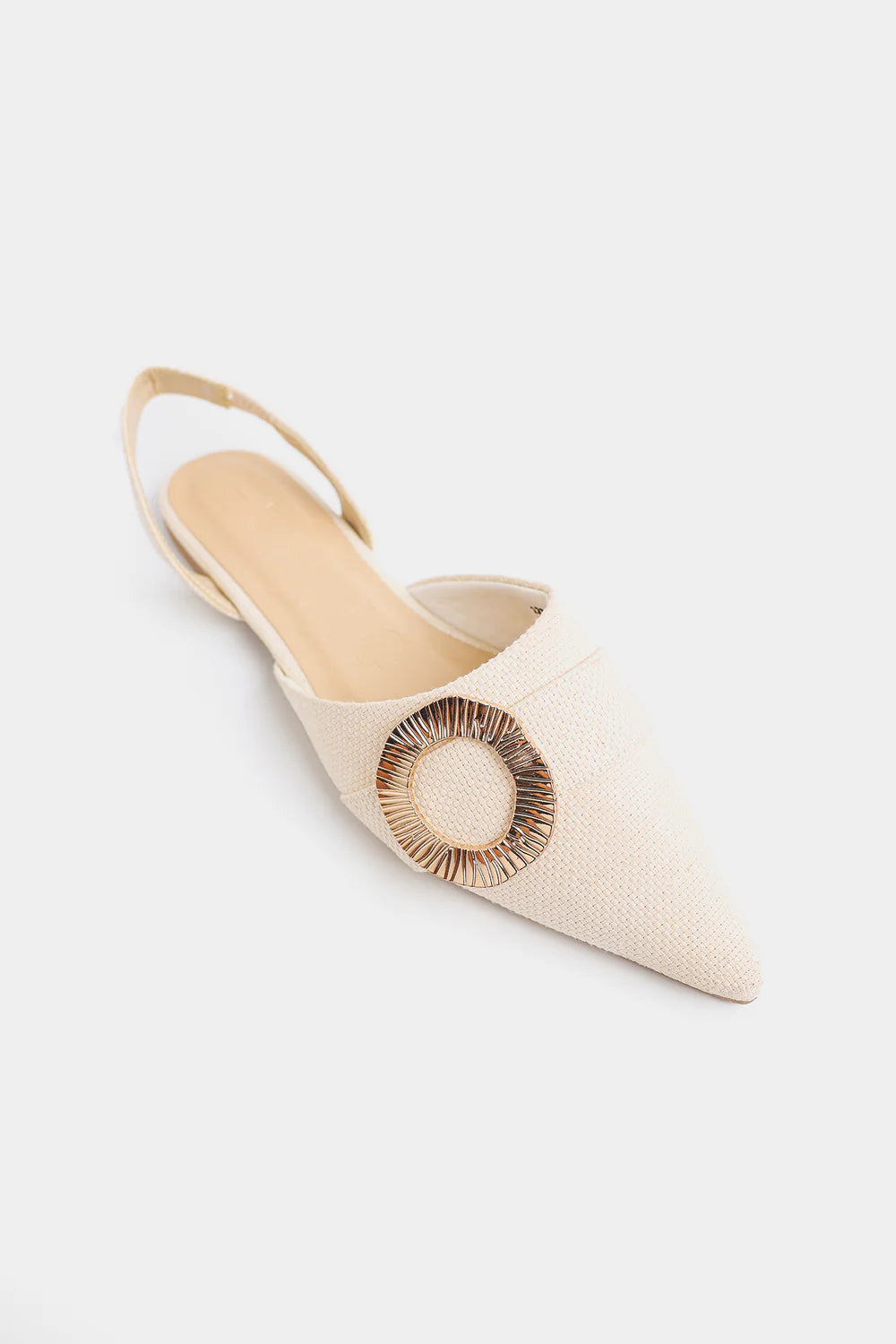 Embrace effortlessly chic comfort with these summery buckle slingback pumps. These flat slingbacks feature a contemporary square-pointed toe and are crafted from a textured beige fabric. The neutral tone is beautifully accented by a bold, oversized metallic gold circular buckle resting prominently on the vamp. With a comfortable slingback strap, these pumps are the perfect blend of casual texture and polished hardware, ideal for resort wear or elevated daytime looks.